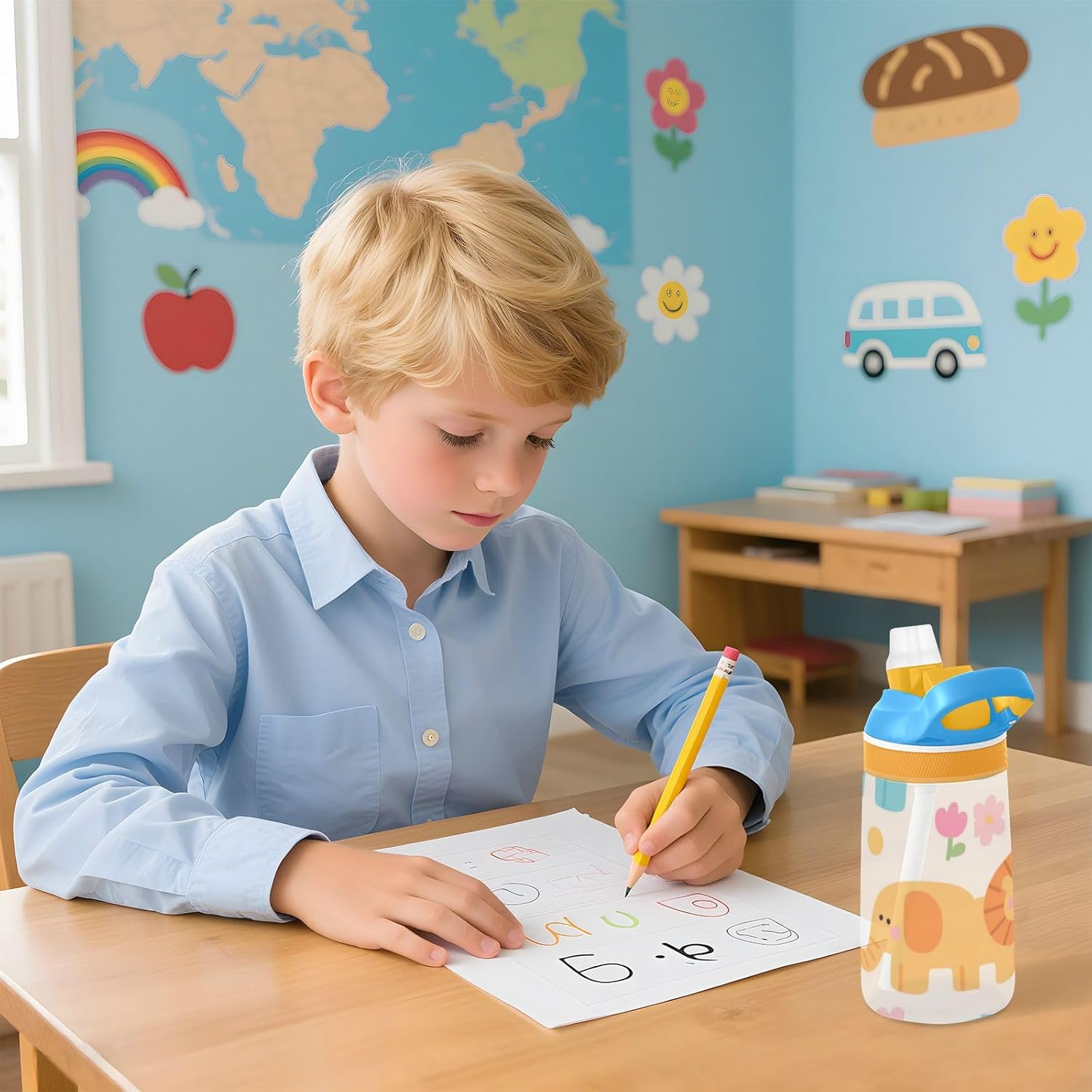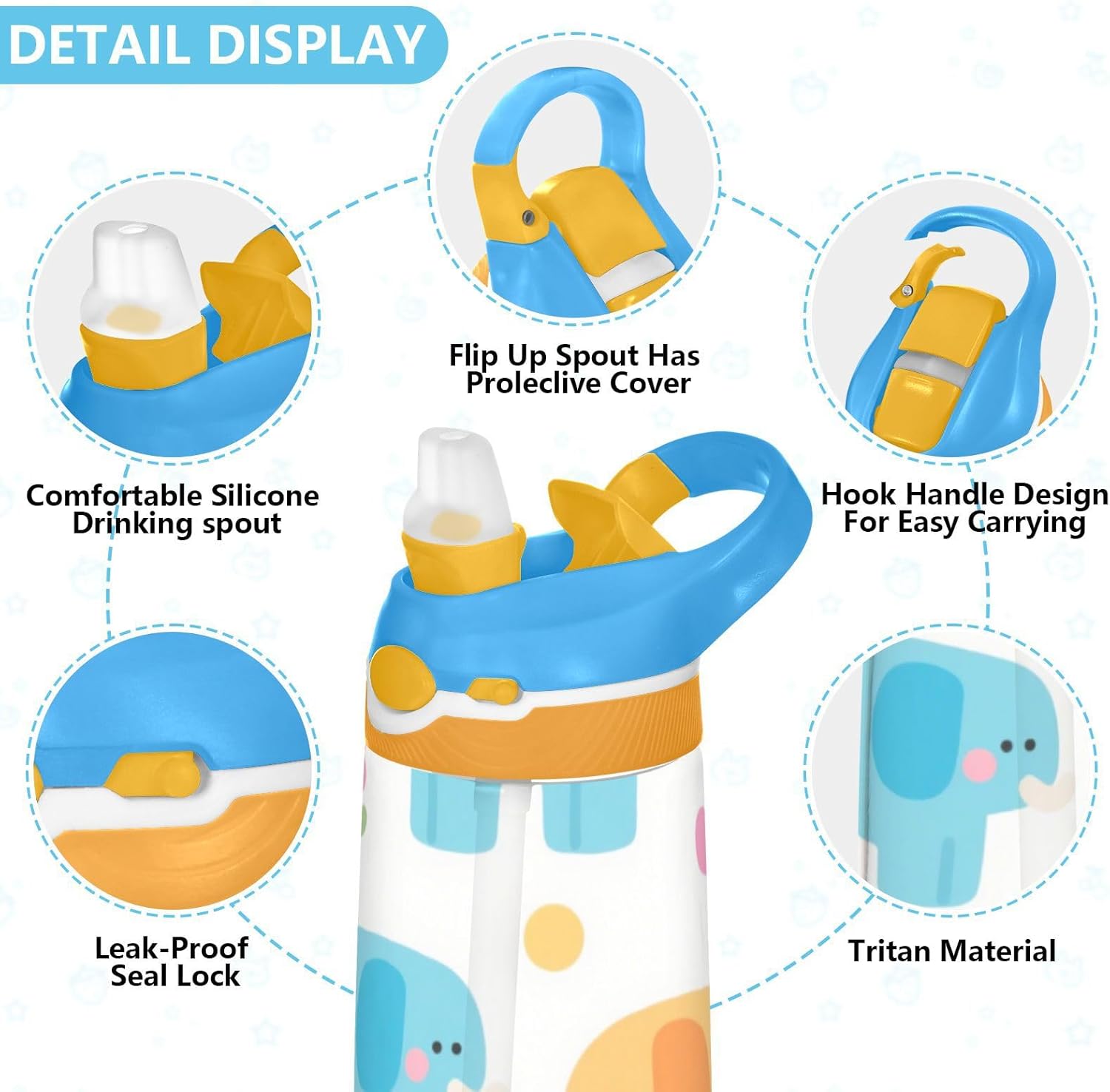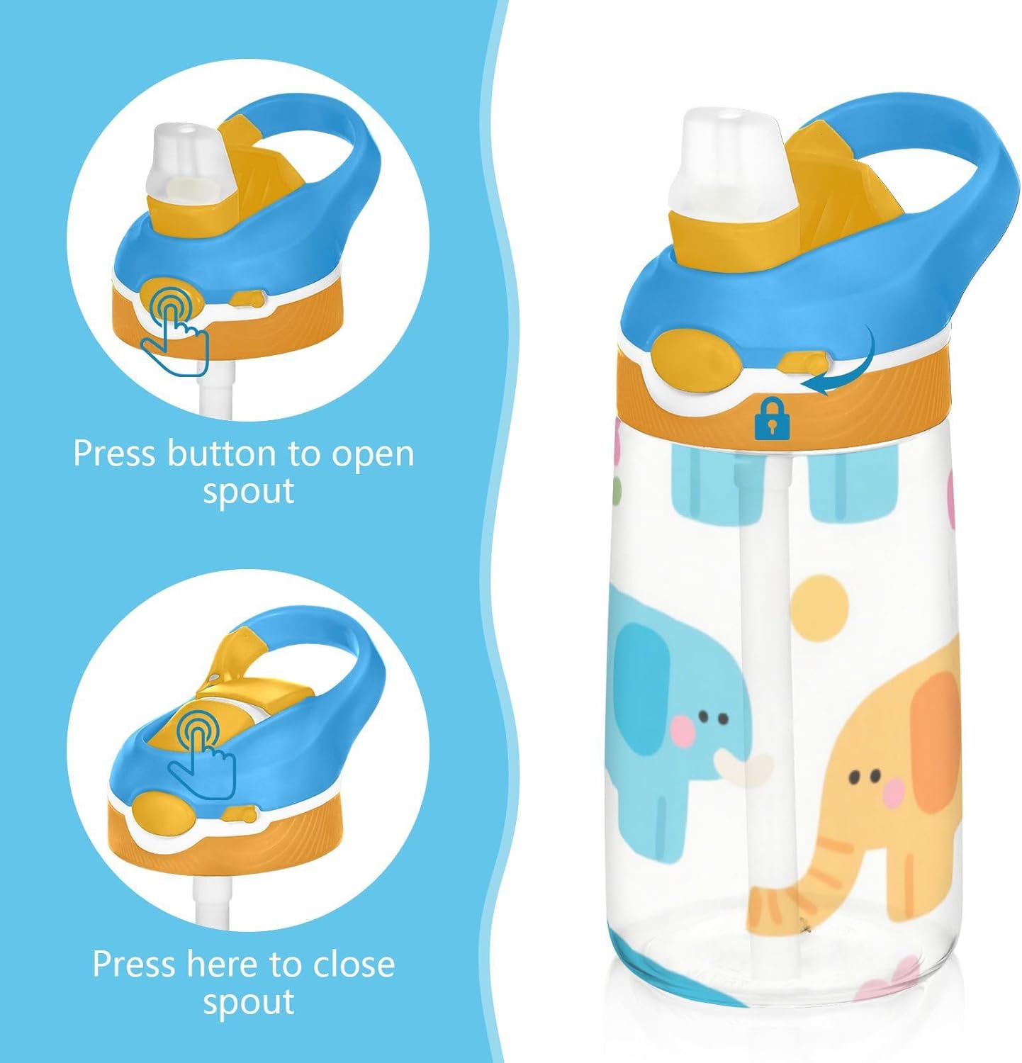 Materiali: questa borraccia da 480 ml (16 cm di lunghezza, 7,5 cm di larghezza) combina tritan e silicone alimentare. per la pratica sportiva o i giorni scolastici, è sicuro per i bambini da usare tutti i giorni. Non adatto a bambini di età inferiore ai 3 anni! Design portatile: l'ampio manico è facile da impugnare per i bambini e il gancio del coperchio consente di attaccare la bottiglia d'acqua agli zaini. Niente più bottiglie perse durante le gite sul campo o le attività dopo la scuola. Funzionamento amichevole: il becco d'anatra si adatta bene, con una copertura antipolvere. L'interruttore a pulsante della borraccia per bambini consente l'uso con una sola mano, in modo che i bambini possano idratarsi senza mettere giù i loro giocattoli o attrezzi sportivi. Blocco di sicurezza: il blocco del pulsante impedisce lo scoppio accidentale del becco d'anatra. Previene le perdite quando viene gettato nello zaino, mantenendo asciutti snack e compiti. Pulizia semplice: le parti completamente rimovibili evitano l'accumulo di sporco. Pulire con detergente neutro e acqua calda: facile per i genitori mantenere pulita la borraccia sportiva per l'uso quotidiano.
