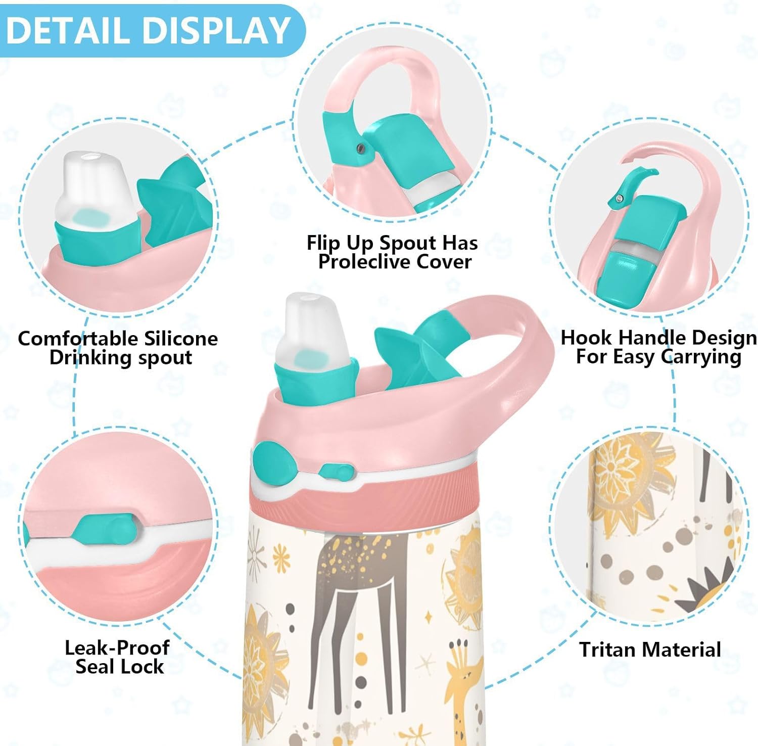 Materiale di sicurezza: il corpo in Tritan e il beccuccio in silicone alimentare garantiscono durata e sicurezza. Contiene 480 ml di acqua, perfetto per l'idratazione quotidiana. Non adatto a bambini di età inferiore ai 3 anni Design portatile: l'ampio manico e il gancio del coperchio rendono la bottiglia d'acqua facile da trasportare. I bambini possono appenderlo alle loro borse, evitando il fastidio di farla cadere durante la ricreazione o i viaggi in autobus. Funzionamento amichevole: il becco d'anatra si adatta bene, con una copertura antipolvere. L'interruttore a pulsante delle bottiglie d'acqua sportive consente l'uso con una sola mano, in modo che i bambini possano idratarsi senza mettere giù i loro giocattoli o attrezzi sportivi. Blocco per evitare fuoriuscite: il pulsante di blocco della borraccia sportiva impedisce al becco d'anatra di fuoriuscire per errore. Niente più fuoriuscite negli zaini, mantenendo il pranzo e i libri asciutti. Facile pulizia: tutte le parti della borraccia per bambini sono rimovibili per una pulizia accurata senza sporcare. Usa un detergente neutro e acqua calda: semplice per i genitori mantenere la pulizia per l'uso quotidiano.