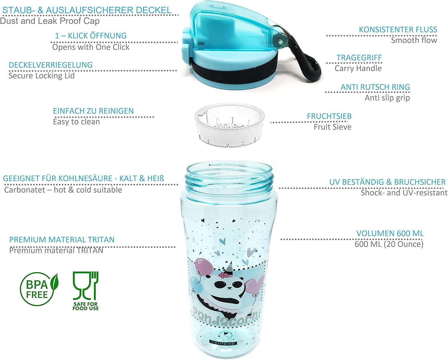 La borraccia per bambini da 600 ml viene spesso utilizzata come borraccia, borraccia sportiva, borraccia per l'asilo, borraccia per la scuola o tazza per bambini. La borraccia a tenuta stagna è realizzata in Tritan, privo di sostanze nocive e BPA, insapore, adatto agli alimenti, resistente al calore, leggero, infrangibile e adatto per bevande fredde e calde. Un'ampia apertura della borraccia per bambini consente un rapido riempimento e una facile pulizia. Si consiglia la pulizia a mano o con un programma in lavastoviglie a bassa temperatura (45 gradi). Il blocco di sicurezza impedisce l'apertura accidentale della borraccia. Borraccia con filtro: perfeziona le tue bevande con frutta o foglie di tè utilizzando l'inserto colino in dotazione. Con dimensioni: 24 cm di altezza e diametro: 6 cm, questa borraccia intelligente è ideale per il trasporto e si adatta a qualsiasi zaino