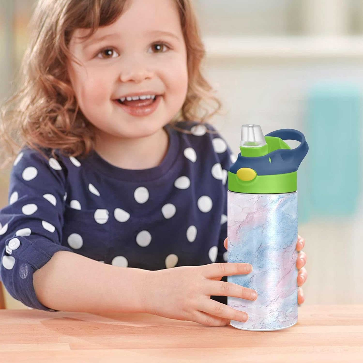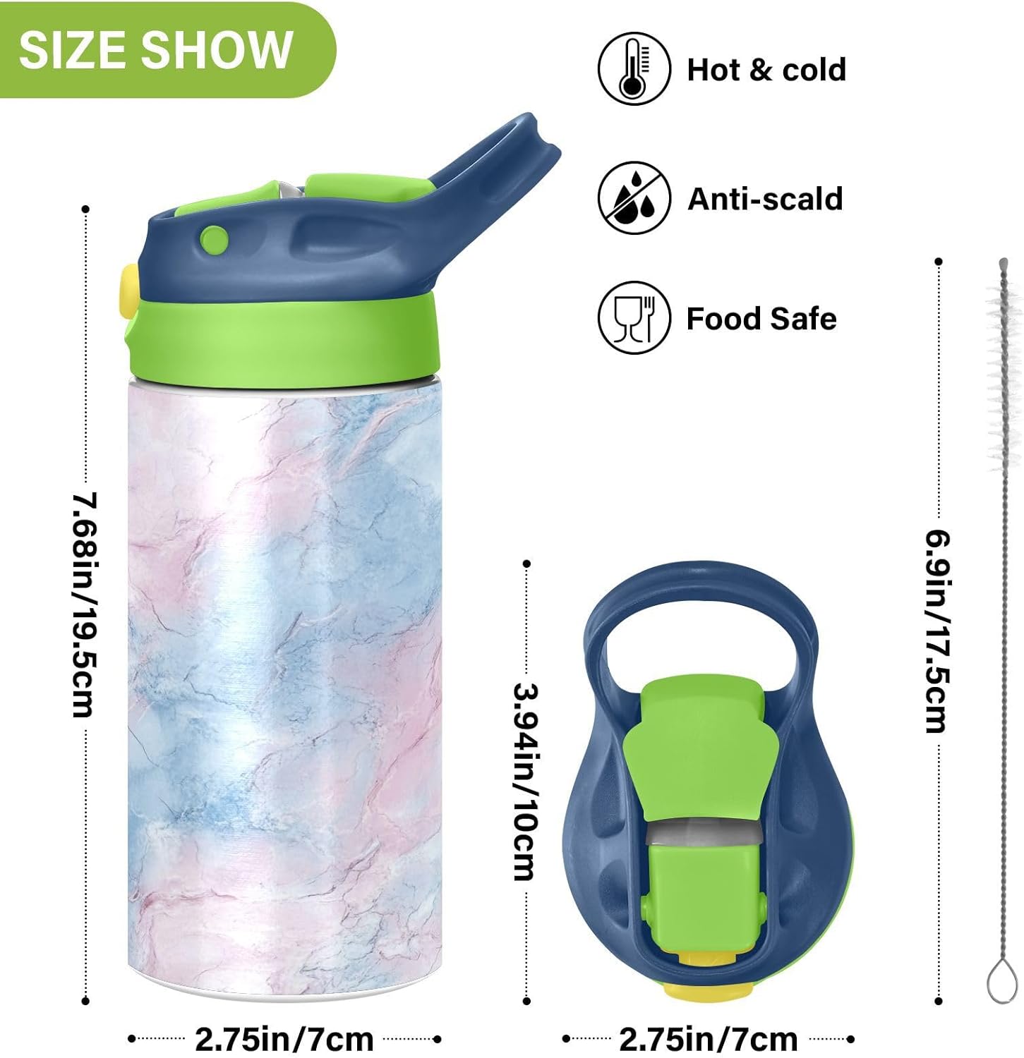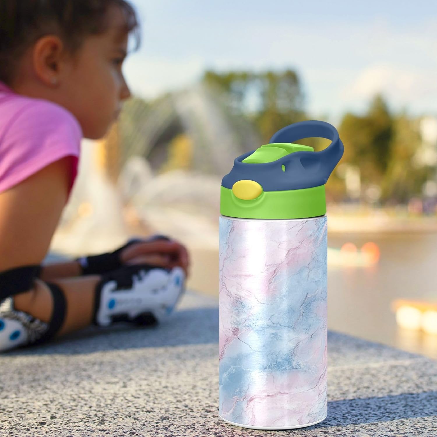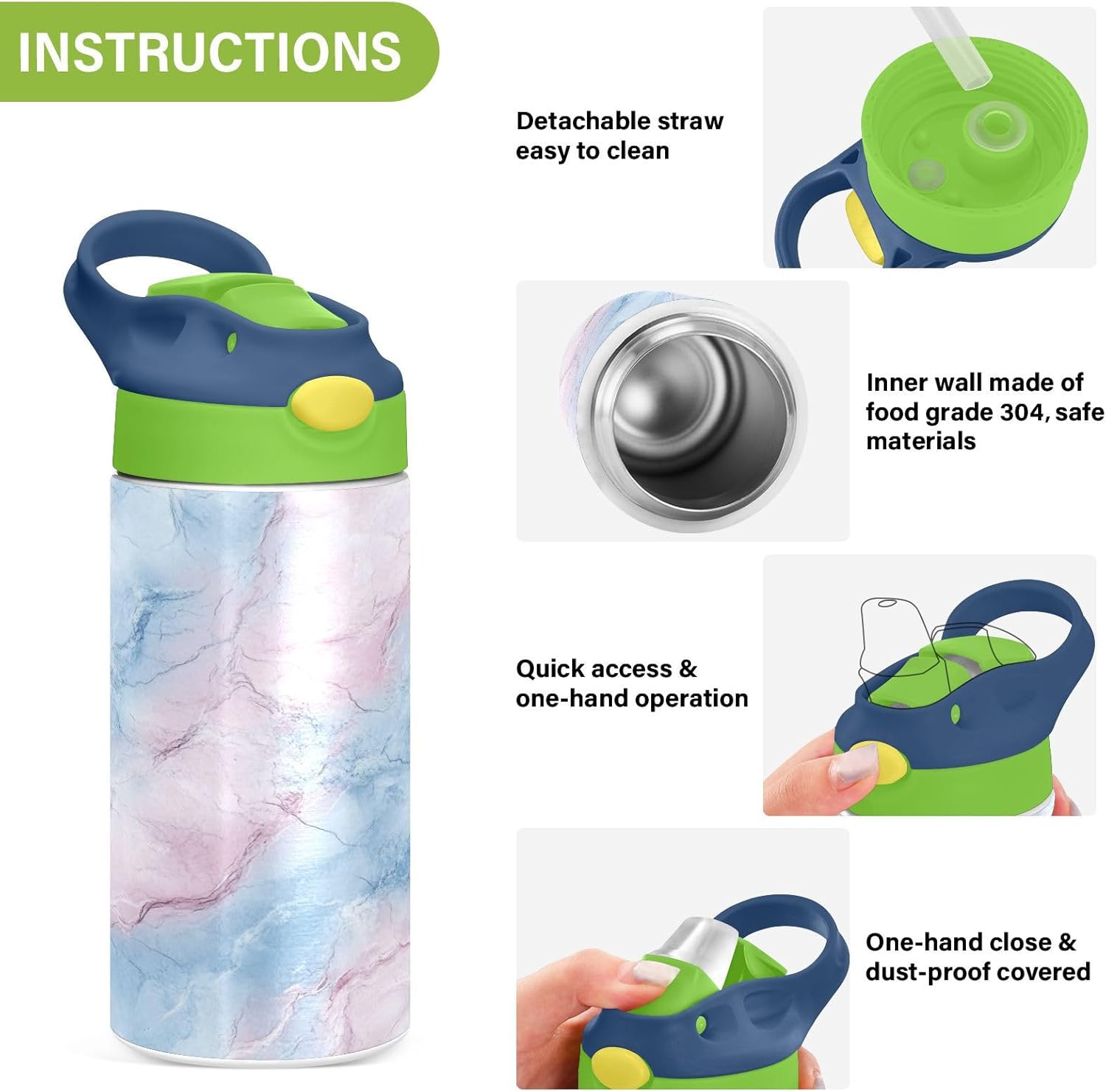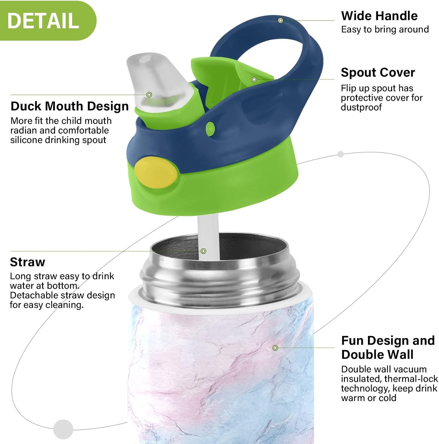 Materiali: questa borraccia per bambini da 350 ml (19,5 cm di lunghezza, 7 cm di larghezza) combina tritan e silicone alimentare. per la pratica sportiva o i giorni scolastici, è sicuro per i bambini da usare tutti i giorni. Non adatto a bambini di età inferiore ai 3 anni! Comoda da trasportare: con un ampio manico per mani piccole e un gancio sul coperchio, la borraccia per bambini può essere appesa agli zaini. I bambini non faranno fatica a trasportarla durante le gite sul campo o le attività dopo la scuola. Uso senza problemi con una sola mano: il design a becco d'anatra si adatta alle bocche dei bambini, con una copertura antipolvere. L'interruttore a pulsante della borraccia per bambini è facile da usare con 1 mano, anche quando giocano o corrono. Blocco per evitare fuoriuscite: il pulsante di blocco della borraccia sportiva impedisce al becco d'anatra di fuoriuscire per errore. Niente più fuoriuscite negli zaini, mantenendo il pranzo e i libri asciutti. Pulizia semplice: le parti completamente rimovibili evitano l'accumulo di sporco. Pulire con detergente neutro e acqua calda: facile per i genitori mantenere le bottiglie d'acqua sportive pulite per l'uso quotidiano.
