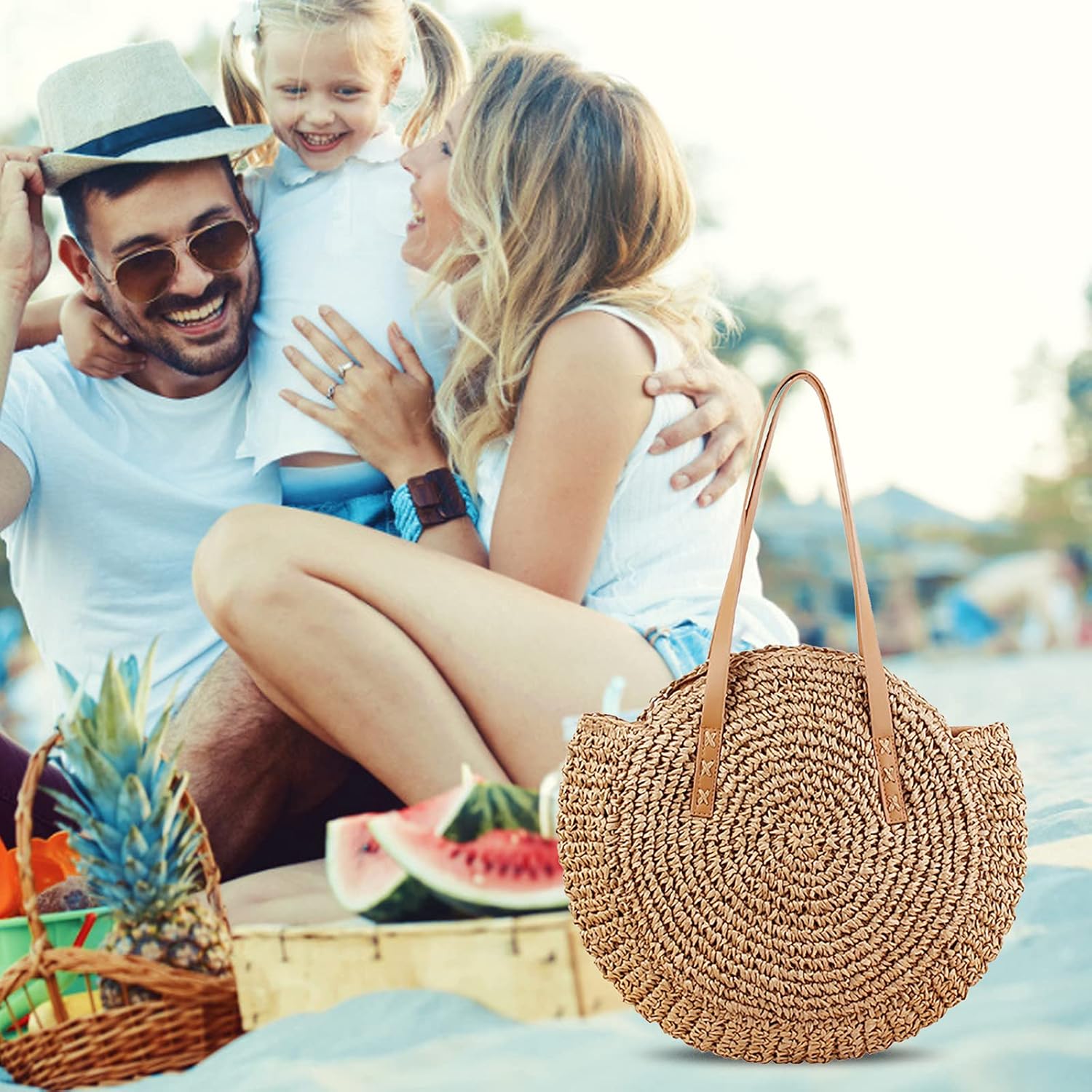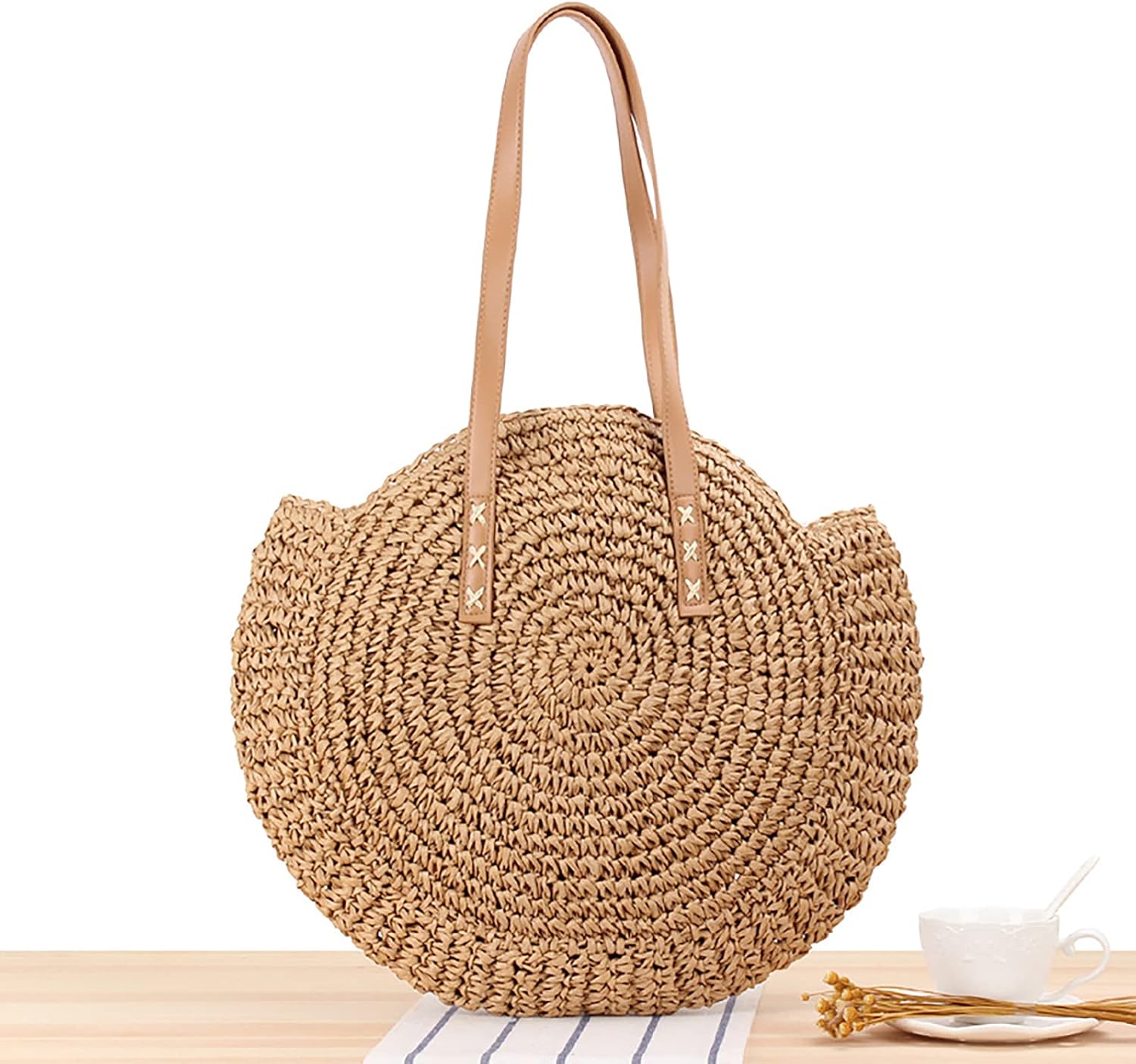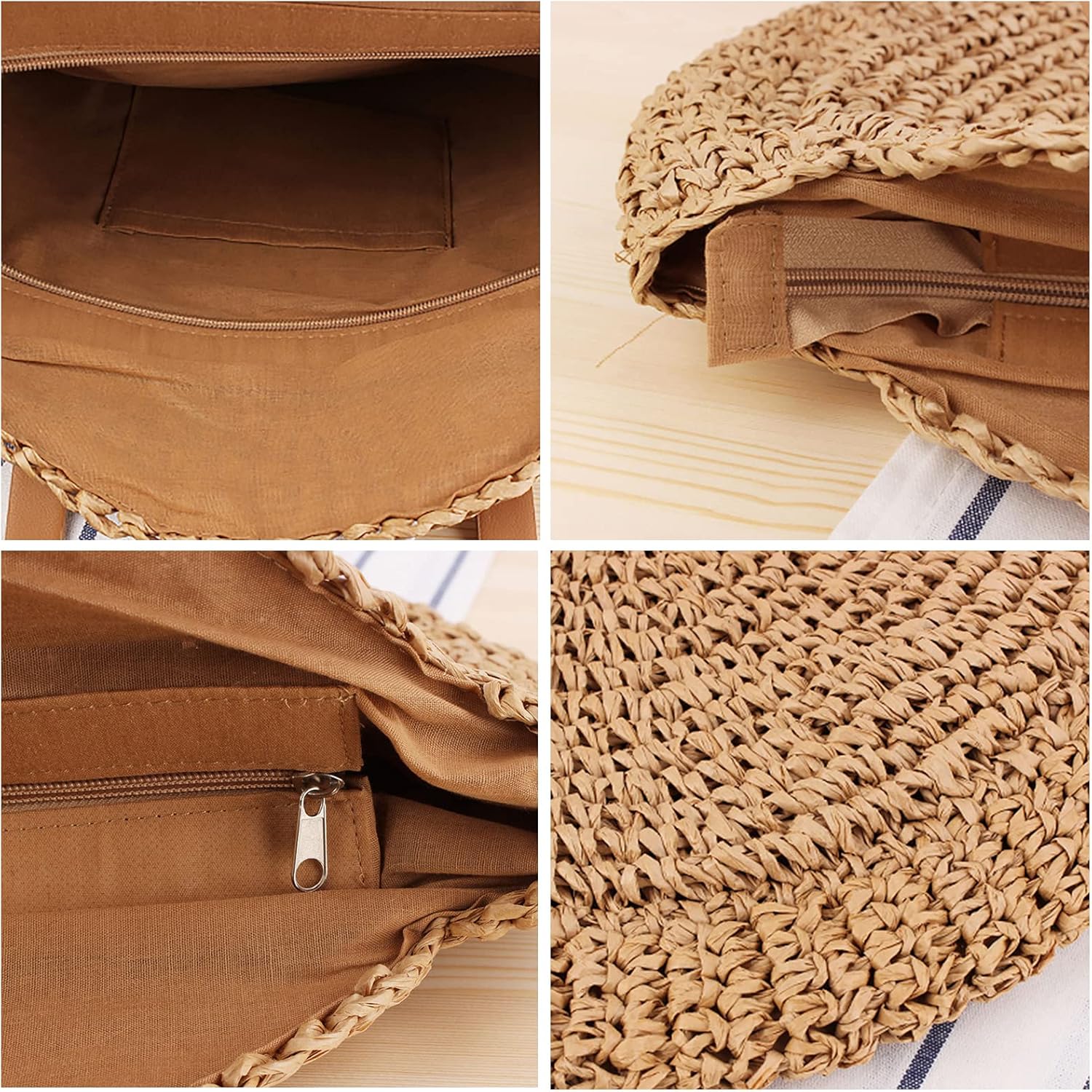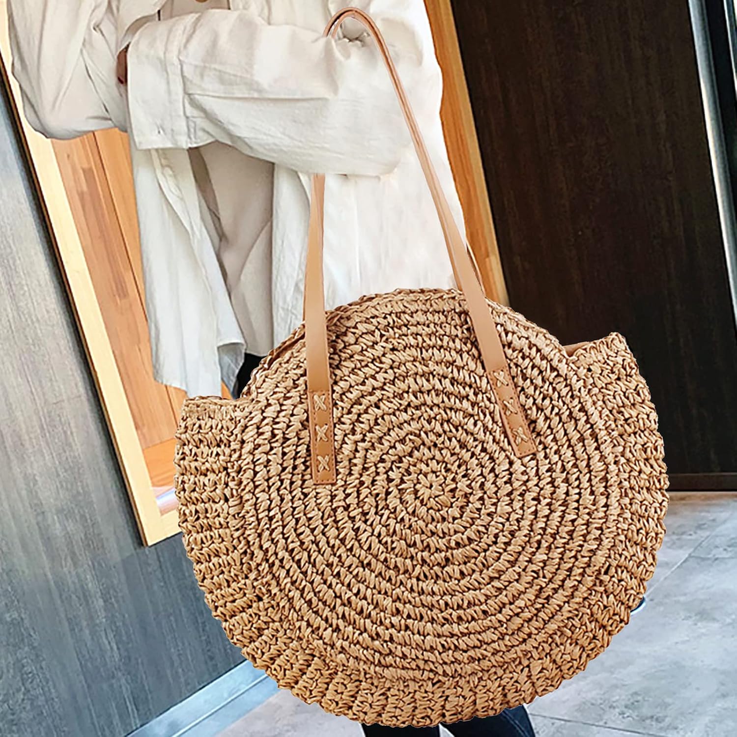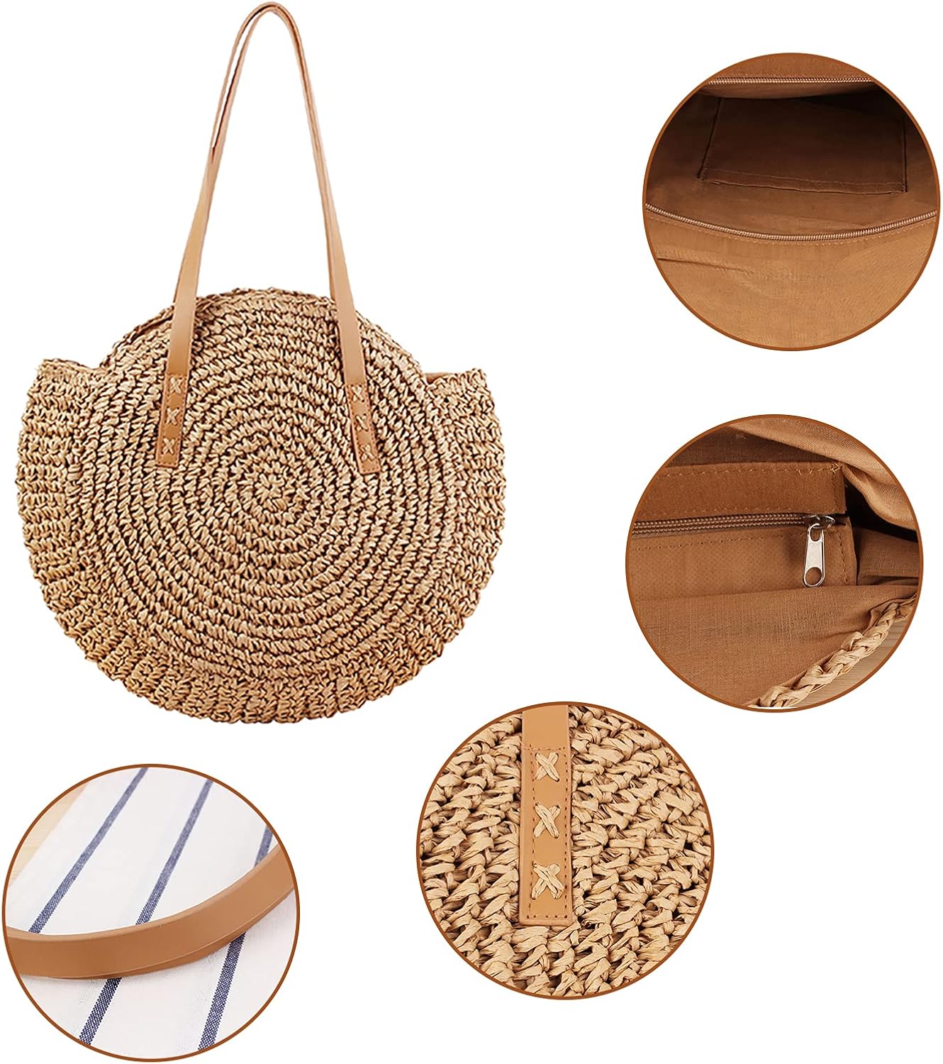 Borsa a tracolla in paglia - Borsa a tracolla da donna, borsa rotonda estiva da spiaggia, borsa rotonda grande tessuta tessuta naturale chic borsa bohémien fatta a mano Caratteristiche: Questa borsa a tracolla in tessuto rotondo è dotata di una tracolla che ti consente di portarla sulla schiena o sollevarla con la mano. Con il vantaggio della tecnologia tessuta a mano, la borsa da spiaggia adotta una tecnologia densa e ordinata, che rende la struttura compatta e rende difficile la perdita di oggetti. Grande capacità per portafogli, gioielli, smartphone, cosmetici, ecc. Pregevole fattura, durata, resistenza all'usura e resistenza ai graffi. Puoi sicuramente abbinare qualsiasi costume in ogni occasione, come: appuntamenti, riunioni, viaggi, spiaggia, ecc. Specifiche: Materiale: Strato esterno tessuto: paglia Fodera: poliestere e cotone. Dimensioni: Larghezza: 44 cm. Altezza: 41 cm/16,14 pollici Altezza tracolla: 24 cm/9,44 pollici Colore: beige/cammello Nota: 1. A causa dei diversi monitor e degli effetti della luce, il colore reale dell'articolo potrebbe essere leggermente diverso da quello mostrato nelle immagini. Grazie! 2. Si prega di considerare un margine di errore di 1-2 cm a causa della misurazione manuale. La confezione include: 1 borsa a tracolla in paglia