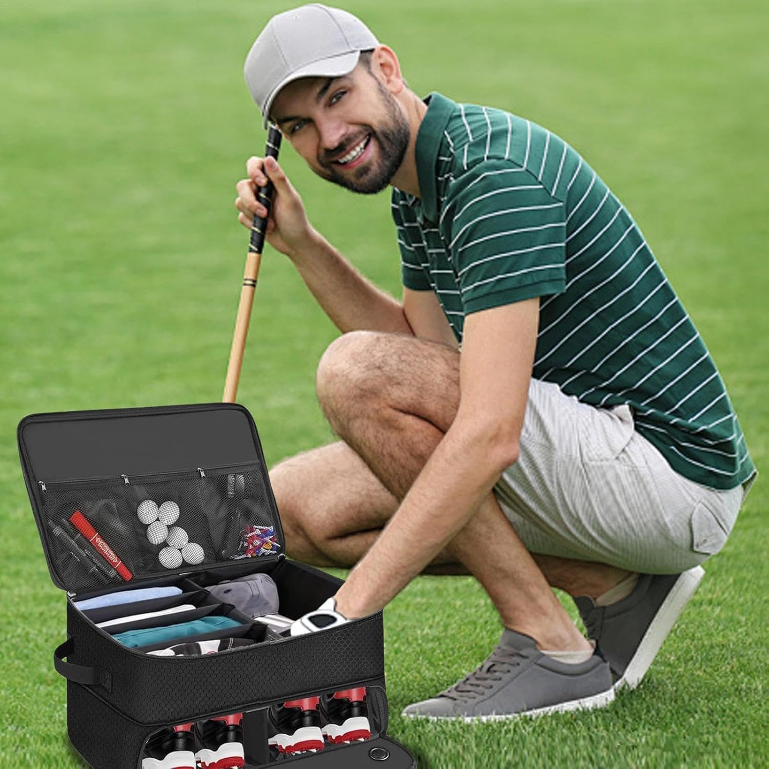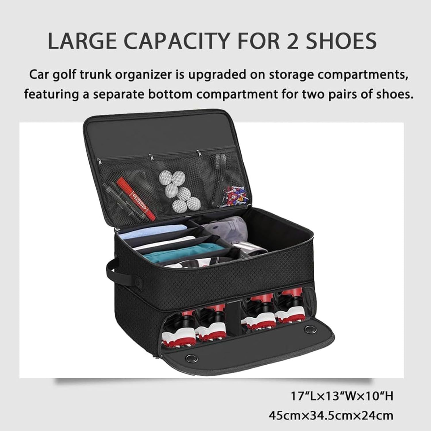 Rivoluziona la conservazione delle scarpe: con il nostro organizer da golf a 2 strati, mantieni le tue scarpe da golf ben tenute e asciutte tutto il giorno. Il design intelligente con fori di ventilazione e lo scomparto inferiore con funzione di ventilazione riducono efficacemente gli odori. Innovazione impermeabile: adotta una struttura a doppio strato con eccellenti prestazioni impermeabili, garantendo che la tua attrezzatura rimanga asciutta in condizioni meteorologiche avverse grazie al suo design impermeabile a doppio strato Regalo premuroso: invia un regalo pratico ai tuoi amici, familiari e colleghi amanti del golf. Apprezzeranno il fatto che tu la loro attrezzatura organizzata ogni giorno e durante le vacanze con questo organizer da golf a 2 strati. Benvenuto alla tua richiesta. Spazio flessibile: dotato di 5 scomparti nella parte superiore, questo organizer for baule da golf a 2 strati offre spazio flessibile for riporre in modo ordinato e pulito palline da golf, magliette, guanti e accessori. Viaggio comodo: con un design robusto della struttura interna, questo organizer for baule da golf a 2 strati è facile da trasportare sul campo da golf o in viaggio, garantendo che rimanga stabile e non si deformi facilmente durante il trasporto