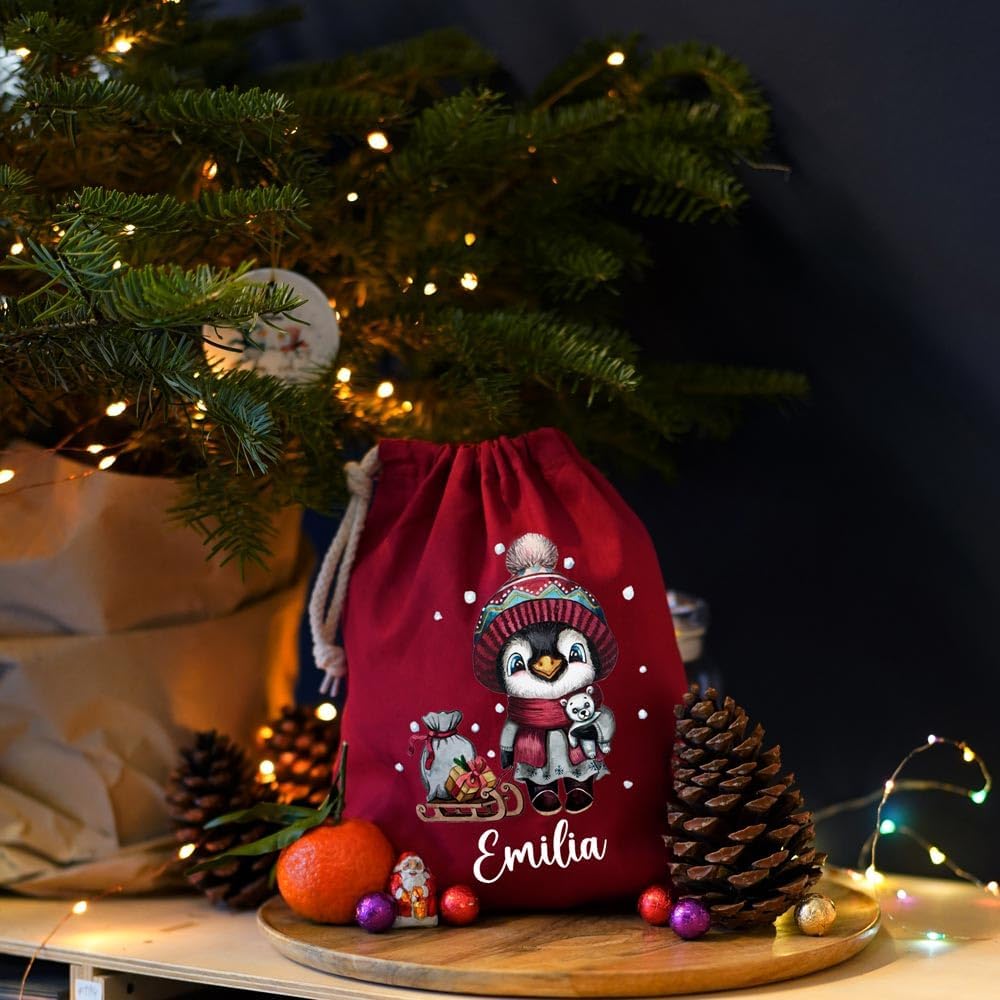 Fornitura e dimensioni: borsa di Babbo Natale con coulisse, pinguino con motivo slitta. Riceverai il tuo sacco di Babbo Natale nelle dimensioni: 25 cm di larghezza x 30 cm di altezza. La borsa è disponibile in rosso o nero. Le buste natalizie possono essere personalizzate con il nome desiderato. Ogni stampa è realizzata a mano con amore ed è un piccolo pezzo unico. Il sacchetto di Natale si chiude facilmente con un cordino ed è anche facile da aprire. Idea regalo di Natale: con i nostri motivi realizzati con cura potrete personalizzare la vostra borsa di Babbo Natale in modo completamente personalizzato e aggiungere meravigliosi accenti. La borsa è ideale come elegante confezione regalo per Natale, San Nicola e l'Avvento. Ottima idea decorativa: la borsa di Babbo Natale funge anche da perfetta decorazione natalizia a casa o in ufficio. Il sacco di Babbo Natale sotto l'albero di Natale emana un'atmosfera natalizia. Qualità: Utilizziamo solo prodotti di alta qualità. I nostri prodotti sono realizzati in Germania. Tutti i nostri design sono illustrati e realizzati con amore nei dettagli sul posto.