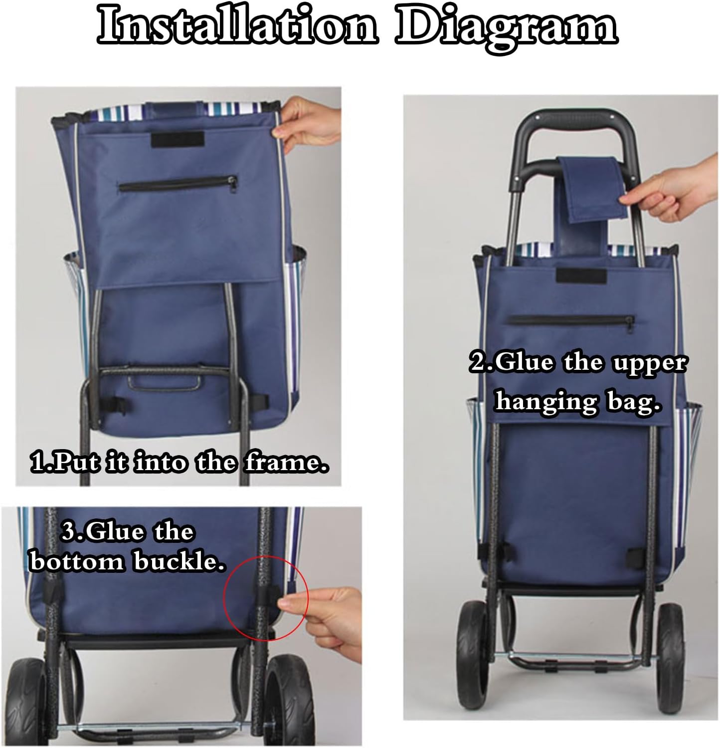 Il prodotto contiene solo la borsa della spesa, non il telaio e le ruote. Telaio e ruote sono solo a scopo espositivo. Si prega di acquistarli separatamente, se necessario. Si prega di misurare le dimensioni effettive prima dell'acquisto. Si aggancia facilmente al carrello e ti consente di trasportare facilmente i tuoi acquisti dal negozio all'auto o a casa. Materiale impermeabile: la nostra borsa per il carrello della spesa è realizzata in tessuto spesso impermeabile con interno impermeabile. Facile da pulire, si consiglia il lavaggio a mano. Utilizzo: borsa sostitutiva per carrello della spesa, adatta alla maggior parte dei carrelli pieghevoli, carrelli della spesa, carrelli della spesa, carrelli pieghevoli, ecc. Pieghevole e portatile: quando non in uso, si piega facilmente a metà per riporlo in modo compatto; Conservare in macchina, sotto il letto o nell'armadio.
