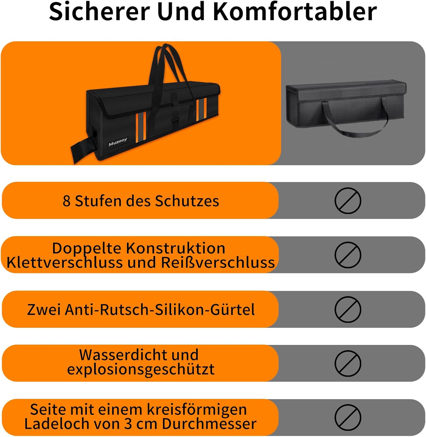 [Ignifugo, impermeabile e antideflagrante] La nostra borsa per batteria ignifuga è una vera fortezza. Lo strato interno è realizzato in fibra di vetro di alta qualità e cotone isolante ignifugo, che può resistere a temperature fino a 1800 ℃. Può raggiungere i 2200 ℃ in breve termine. Con 8 strati di tessuto ignifugo, è un baluardo contro il calore e le fiamme. Lo strato esterno è rivestito in silicone impermeabile, che non solo è ignifugo ma può anche respingere le esplosioni. Non dovrai più preoccuparti di un cortocircuito dell'acqua! 【Grande volume】 Con dimensioni generose di 49 x 15 x 15 cm, la nostra borsa per batteria per ebike estesa offre spazio sufficiente per un'ampia gamma di batterie per ebike come PowerTube 750, PowerTube 625, PowerTube 500 e altre. Anche le batterie più grandi possono essere facilmente alloggiate qui. [Ricarica sicura] Il nostro design a doppia sigillatura, costituito da una chiusura in velcro e una cerniera, garantisce che la custodia della batteria rimanga saldamente chiusa durante la ricarica. In caso di incendio, questo sofisticato sistema a doppio strato rallenta efficacemente la propagazione dei gas e delle fiamme, garantendo ulteriore sicurezza. 【Trasporto confortevole】 La nostra borsa per batteria Ebike è dotata di due cinturini in silicone antiscivolo che mantengono saldamente la batteria in posizione ed evitano fastidiose oscillazioni durante il trasporto. Porta comodamente la copertura protettiva per batteria della bici elettrica in mano o in spalla: le cinghie possono essere regolate in base alle tue preferenze. E quando non ti serve, può essere facilmente ripiegato e riposto per risparmiare spazio. 【Certificazione di sicurezza】 La nostra batteria ignifuga è stata testata dalle principali associazioni professionali e ha superato la certificazione UTL per garantire i più elevati standard di sicurezza. Inoltre, offriamo un servizio post-vendita professionale a disposizione per rispondere a qualsiasi domanda o dubbio. E per la tua assoluta tranquillità, offriamo un servizio post-vendita con rimborso incondizionato. (Brevetti di design)