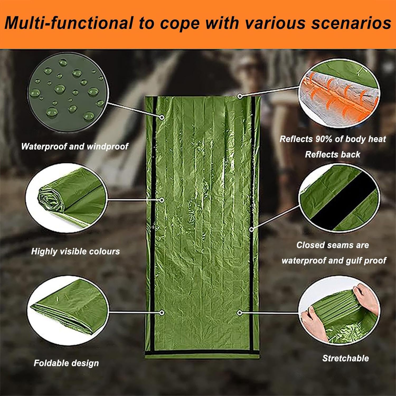 Facile da usare: il nostro sacco a pelo di sopravvivenza facilita la ritenzione del calore; può essere utilizzato come fodera o borsa autonoma. Leggero e compatto, è la grande aggiunta a qualsiasi escursione all'aperto. Il montaggio è veloce e senza sforzo: basta aprirlo, aprirlo e goderselo Materiale resistente: è impermeabile e realizzato in materiale resistente, garantendo la massima protezione da qualsiasi condizione atmosferica. Inoltre, può essere comodamente ripiegato nella custodia in nylon impermeabile per una facile conservazione e trasporto Mantenere il calore corporeo: quando si affrontano forti venti, forti piogge o neve pesante, portare con sé questo sacco a pelo di sopravvivenza. Aumenta la temperatura corporea fino a 20 gradi, assicurando il mantenimento del calore corporeo durante le avventure all'aria aperta Ampiamente applicabile: con la sua capacità di funzionare come coperta, impermeabile, riparo e molto altro ancora, questo versatile sacco a pelo è un'aggiunta indispensabile a qualsiasi borsa di fuga, garantendo prontezza a qualsiasi cosa Resistenza impermeabile: rimani al sicuro e all'asciutto con il nostro sacco a pelo di sopravvivenza, costruito per resistere a condizioni esterne difficili con le sue forti prestazioni impermeabili e ti mantiene comodo durante qualsiasi spedizione