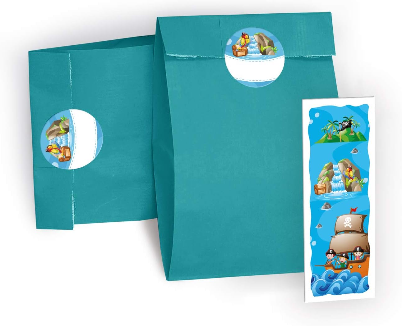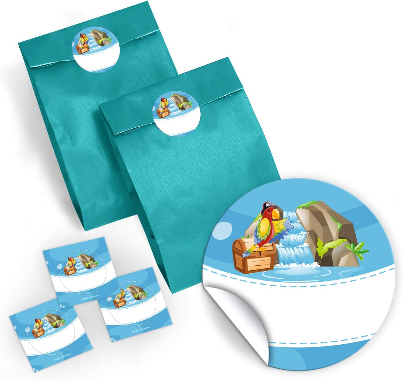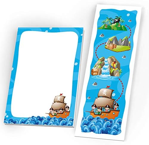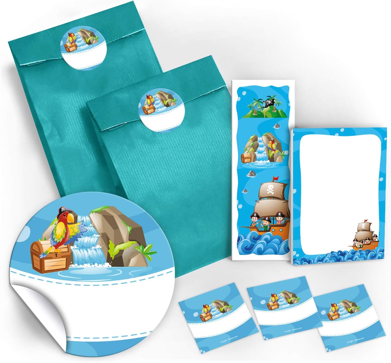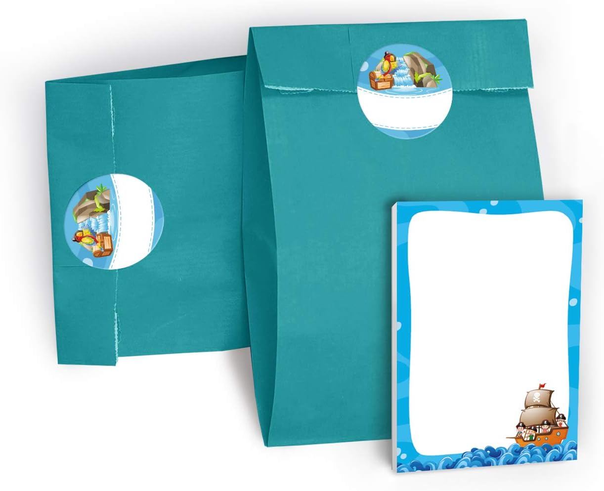Set di 12 sacchetti, 12 adesivi, 12 mini block notes e 12 segnalibri con il motivo "Pirati". Gli adesivi misurano 4 cm/rotondi e sono pretagliati sul materiale di supporto. Sull'adesivo puoi scrivere il nome dell'ospite o del giocatore o, ad esempio, "Grazie". I sacchetti per feste hanno una dimensione di 12 x 19 cm. Il segnalibro ha una dimensione di 5,2 x 14,80 cm. Il segnalibro ha una stampa di immagini da 300 g/m ed è rivestito con vernice UV (lucida) su entrambi i lati. Il blocco note ha una dimensione di 7,4 x 10,5 cm (DIN A7) e contiene 25 fogli. La parte anteriore è stampata, la parte posteriore non è stampata. I blocchi sono rilegati con colla (in alto) e non hanno la copertina. Il set è molto adatto come regalo per compleanni, matrimoni, battesimi o altre celebrazioni dei bambini.