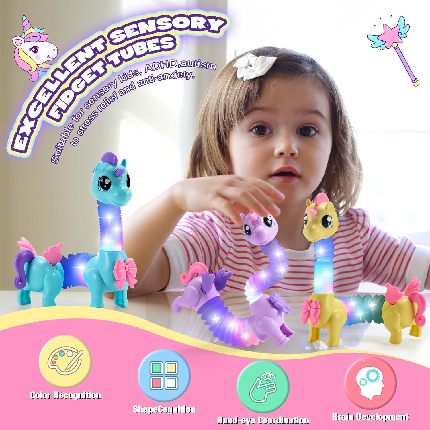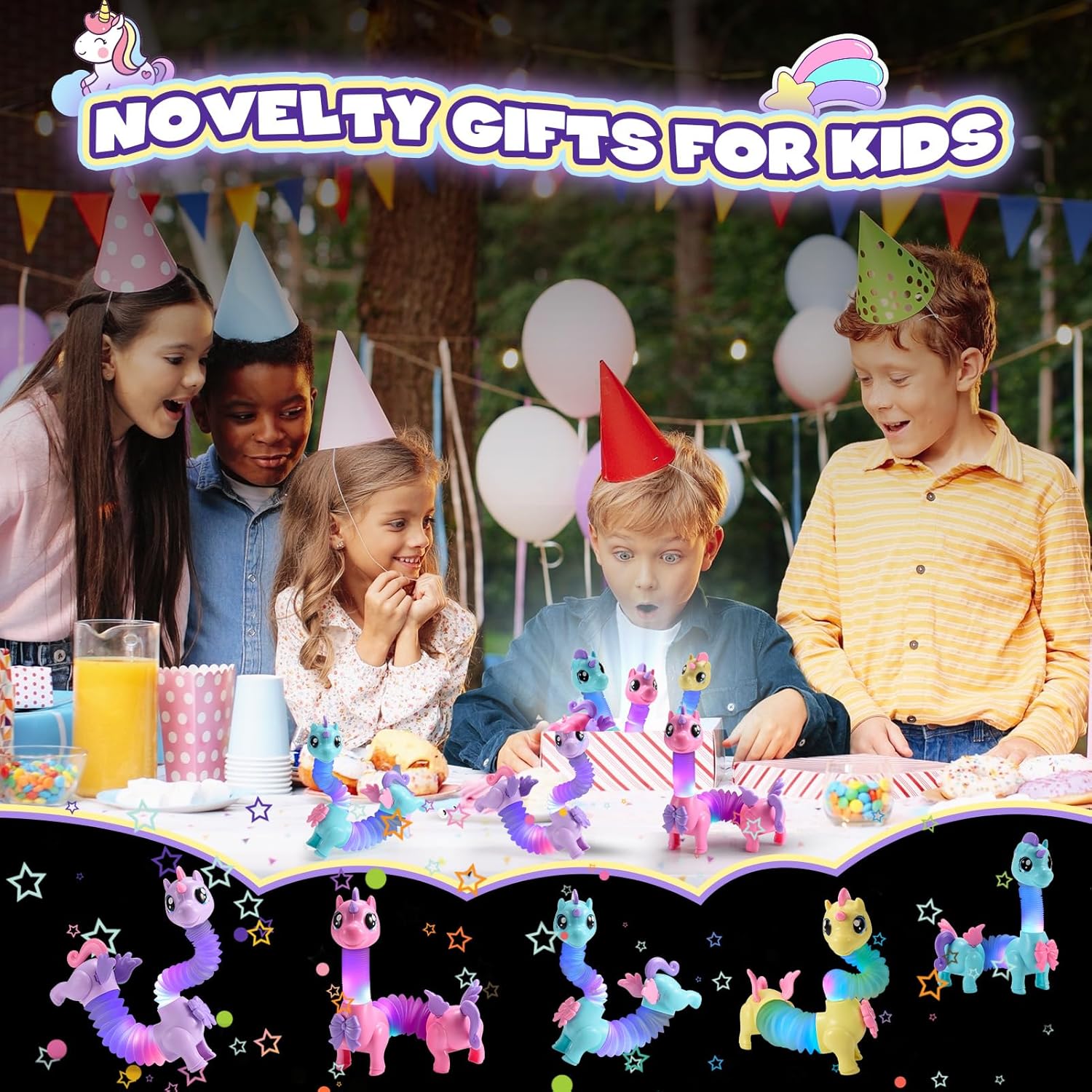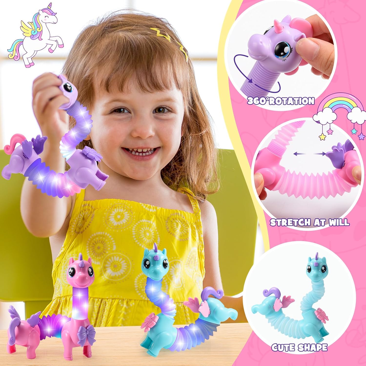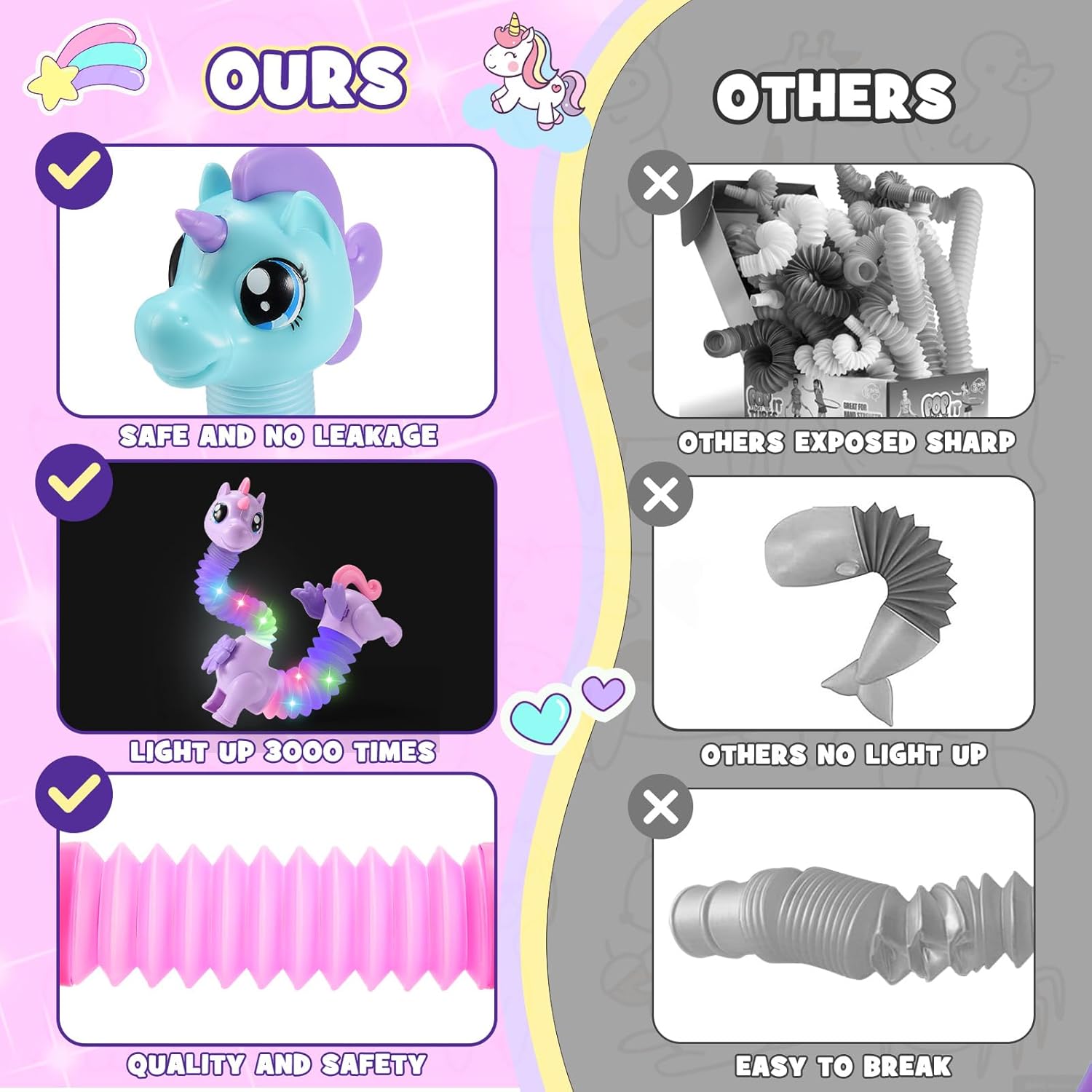 【Tubo pop LED unicorno da 4 pezzi - colore casuale】 Questo giocattolo mostra quattro unicorni. Può essere allungato di 360 gradi e ruotato in diverse forme, e il Pop Tube si illumina solo quando viene allungato. I giocattoli luminosi possono attirare l'attenzione dei bambini, fornire diverse esperienze sensoriali e divertenti e stimolare la creatività dei bambini! Nota: non impermeabile. 【Giocattolo sensoriale a LED】Accessori per feste migliorati. Il corpo di questo giocattolo sensoriale è realizzato in Pop Tube con LED lampeggiante incorporato che si illumina quando si restringono liberamente e si deformano con il "pop". La luce LED si spegnerà automaticamente dopo aver lampeggiato per 15 secondi. Le luci e i colori straordinari impressioneranno sicuramente il tuo bambino e offriranno infiniti momenti di divertimento giorno e notte! Ideale per bambini autistici, stressati e anche un ottimo giocattolo antistress. 【Giocattolo antistress per tutti】 Il Pop Tube è adatto a tutte le età. Questo giocattolo sensoriale calma i bambini con un "pop" quando viene allungato. Non solo aiuta i bambini a riconoscere colori, animali e forme, ma può anche servire come strumento didattico per l'autismo, l'ADHD, i problemi sensoriali e i deficit visivi. Per gli adulti, puoi allungare e ruotare questo giocattolo agitato. Lascia andare le emozioni, allevia lo stress e riduci l'ansia sul lavoro o sullo studio. 【Materiale facile da giocare e sicuro】 Tubo pop realizzato in plastica di alta qualità. Spessa ed elastica. Il corpo può essere esteso o ruotato liberamente di 360°. Una volta allungato, il tubo si illumina, rendendolo un divertente giocattolo per divertirsi con i bambini. Suono "pop" desiderabile, piccolo e leggero per un facile trasporto, e ci siamo anche assicurati che i tubi abbiano bordi arrotondati per evitare che i bambini si graffino sugli angoli acuti. Regalo creativo: questo giocattolo fidget a LED con unicorno è molto creativo come regalo per i bambini. Ideale per feste di compleanno dei bambini, premi per le classi scolastiche, premi di carnevale, riempitivi per pinata, riempitivi per calze di Natale, regali per feste e regali per la festa dei bambini. Può attirare l'attenzione dei bambini e impedire loro di diventare dipendenti dai prodotti elettronici. Condividi questo giocattolo fidget con la tua famiglia o i tuoi amici per un'intera giornata di divertimento!
