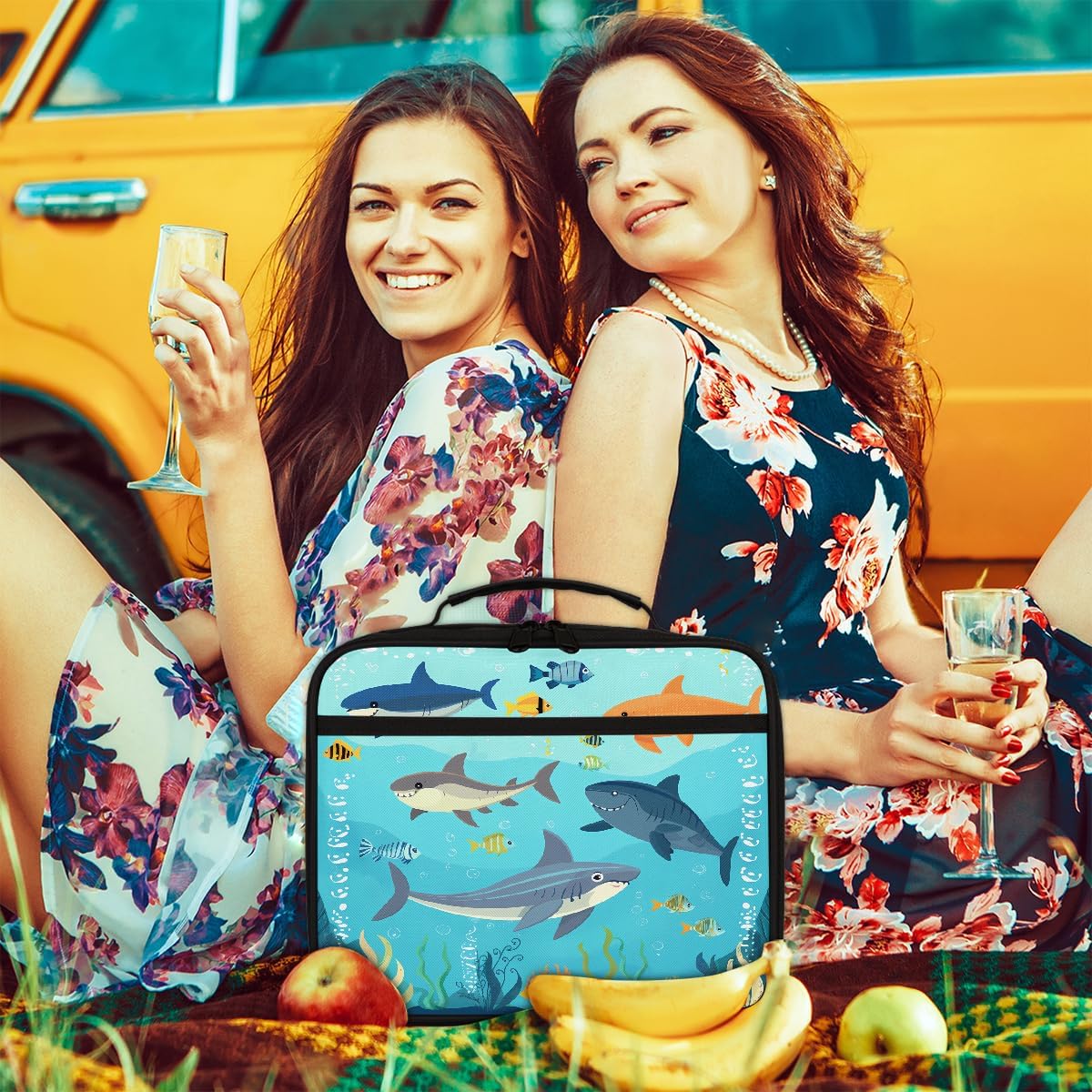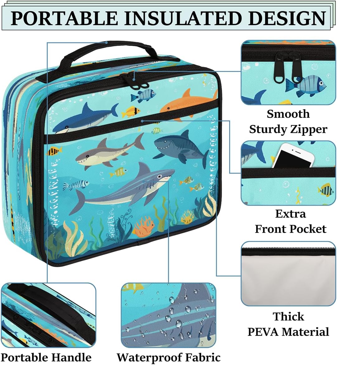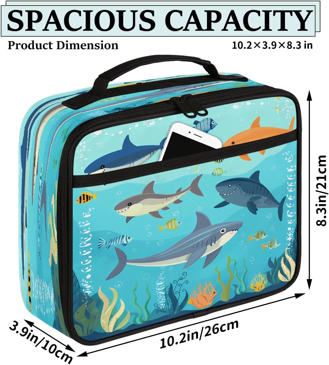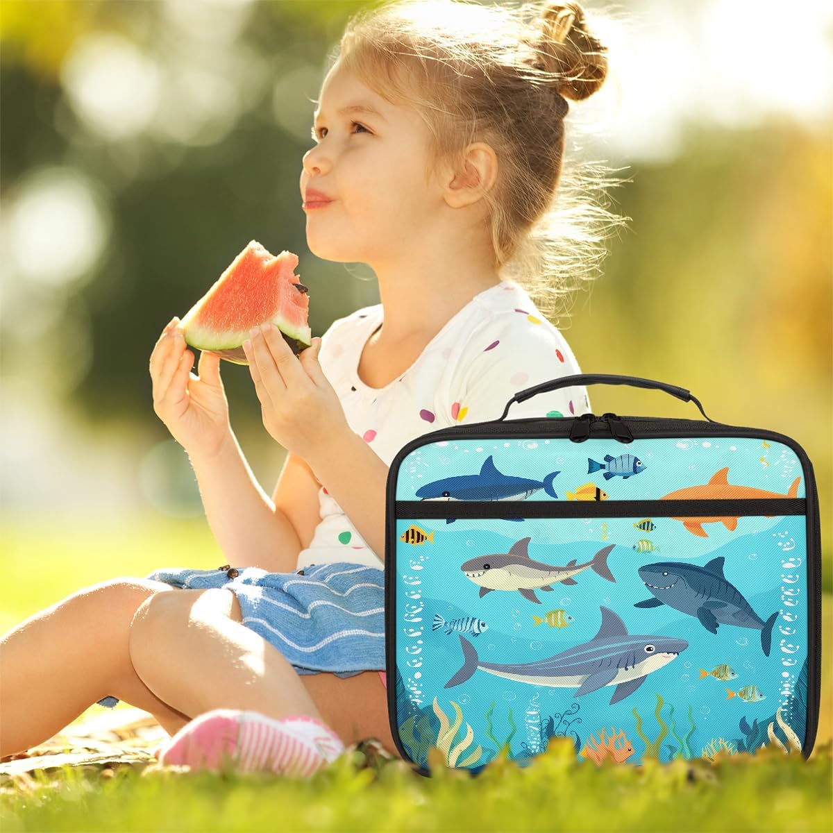 Borsa per il pranzo per bambini con animali marini in stile cartone animato, balena, squalo, borsa portapranzo per ragazzi e ragazze, riutilizzabile, isolata, bento, per scuola, picnic