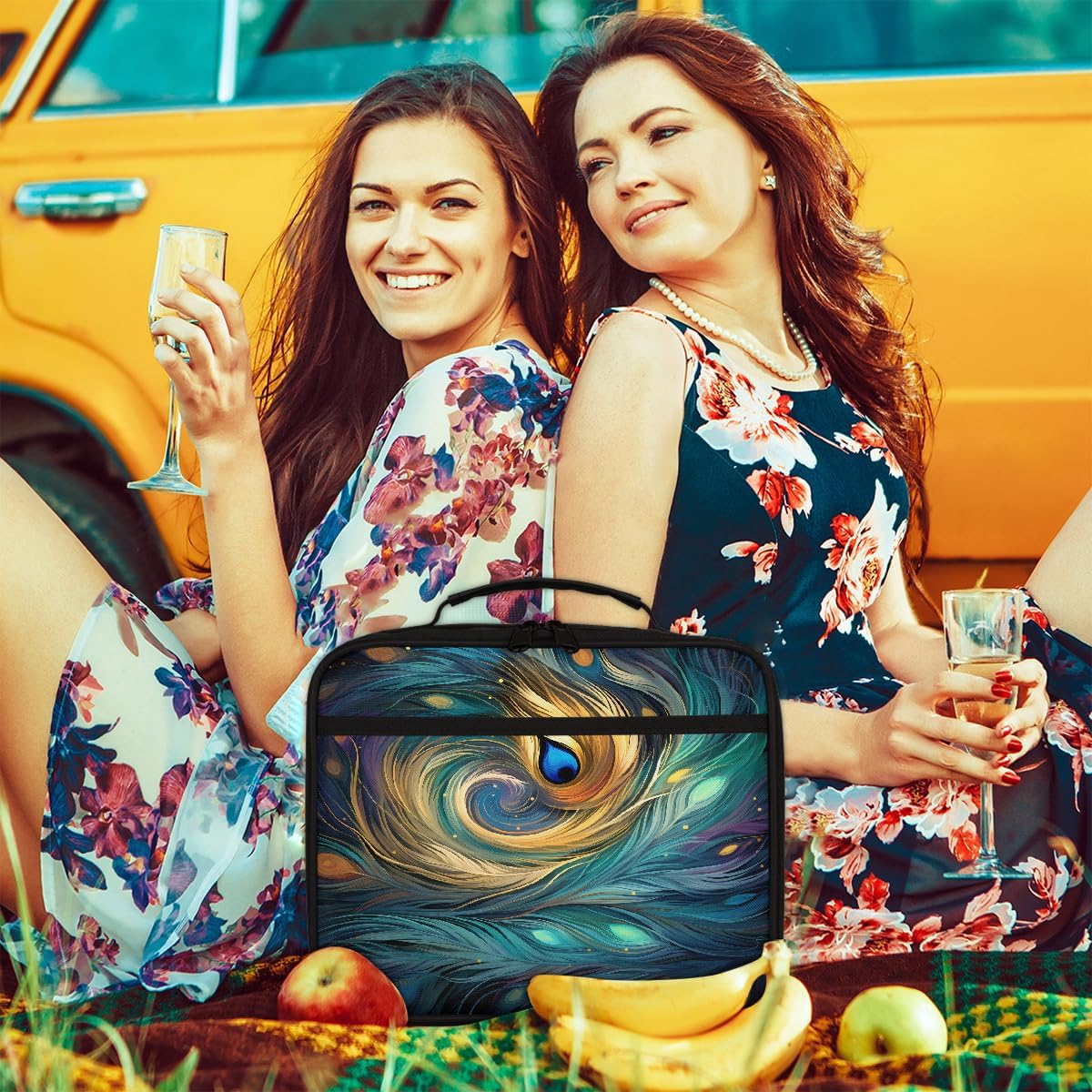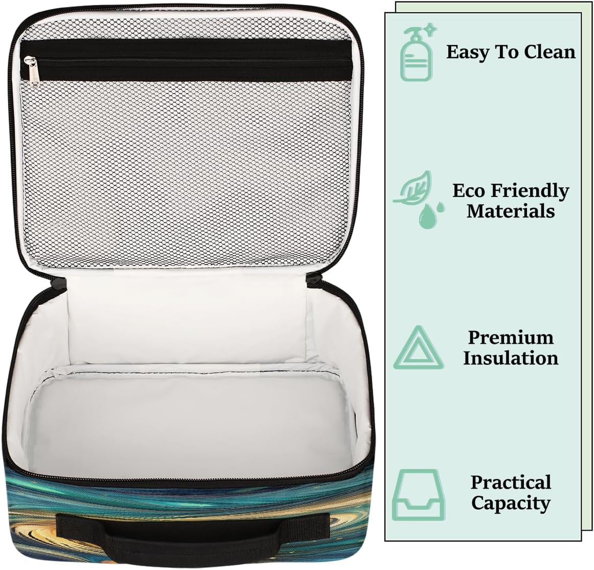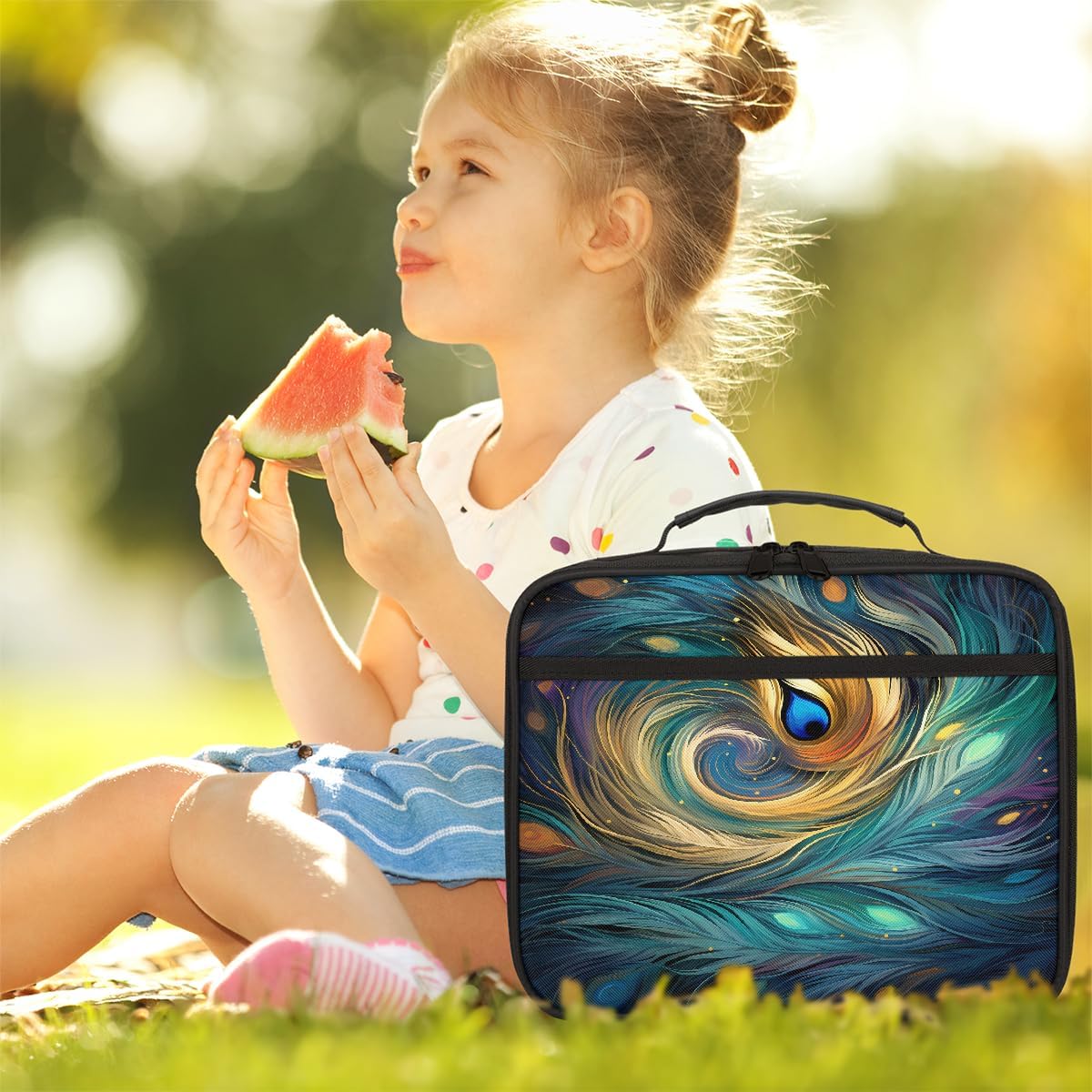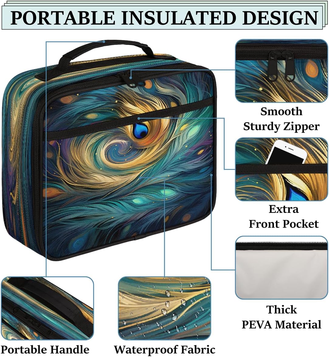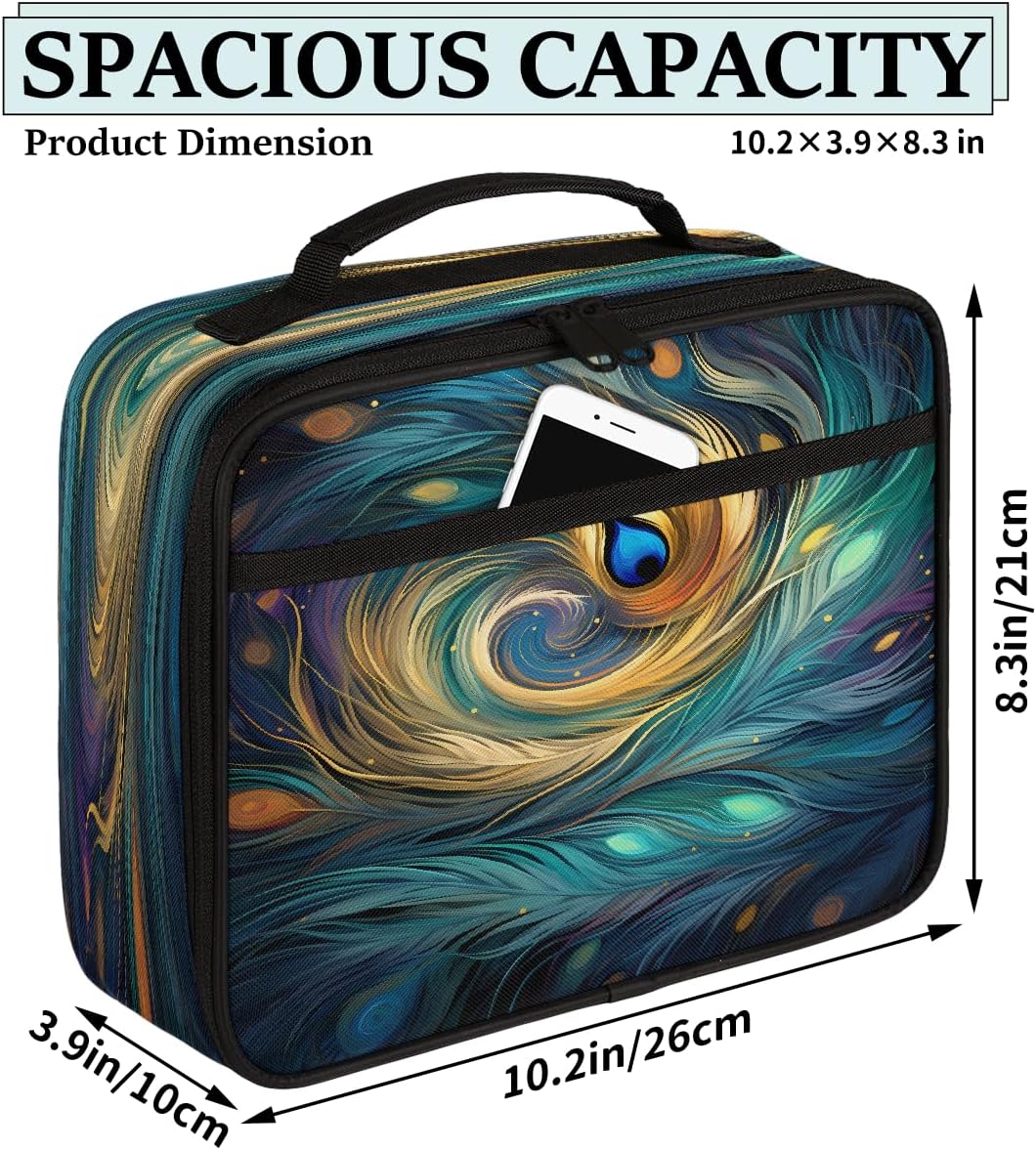 Borsa per il pranzo per bambini con piume di pavone e galassia, borsa per il pranzo astratta per ragazzi e ragazze, riutilizzabile, isolata, bento, per scuola, picnic, lavoro