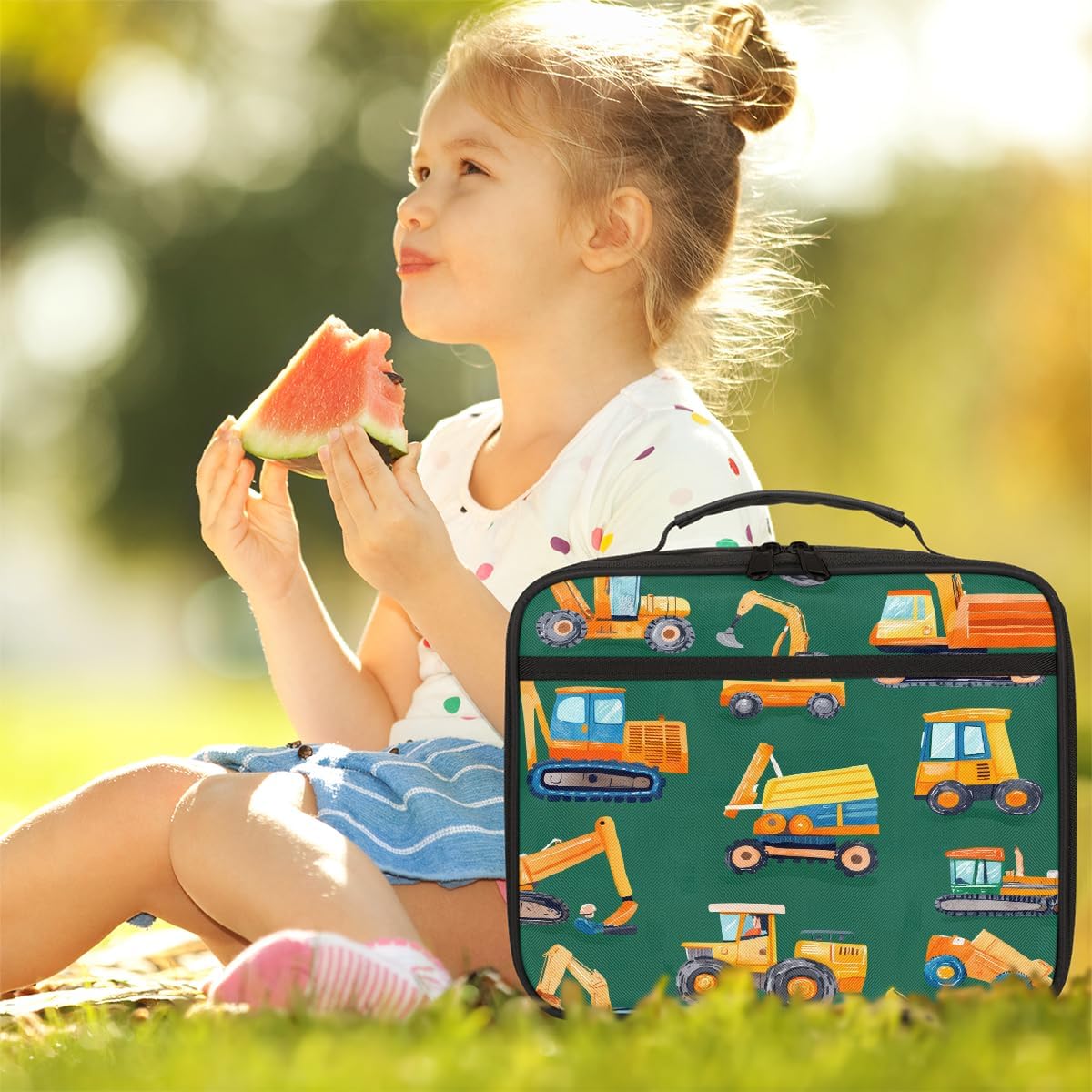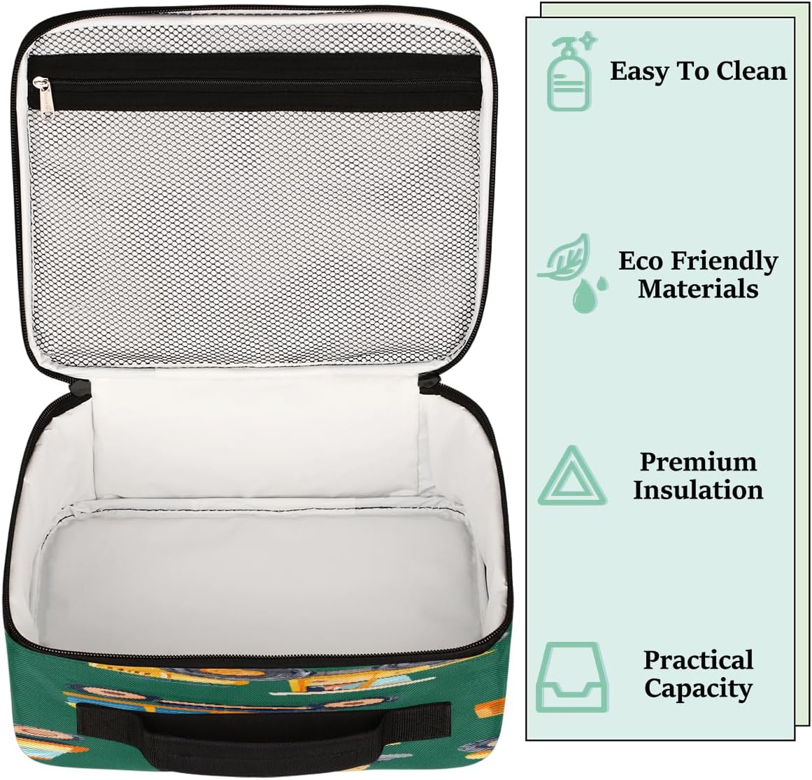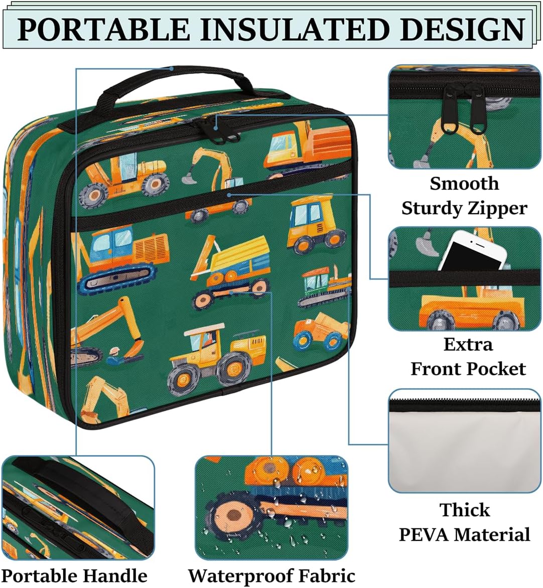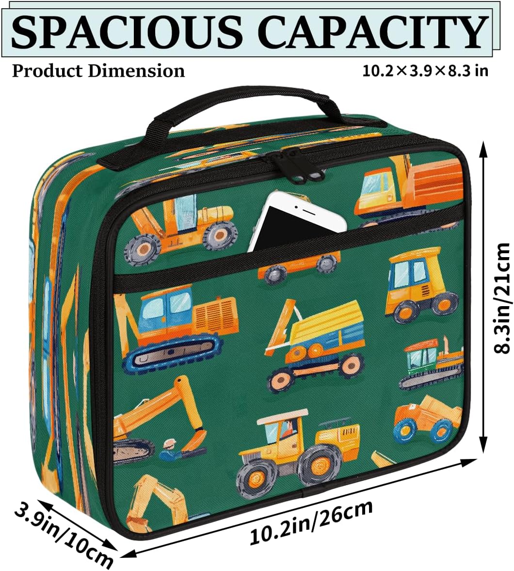 Borsa per il pranzo per bambini con simpatici veicoli da costruzione, borsa per il pranzo verde, per ragazzi e ragazze, riutilizzabile, isolata, bento, borsa tote per scuola, picnic, lavoro