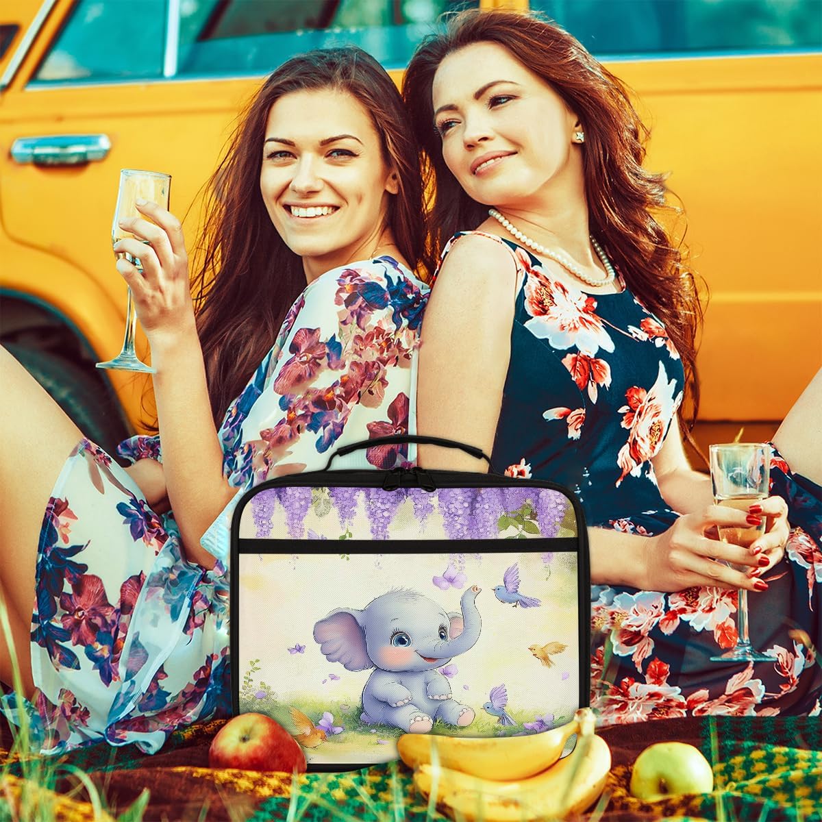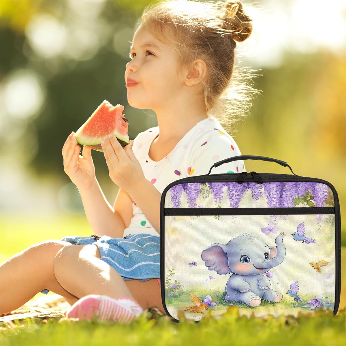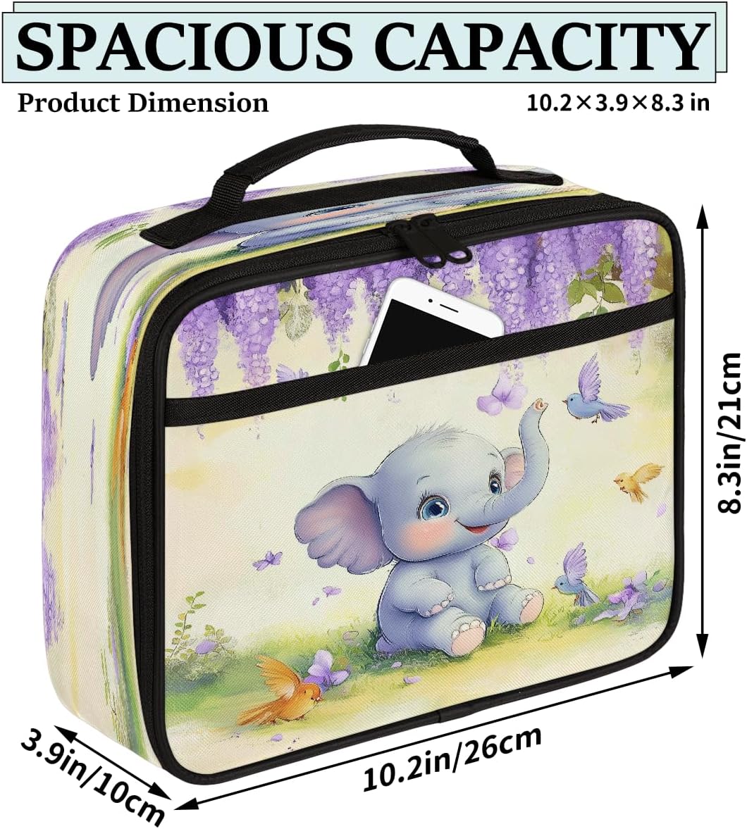 Borsa per il pranzo per bambini, motivo floreale viola, con elefante, uccellini, borsa per il pranzo per ragazzi e ragazze, riutilizzabile, isolata, bento, per scuola, picnic, lavoro