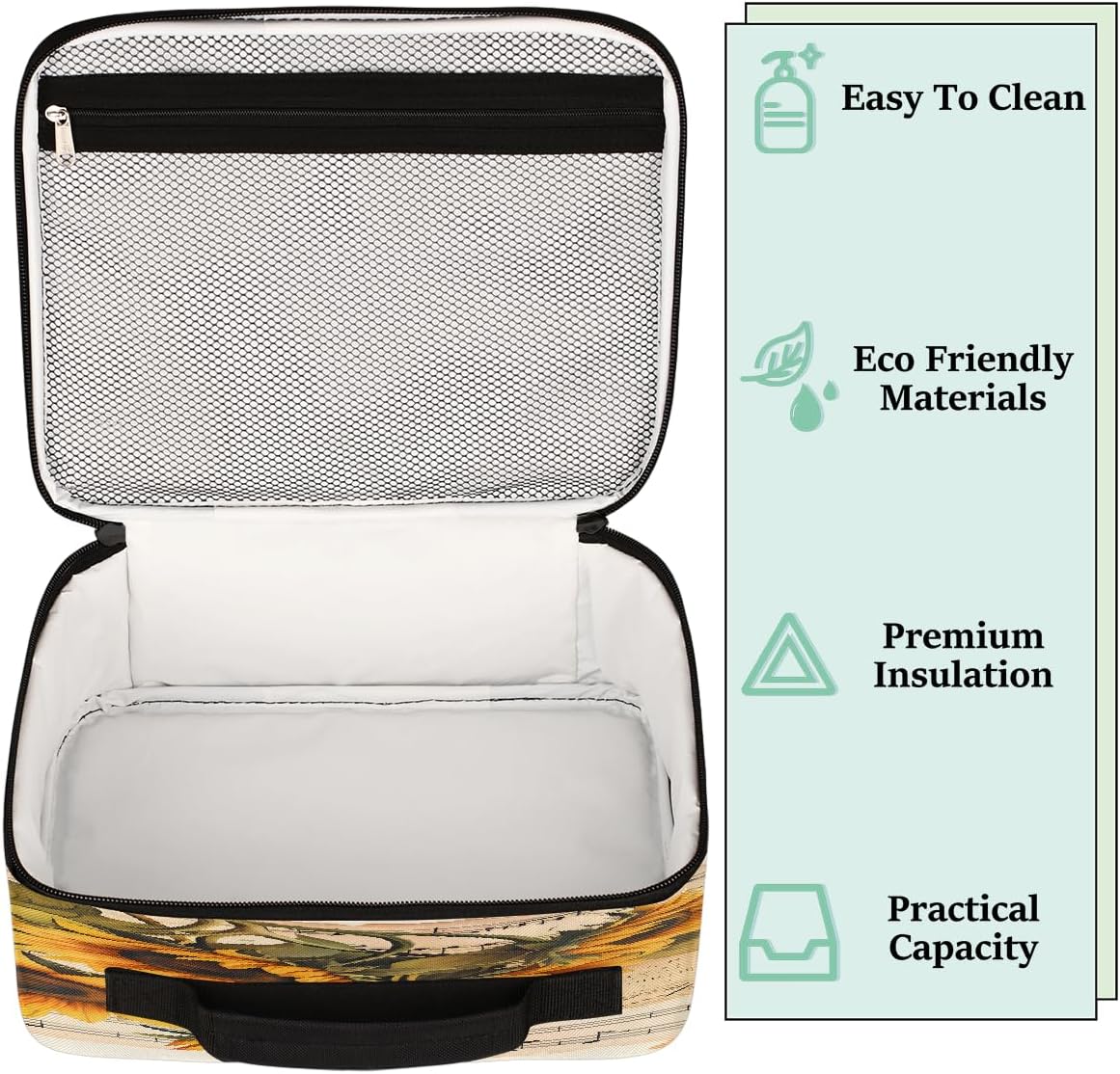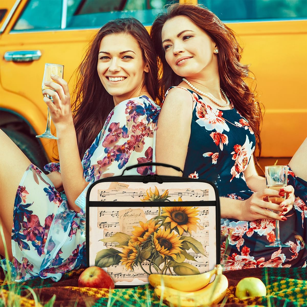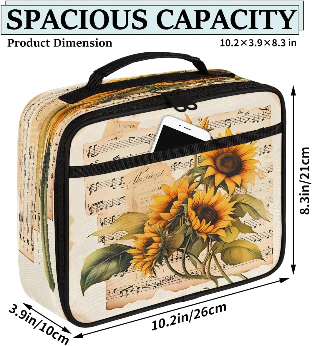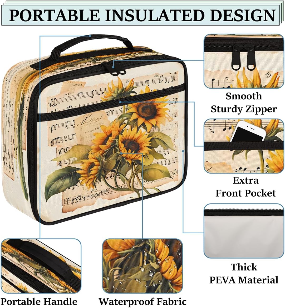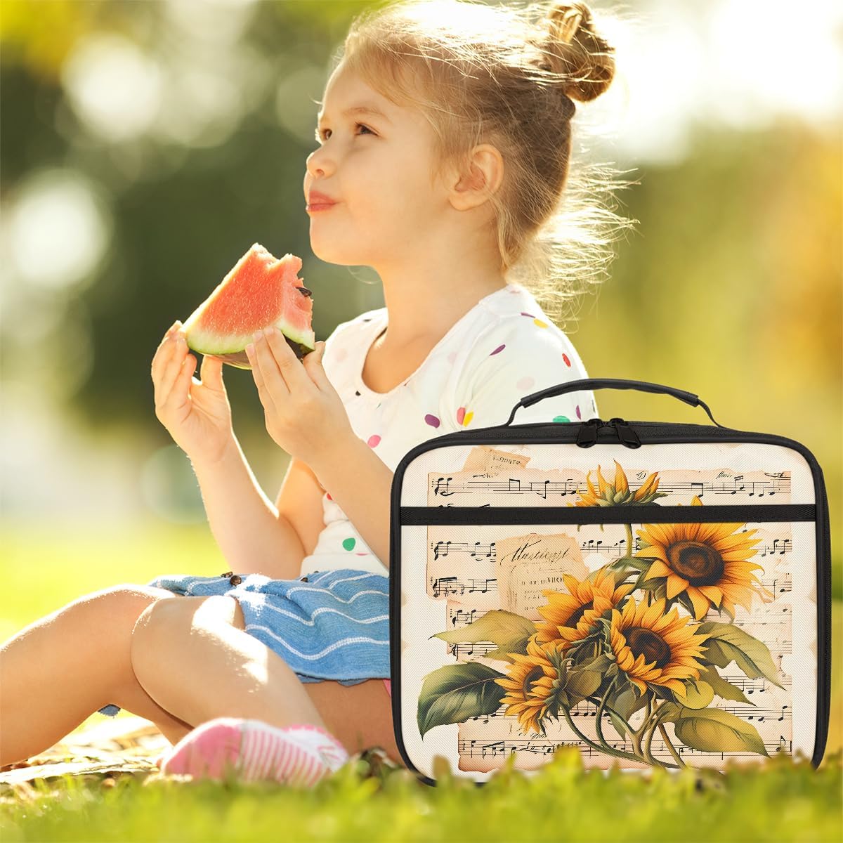 Borsa per il pranzo per bambini, stile vintage, motivo musicale, motivo girasoli, per ragazzi e ragazze, riutilizzabile, isolata, bento, per scuola, picnic, lavoro