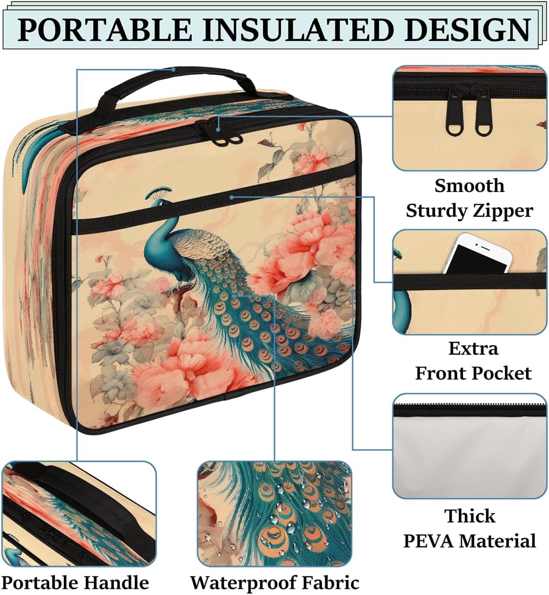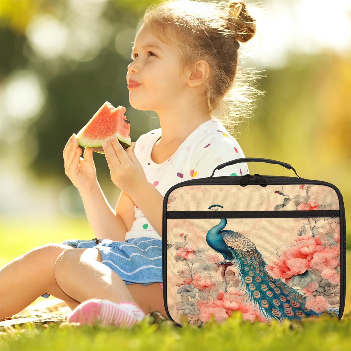 Borsa per il pranzo per bambini, vintage, floreale, elegante, con pavone, borsa per il pranzo per ragazzi e ragazze, riutilizzabile, isolata, bento, per scuola, picnic, lavoro