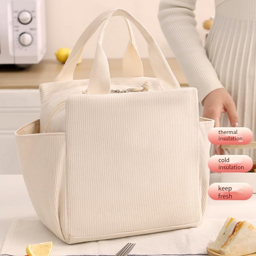 Ampio spazio di archiviazione: l'interno spazioso può contenere vari contenitori insieme a snack e bevande, hai tutto ciò di cui hai bisogno imballato ordinatamente. Elegante tessuto a coste: realizzata in velluto a coste, questa borsa per il pranzo offre funzionalità e stile che si adatta a ogni occasione. Comoda da maneggiare: con manici robusti progettati per un facile trasporto, questa borsa è perfetta sia che tu stia andando al lavoro o frequentando le lezioni. [Usi multifunzionali] Adatto per studenti e professionisti che lavorano; portarlo a picnic o usarlo come un dispositivo di raffreddamento compatto durante il viaggio.