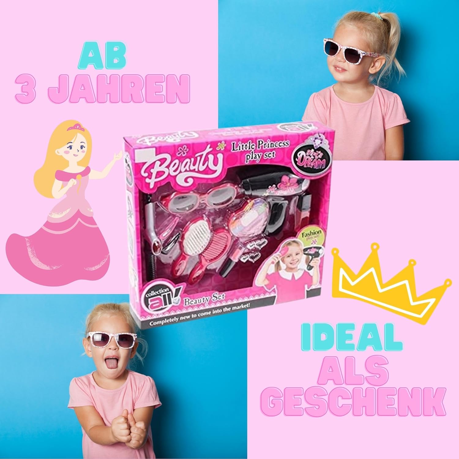 Kit trucco completo per bambini con tanti accessori. Apri l'elegante scatola per il trucco e avvia il tuo studio di bellezza o parrucchiere. Scarica i tuoi amici e organizza una visione della scena insieme. Incluso: asciugacapelli elettrico/bacchetta per arricciare/spazzola per capelli/pettine/fermagli per capelli/occhiali da sole/palette di ombretti/rossetto, ecc. *Azione con squillo* più un divertente gioco di conigli. (offerta valida fino al 30/09/2018).