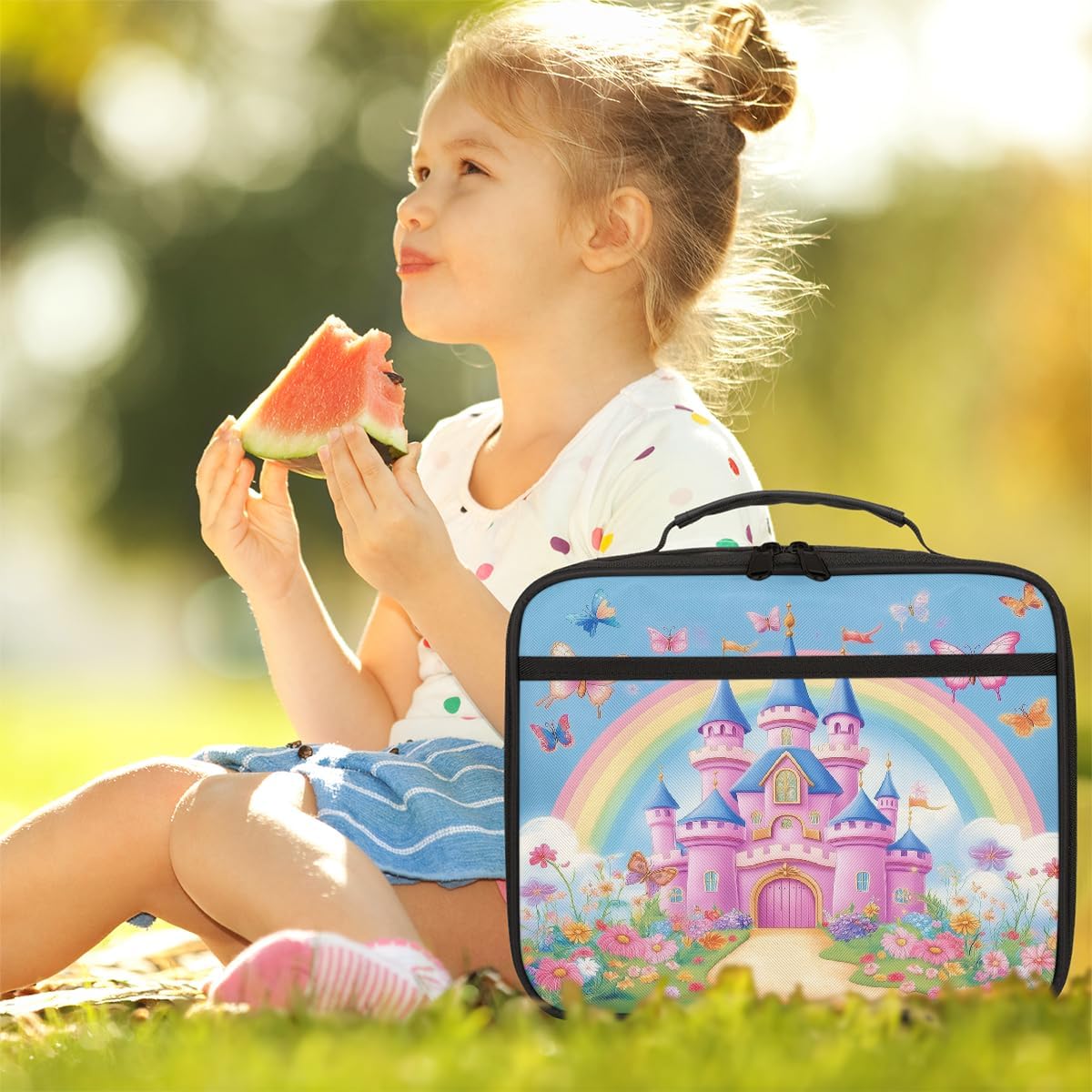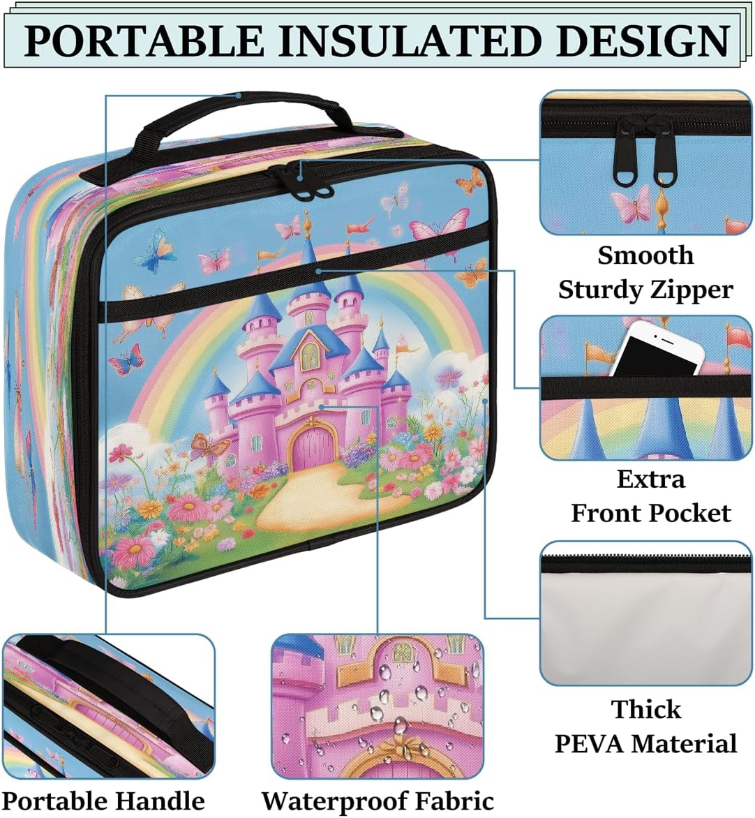 Borsa portapranzo per bambini con castello in stile cartone animato, farfalla, arcobaleno, borsa per il pranzo per ragazzi e ragazze, riutilizzabile, isolata, bento, per scuola, picnic