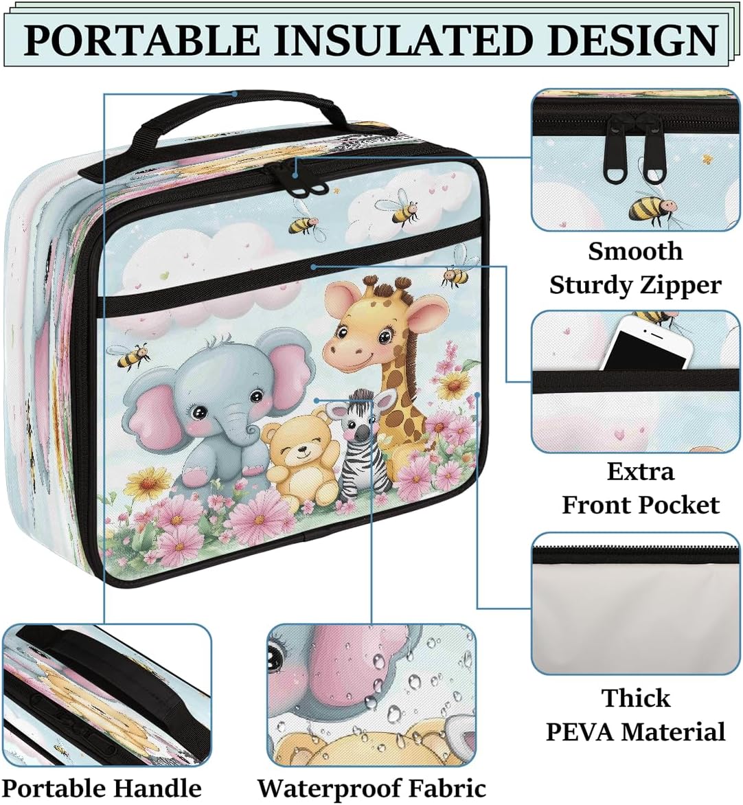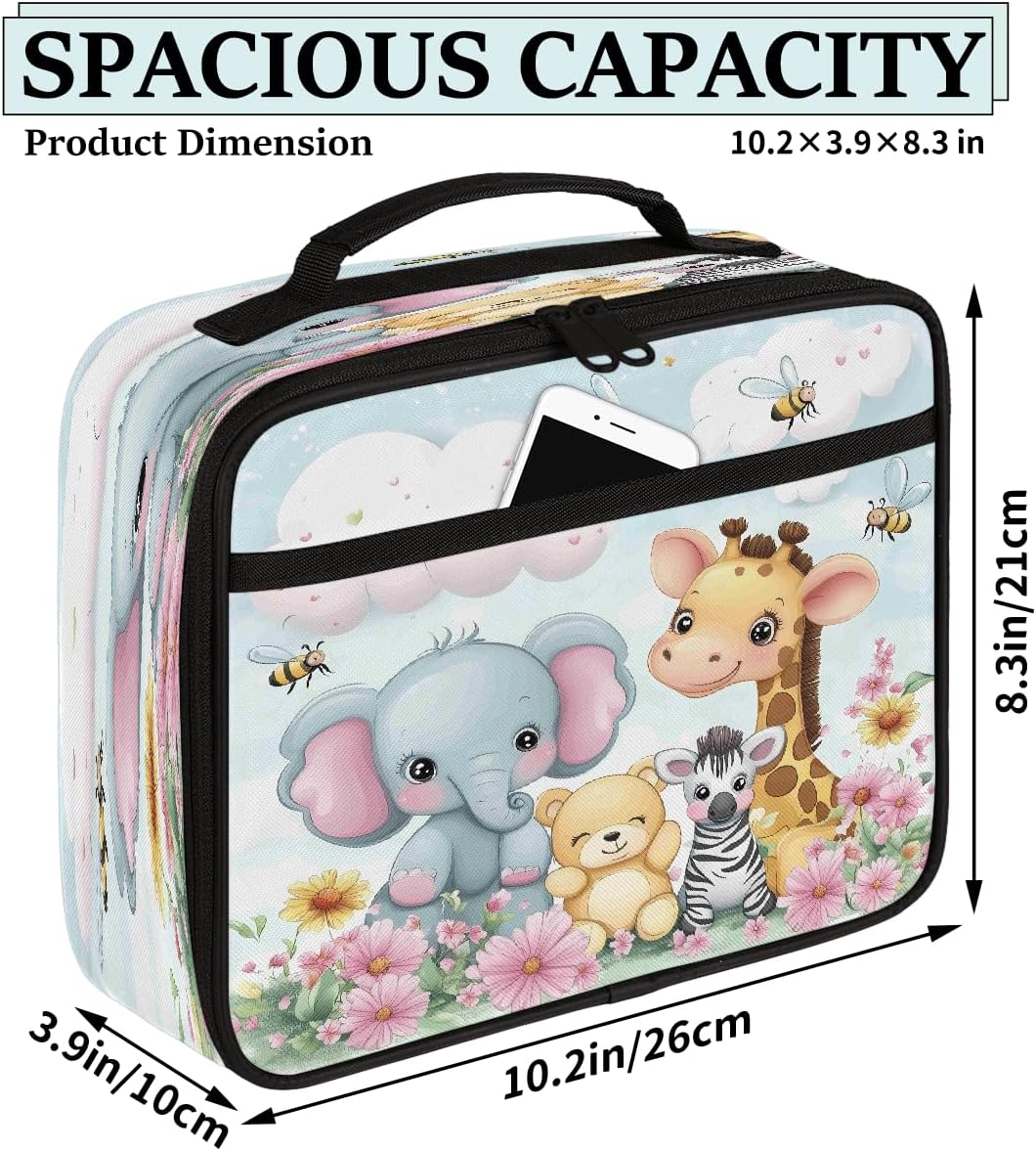Borsa portapranzo per bambini con elefante, giraffa, zebra, orso, animali, borsa per il pranzo, per ragazzi e ragazze, riutilizzabile, isolata, bento, per scuola, picnic, lavoro