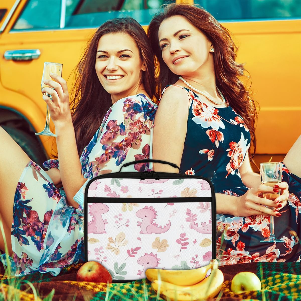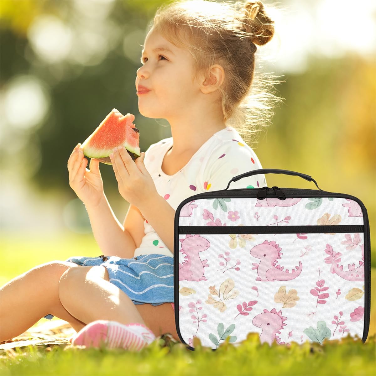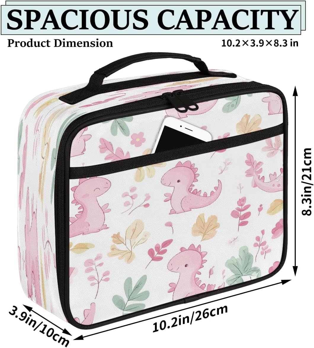 Borsa portapranzo per bambini con simpatico dinosauro rosa con foglie, borsa per il pranzo per ragazzi e ragazze, riutilizzabile, isolata, bento, per scuola, picnic, lavoro