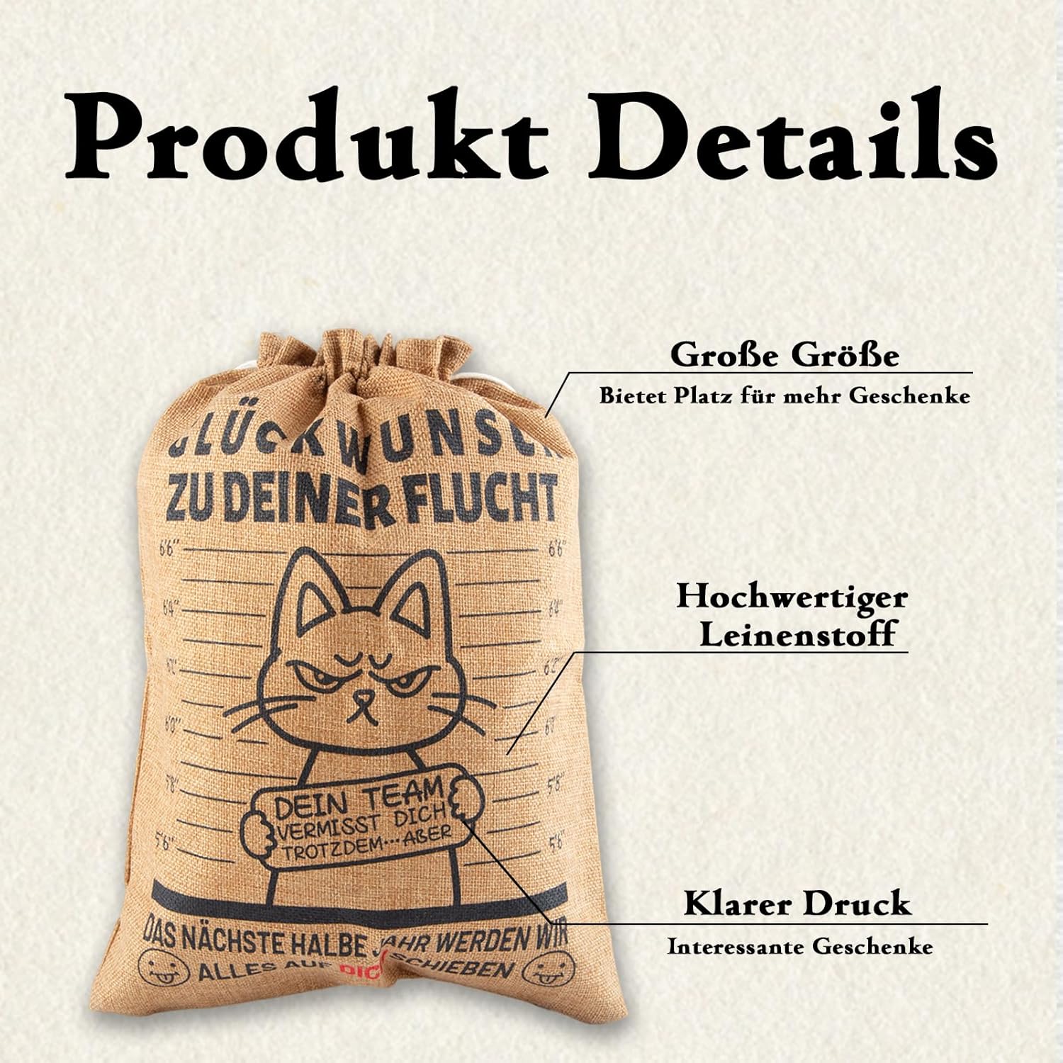 😄 Divertente regalo d'addio: la stampa "CONGRATULAZIONI PER LA TUA Fuga" rende il sacchetto regalo il perfetto regalo d'addio divertente per i colleghi. 💖 Lino di alta qualità: il sacchetto regalo è realizzato in lino robusto, durevole e privo di pelucchi. Il colore scuro garantisce discrezione: il regalo rimane una sorpresa finché non viene aperto! 💞 Dimensioni perfette (40 x 30 cm): ideale per bottiglie di vino, libri o altri regali per il vecchio. Pratico e versatile! 🎉 Confezione regalo ideale: che sia per un collega, questa borsa regalo garantisce bellissimi ricordi e un'esperienza regalo indimenticabile! 📧 Servizio cordiale: se non sei soddisfatto dei nostri prodotti, contatta il servizio clienti in tempo. Ti offriremo un servizio di rimborso o sostituzione.
