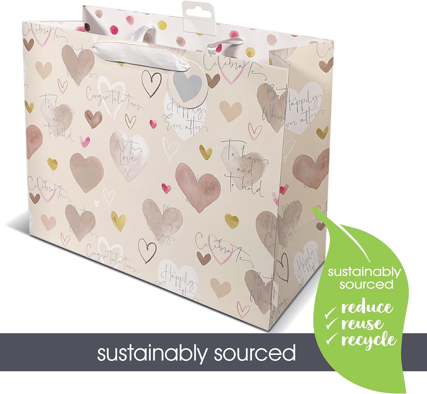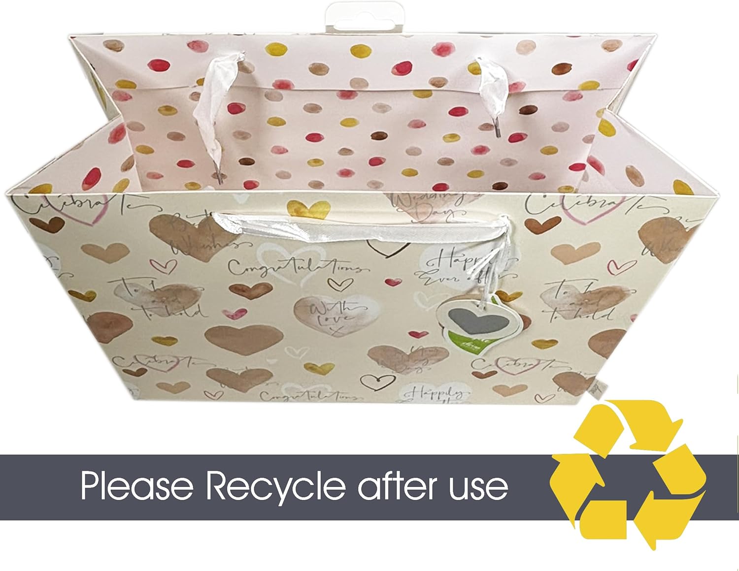 This is a lovely gift bag! It arrived film wrapped and it is really pretty. The design is dots on the inside and hearts on the outside in different colours, and some lovely messages like 'congratulations' 'happily ever after' 'with love' and 'to have and to hold.' The bag is lovely, and is eco friendly and has a lovely gift tag. It is perfect for a wedding gift, and you can also buy matching wrapping paper to wrap the parcel before it goes inside the bag. The selling price is £4.95. It is really good quality, a thick bag with a ribbon handle.