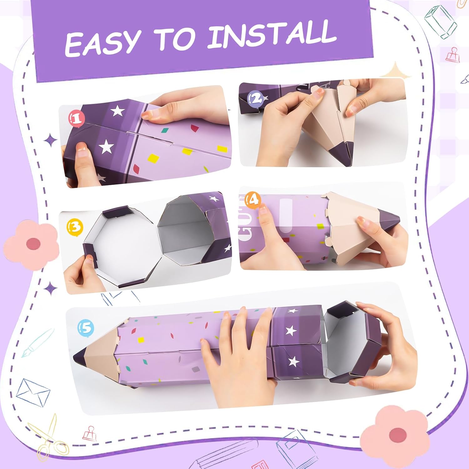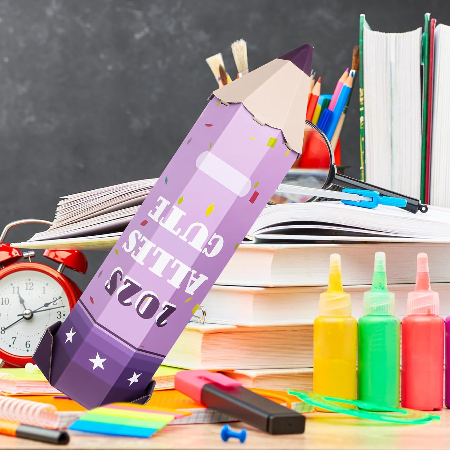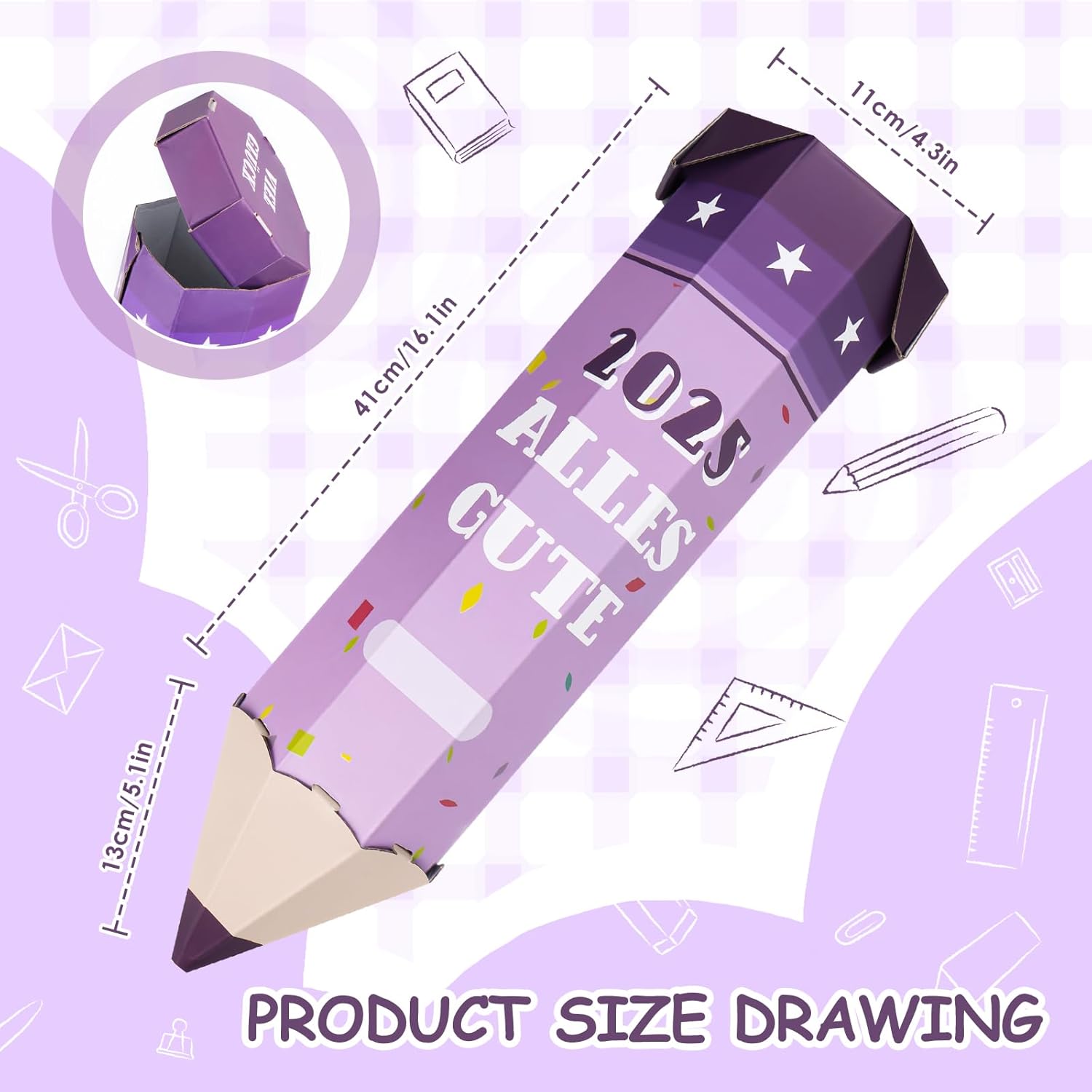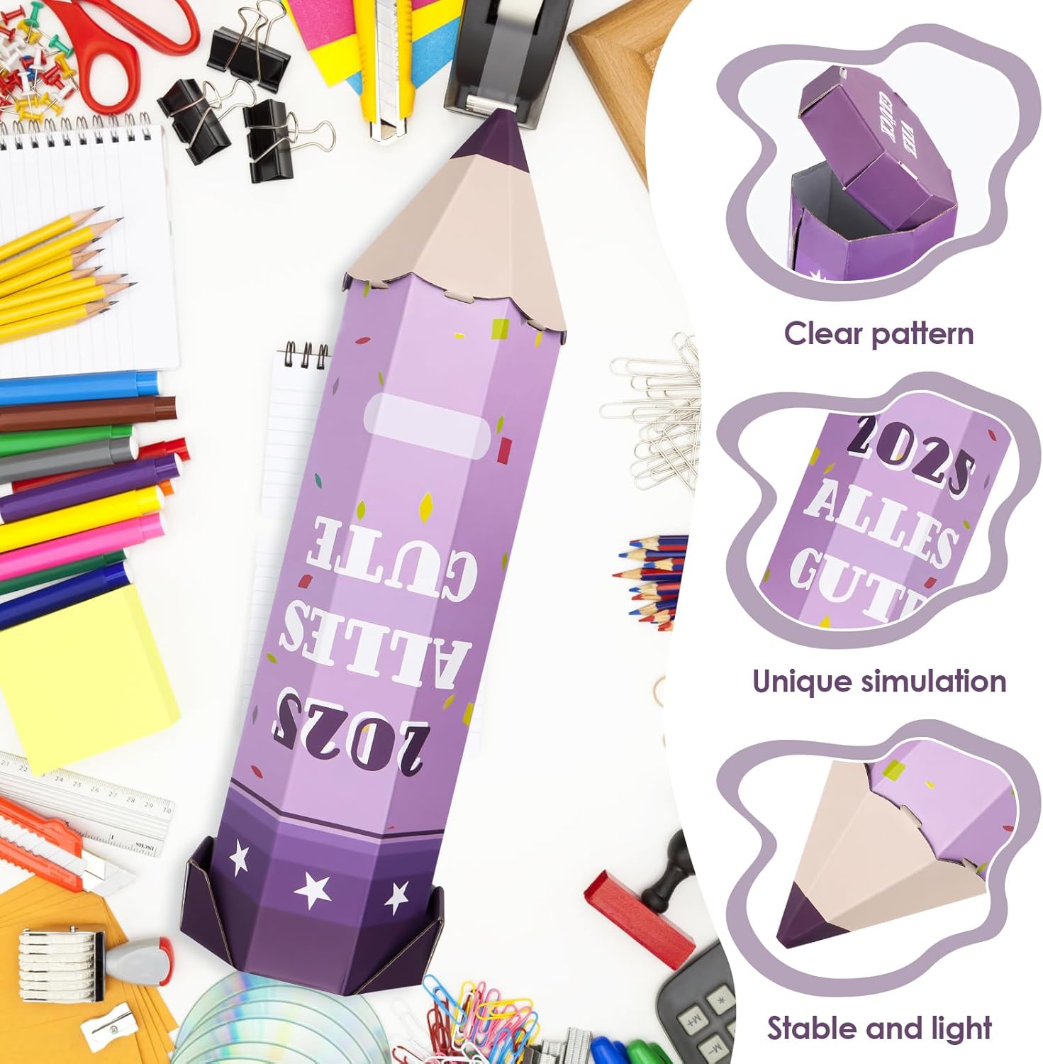 🎓【Regalo creativo per il rientro a scuola】Questi astucci colorati sono un'alternativa affascinante alle classiche confezioni regalo per il rientro a scuola. Queste esclusive scatole portaoggetti per materiale scolastico a forma di matita sono ideali per i nuovi studenti. Con una lunghezza di 41 cm sono perfetti per piccoli regali, dolci o regali per la festa di rientro a scuola. 📕【Design Unico】Questo astuccio 3D colpisce per il suo design raffinato e la forma realistica. La parte superiore e inferiore dell'astuccio si aprono per riporre snack, caramelle, penne, gomme e altri regali. Sulla confezione regalo a matita è stampata la scritta "Alles Süße". Puoi scriverci sopra il nome di tuo figlio e augurargli successo durante tutta la sua carriera educativa. ✏【Assemblaggio rapido】Questo astuccio è facile da usare e veloce da montare. È incredibilmente facile da usare. Piegare prima il corpo della penna lungo la piega, quindi piegare il coperchio inferiore lungo la piega. Infine, inserisci la punta della penna nel foro sul corpo della penna per completare il processo. (Guarda le immagini e il video per ulteriori informazioni.) 📏 【Materiale di alta qualità】 La nostra confezione regalo con cono a matita è realizzata in carta ondulata di alta qualità. È leggero, spazioso, robusto e riutilizzabile. Questa confezione regalo a forma di cono è alta 41 cm e ha un diametro di 10 cm. Questo lo rende un luogo ideale per riporre il materiale scolastico. È un fantastico regalo per il rientro a scuola. 🎁【Regalo Ideale】Questa confezione regalo a forma di cono con parole di benedizione è perfetta come regalo di rientro a scuola per bambini, nipoti e amici. È ideale anche come piccolo organizer per materiale scolastico per fratelli, come regalo per una festa scolastica iniziale o come decorazione creativa per la classe. Il pratico sacchetto regalo a forma di matita presenta divertenti motivi scolastici che incoraggiano l'apprendimento!