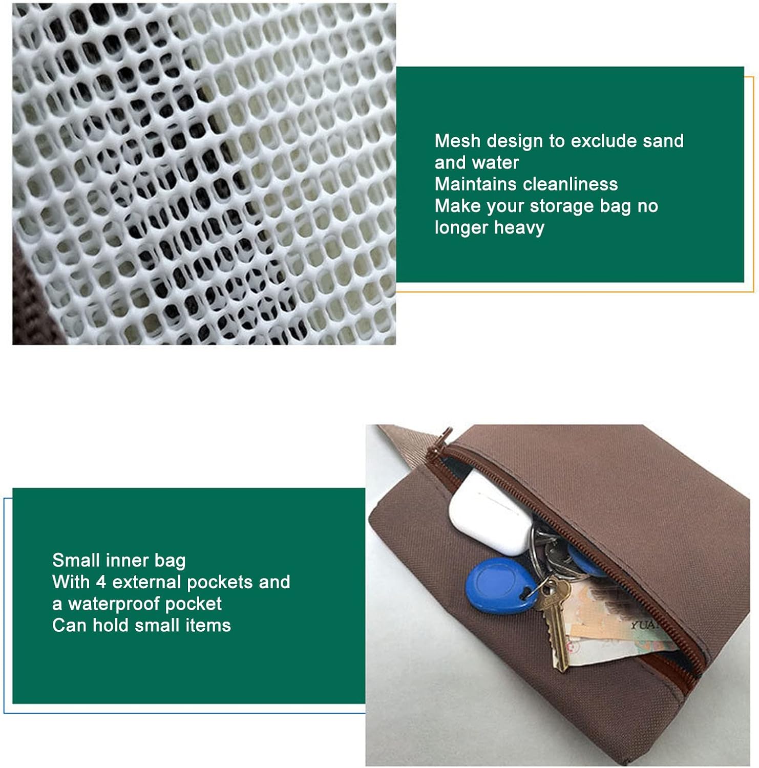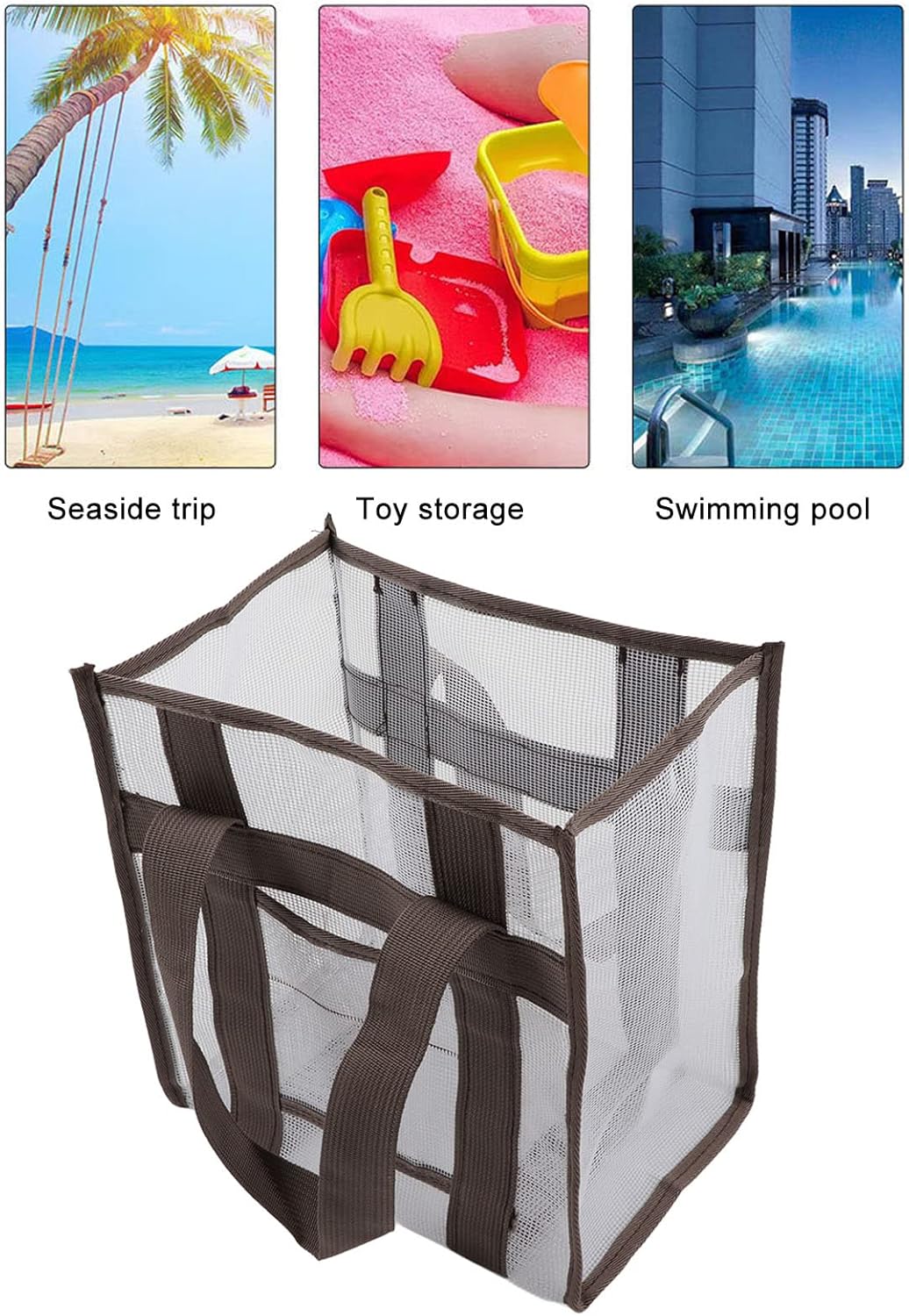 [COMODO DESIGN A RETE] Il design a rete consente un facile scarico dell'acqua di mare e della sabbia, rendendo la borsa leggera. [APERTURA SPAZIOSA] Con un design ad ampia apertura, questa borsa può ospitare molti oggetti ed elementi essenziali per le tue gite in spiaggia. [PANNO OXFORD DUREVOLE] Realizzato in tessuto oxford resistente alla corrosione e durevole, che garantisce una lunga durata. [PORTATILE E COMPATTO] La borsa spiaggia in rete può essere piegata in dimensioni compatte, ideale per riporla in cassetti o valigie con un utilizzo minimo di spazio. [UTILIZZO VERSATILE] Progettato appositamente per vacanze e viaggi, può riporre i giocattoli dei bambini, raccogliere conchiglie e altro ancora, rendendolo un accessorio pratico e versatile.