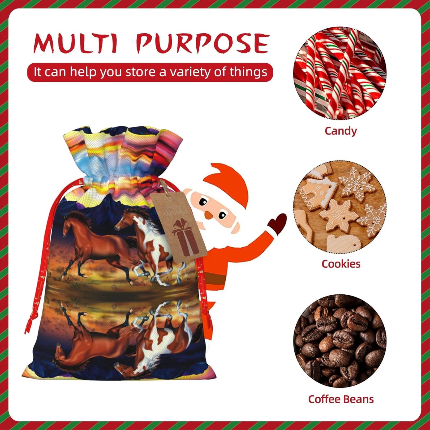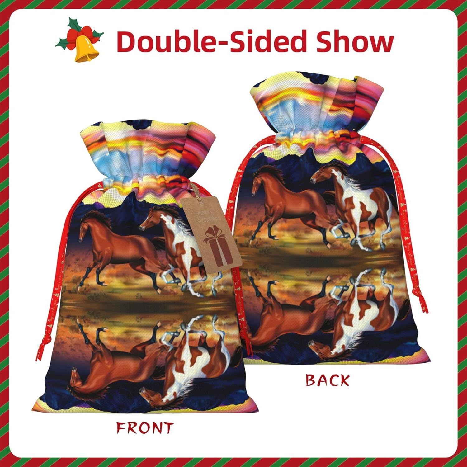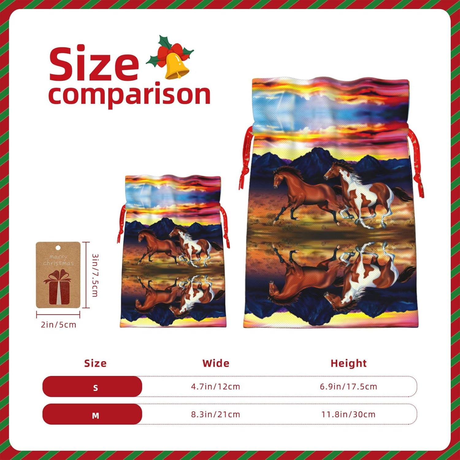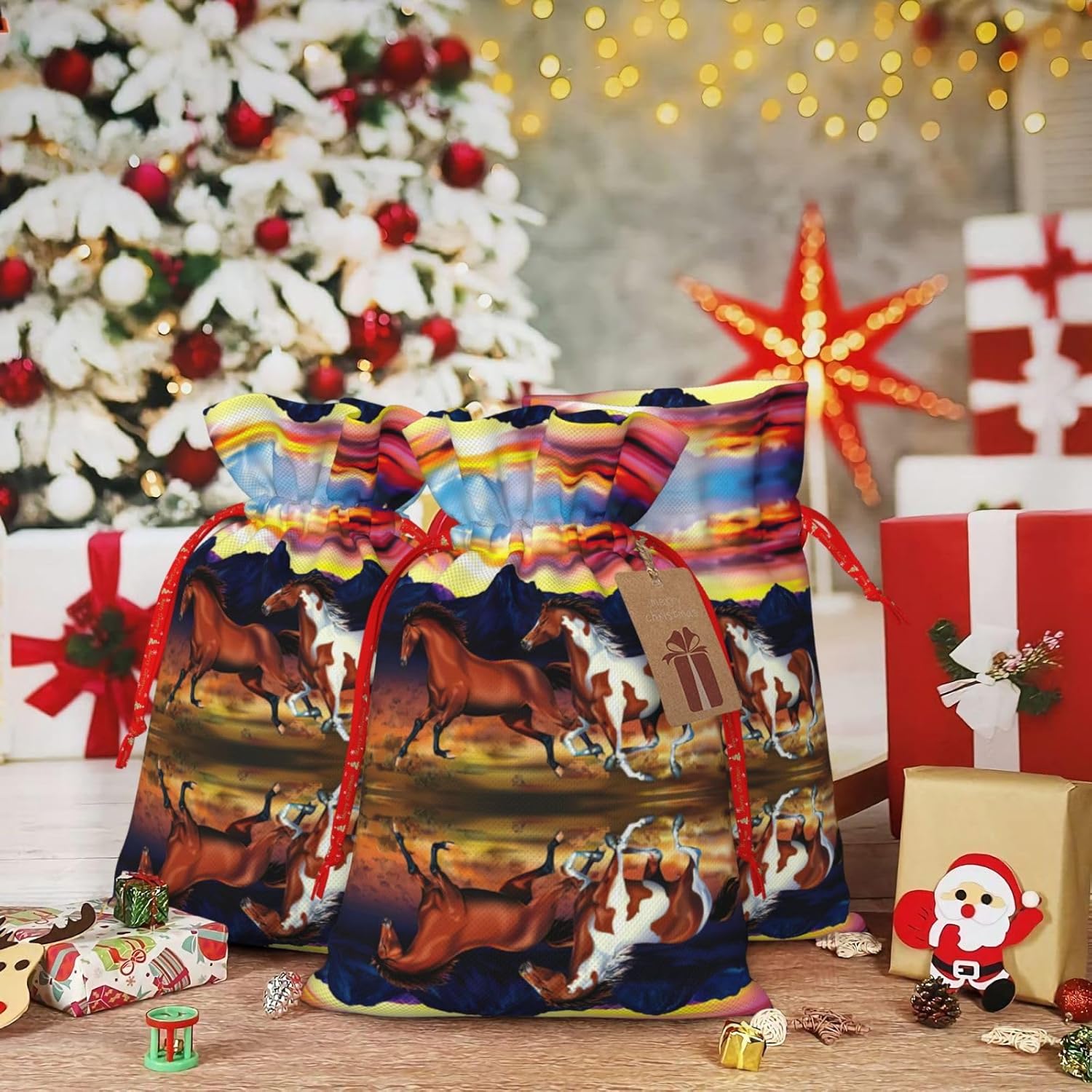 BORSE REGALO DI ALTO VALORE: la borsa per cavalli da corsa è dotata di sacchetti regalo con cordoncini colorati ed etichette. I sacchetti regalo sono aggiornati con un design con chiusura a coulisse, sacchetti regalo realizzati in poliestere, resistenti e riutilizzabili. Non si strappano come la carta, ottimi per incartare i regali. 10 secondi per incartare un regalo: la borsa del cavallo da corsa per confezionare facilmente i regali, è facile da usare, basta inserire il regalo nelle buste, far scorrere l'etichetta regalo attraverso il nastro, tirare il nastro, annodare un fiocco e il gioco è fatto. Puoi evitare il fastidio associato a carta da imballaggio, forbici, nastro adesivo e nastro, risparmiare tempo e molto conveniente. Dimensioni del sacchetto regalo: i sacchetti regalo in 2 dimensioni possono soddisfare le preferenze di diverse persone e sono sufficienti per l'uso quotidiano e la festa di Natale. La S misura 12 x 17,5 cm e la M misura 12 x 30 cm. Sacchetti regalo in formati assortiti sfusi, perfetti per confezionare regali di diverse dimensioni. REGALO IDEALE: questi sacchetti regalo per cavalli in corsa possono essere riutilizzati molte volte. Un set di sacchetti regalo riutilizzabili sarà un'aggiunta meravigliosa a qualsiasi regalo e migliorerà l'esperienza complessiva del regalo. Inoltre, abbiamo rinforzato il fondo per una maggiore stabilità e una struttura robusta con carichi pesanti. Non facile da rompere per un uso durevole e duraturo. Sacchetti regalo multifunzionali: questi sacchetti regalo di Natale a forma di cavallo possono essere utilizzati per conservare regali di Natale, giocattoli, bambole, cappelli di Natale, caramelle e regali durante la festa di Natale. Conservare i regali in questa borsa darà ai bambini più sorprese perché non sanno cosa c'è dentro.