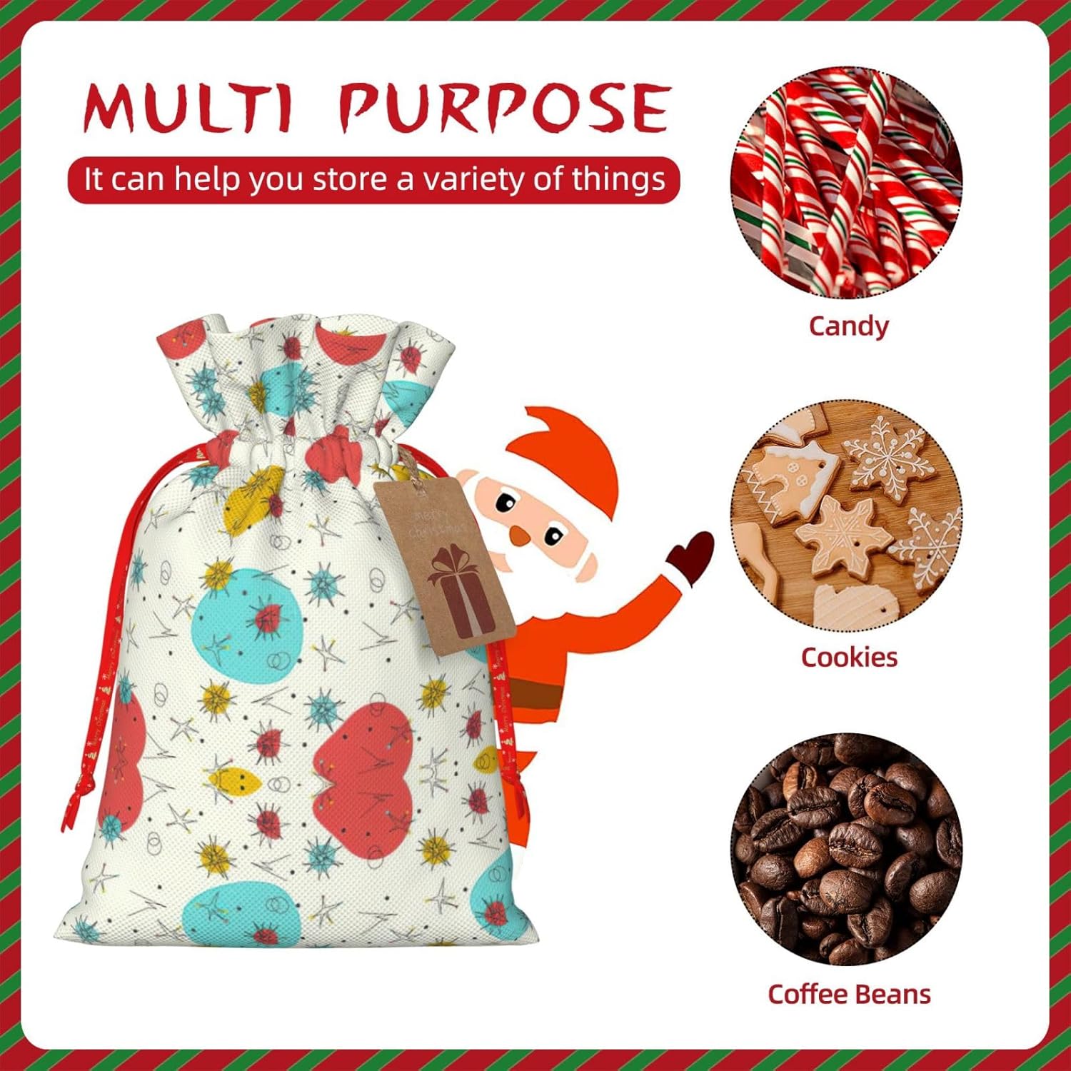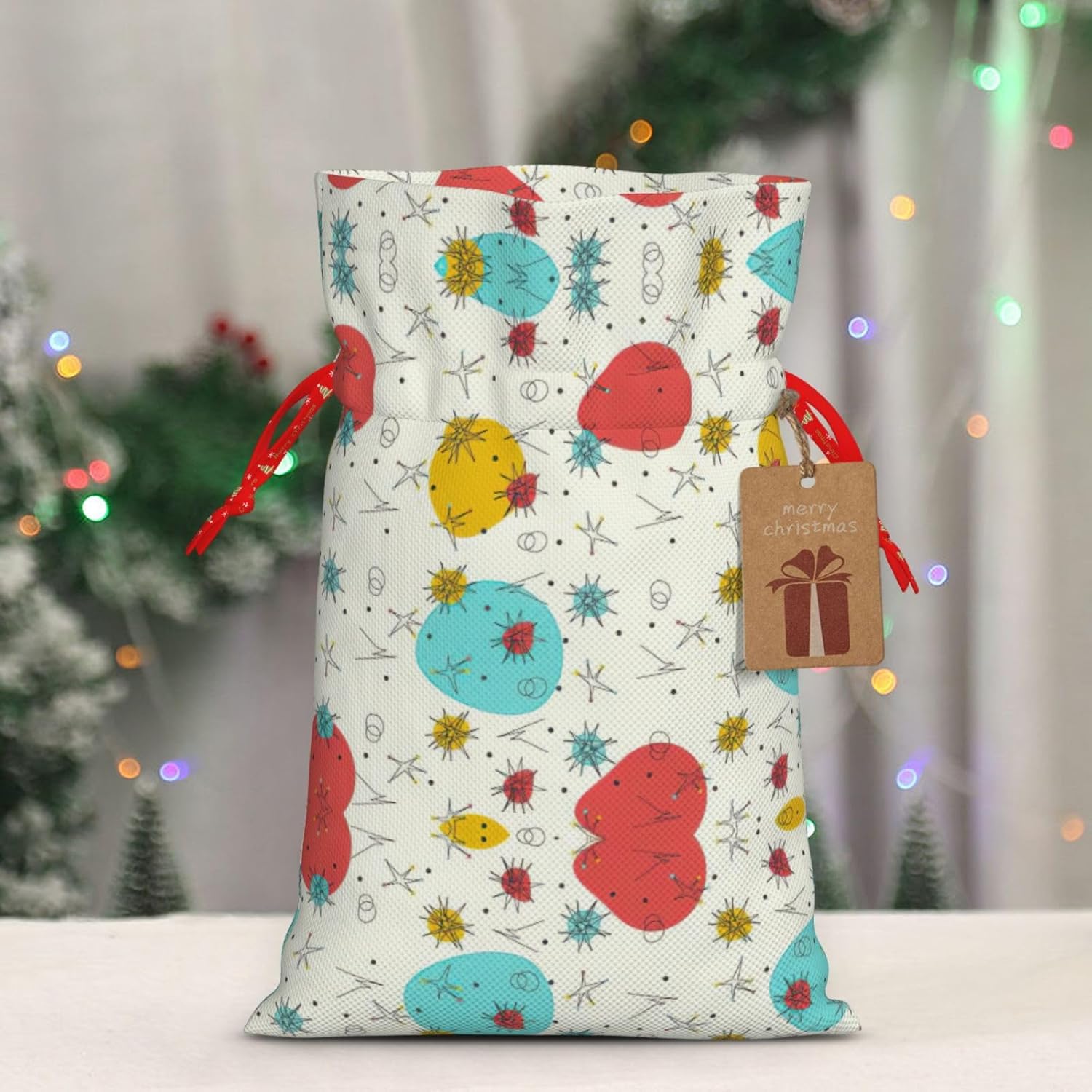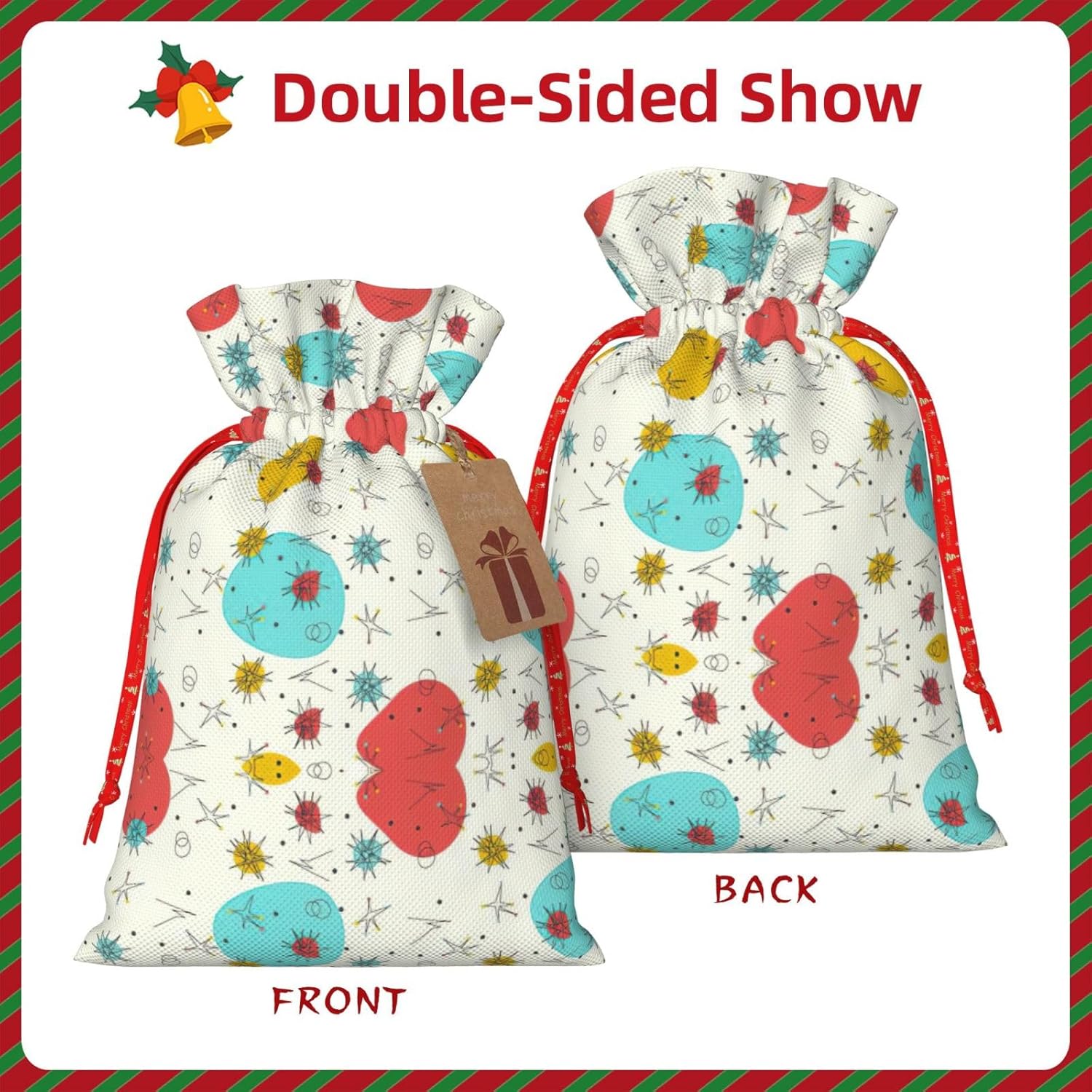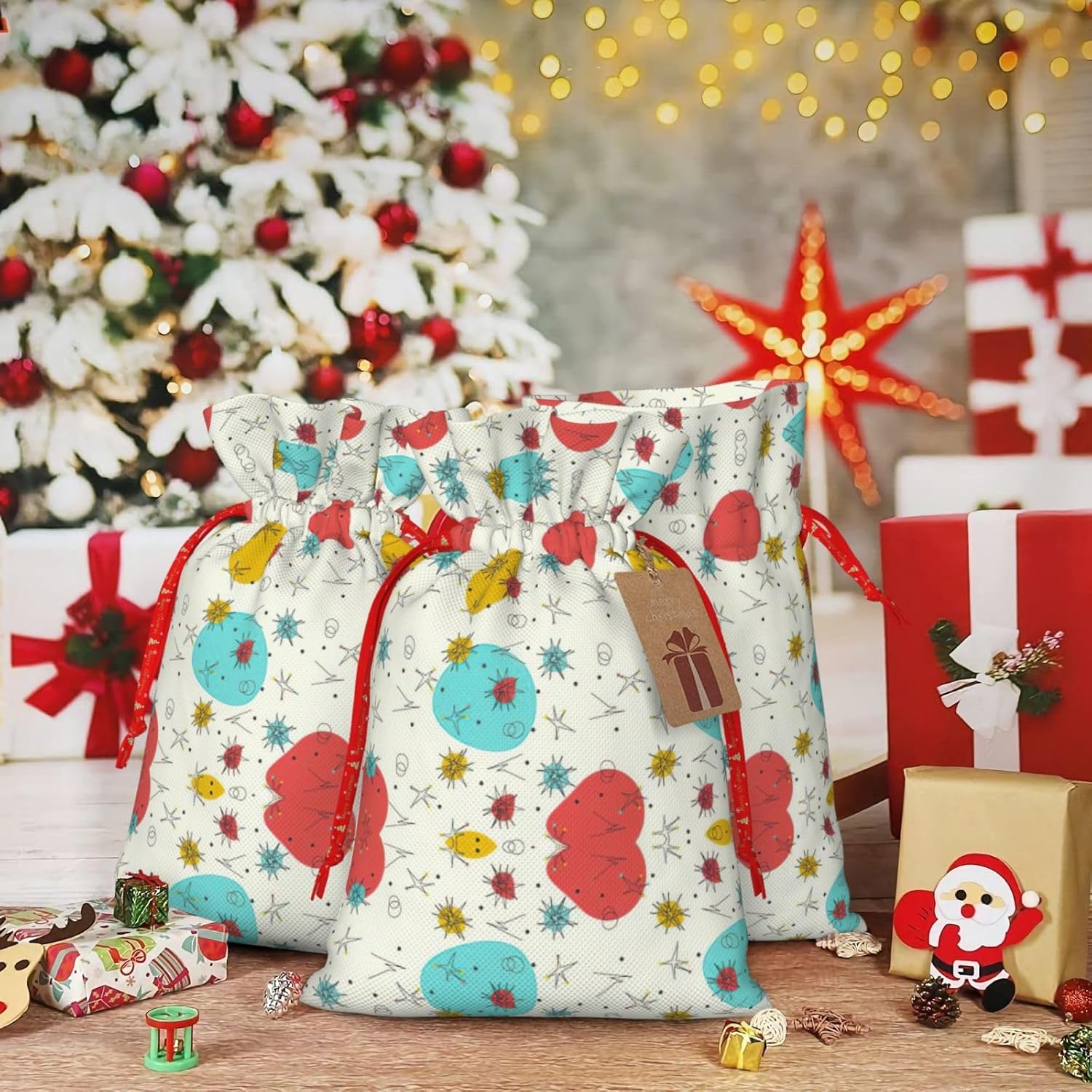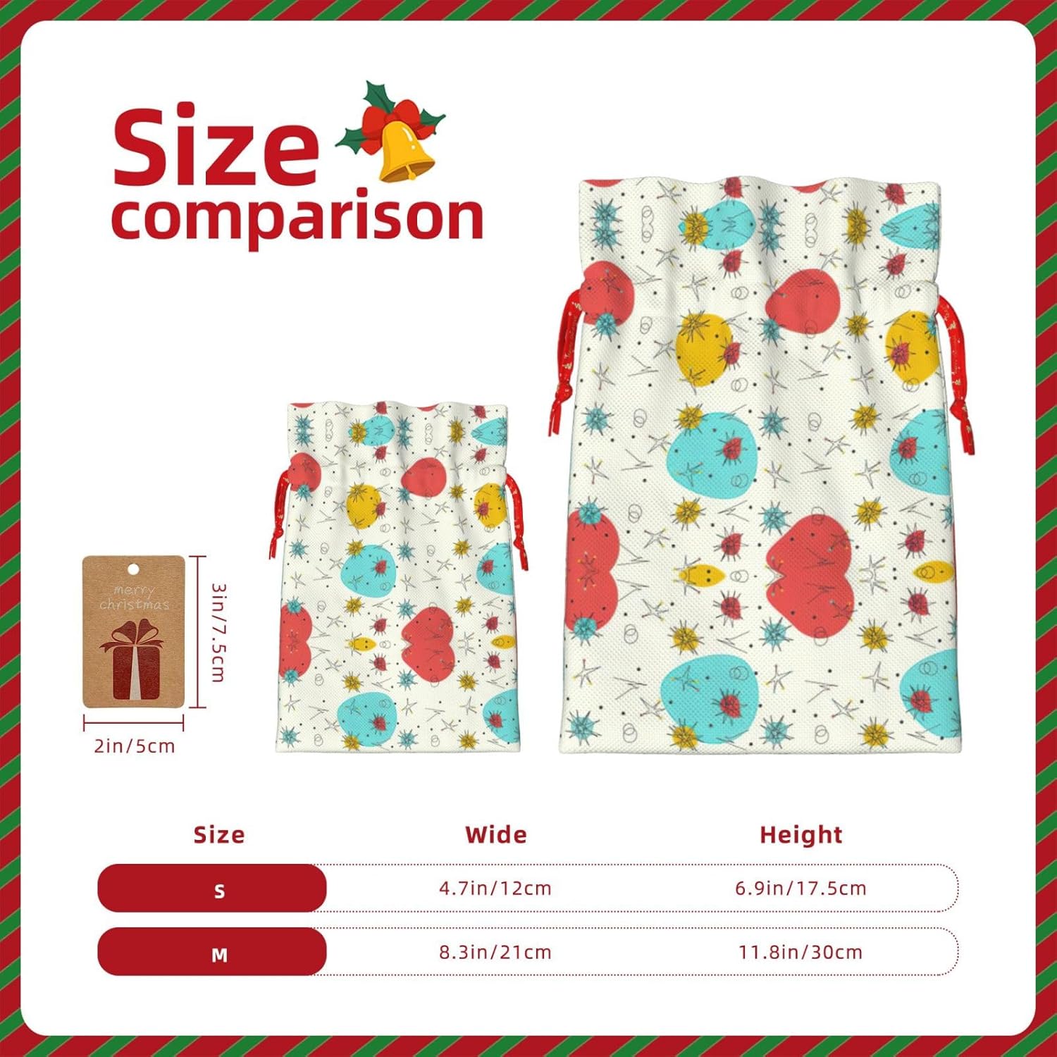 BORSE REGALO DI ALTO VALORE: la graziosa borsa con motivo presenta sacchetti regalo con cordoncini colorati ed etichette. I sacchetti regalo sono aggiornati con un design con chiusura a coulisse, sacchetti regalo realizzati in poliestere, resistenti e riutilizzabili. Non si strappano come la carta, ottimi per incartare i regali. 10 secondi per incartare un regalo: la graziosa borsa fantasia per confezionare facilmente i regali, è facile da usare, basta inserire il regalo nelle buste, far scorrere l'etichetta regalo attraverso il nastro, tirare il nastro, annodare un fiocco e il gioco è fatto. Puoi evitare il fastidio associato a carta da imballaggio, forbici, nastro adesivo e nastro, risparmiare tempo e molto conveniente. Dimensioni del sacchetto regalo: i sacchetti regalo in 2 dimensioni possono soddisfare le preferenze di diverse persone e sono sufficienti per l'uso quotidiano e la festa di Natale. La S misura 12 x 17,5 cm e la M misura 12 x 30 cm. Sacchetti regalo in formati assortiti sfusi, perfetti per confezionare regali di diverse dimensioni. Regalo nel regalo: questi graziosi sacchetti regalo possono essere riutilizzati molte volte. Un set di sacchetti regalo riutilizzabili sarà un'aggiunta meravigliosa a qualsiasi regalo e migliorerà l'esperienza complessiva del regalo. Inoltre, abbiamo rinforzato il fondo per una maggiore stabilità e una struttura robusta con carichi pesanti. Non facile da rompere per un uso durevole e duraturo. Sacchetti regalo multifunzionali: questi graziosi sacchetti regalo di Natale possono essere utilizzati per conservare regali di Natale, giocattoli, bambole, cappelli di Natale, caramelle e regali durante una festa di Natale. Conservare i regali in questa borsa darà ai bambini più sorprese perché non sanno cosa c'è dentro.