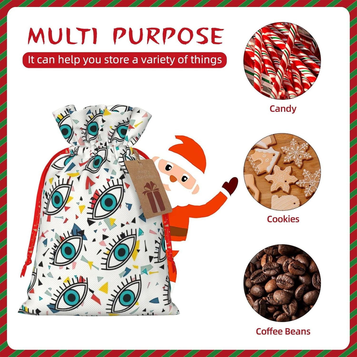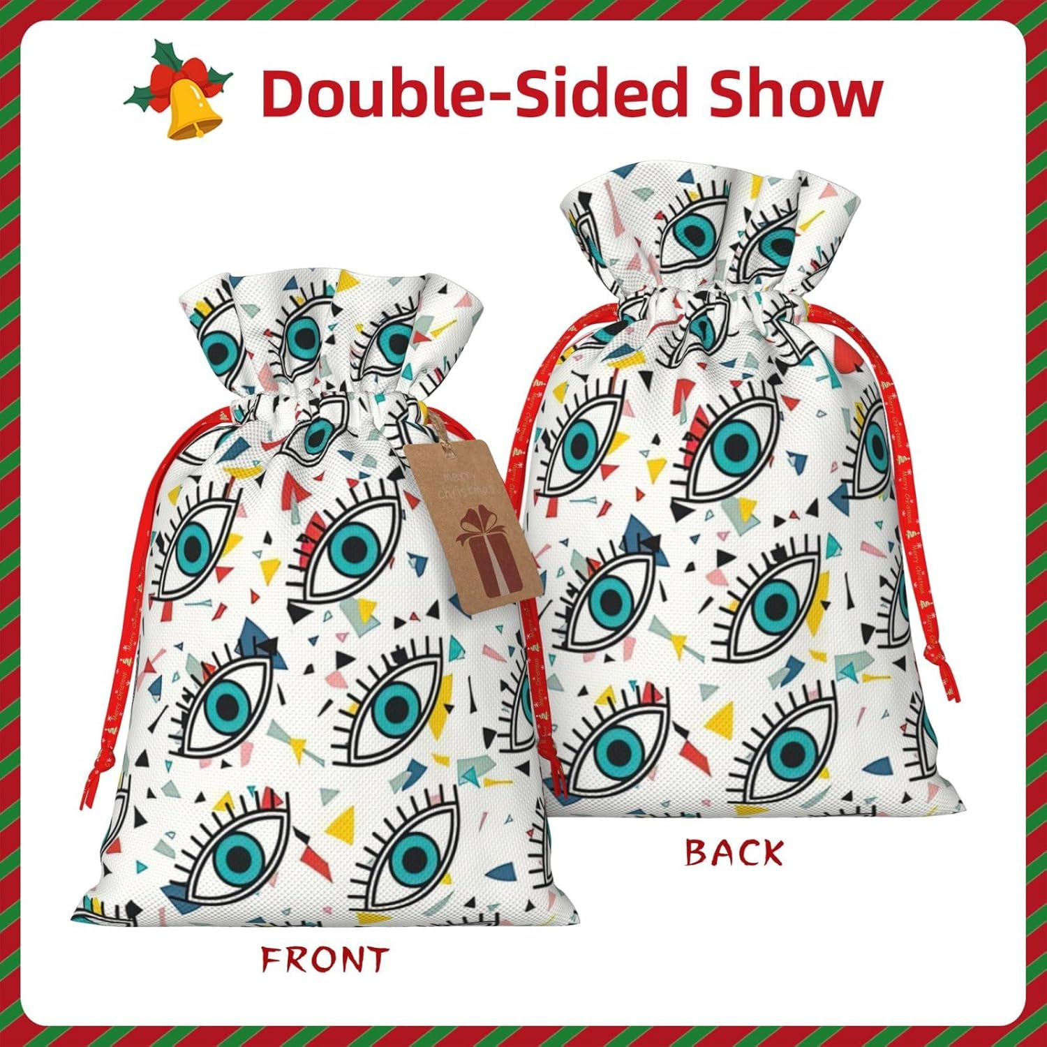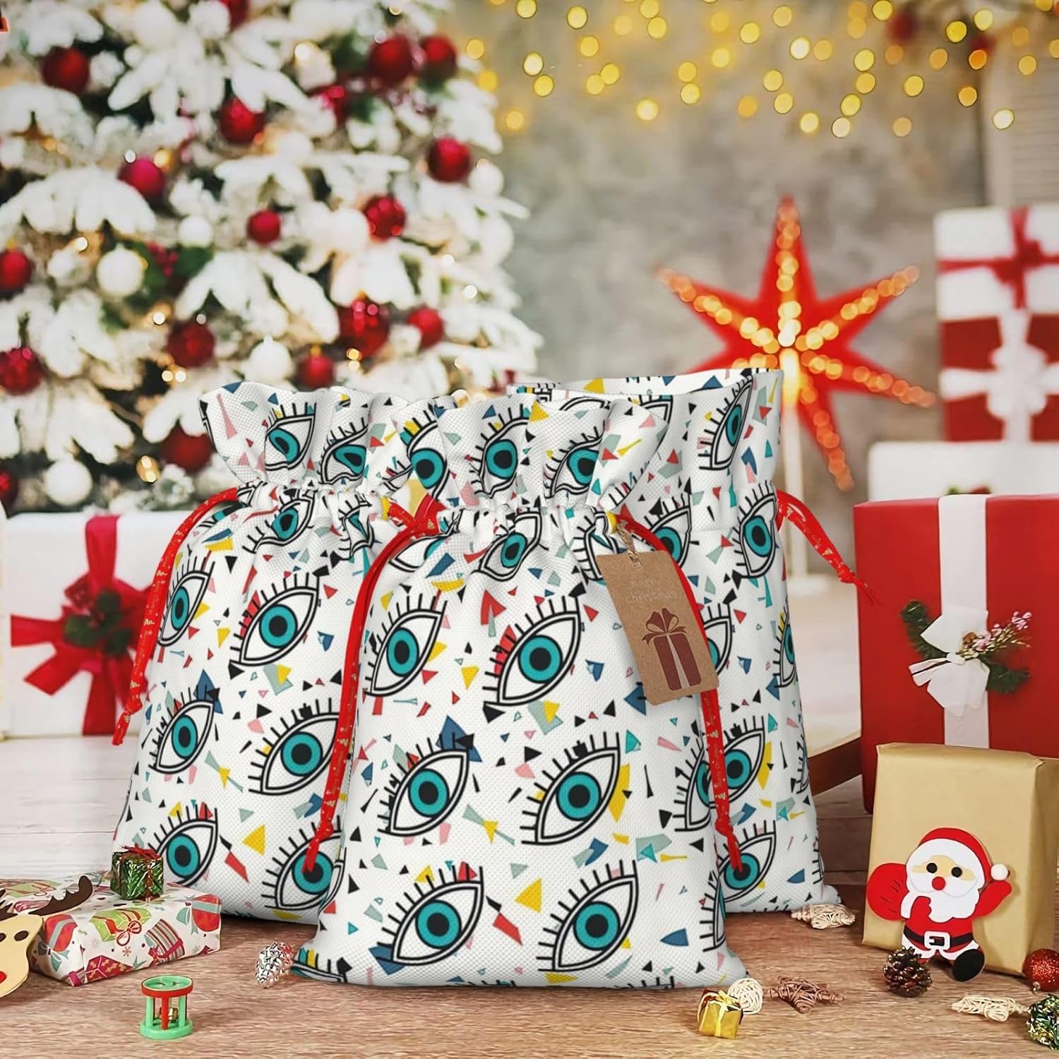 BORSE REGALO DI ALTO VALORE: la borsa per gli occhi è dotata di sacchetti regalo con cordoncini colorati ed etichette. I sacchetti regalo sono aggiornati con un design con chiusura a coulisse, sacchetti regalo realizzati in poliestere, resistenti e riutilizzabili. Non si strappano come la carta, ottimi per incartare i regali. 10 secondi per incartare un regalo: la borsa con gli occhi per confezionare facilmente i regali, è facile da usare, basta inserire il regalo nelle buste, far scorrere l'etichetta regalo attraverso il nastro, tirare il nastro, annodare un fiocco e il gioco è fatto. Puoi evitare il fastidio associato a carta da imballaggio, forbici, nastro adesivo e nastro, risparmiare tempo e molto conveniente. Dimensioni del sacchetto regalo: i sacchetti regalo in 2 dimensioni possono soddisfare le preferenze di diverse persone e sono sufficienti per l'uso quotidiano e la festa di Natale. La S misura 12 x 17,5 cm e la M misura 12 x 30 cm. Sacchetti regalo in formati assortiti sfusi, perfetti per confezionare regali di diverse dimensioni. Regalo nel regalo: questi sacchetti regalo per gli occhi possono essere riutilizzati molte volte. Un set di sacchetti regalo riutilizzabili sarà un'aggiunta meravigliosa a qualsiasi regalo e migliorerà l'esperienza complessiva del regalo. Inoltre, abbiamo rinforzato il fondo per una maggiore stabilità e una struttura robusta con carichi pesanti. Non facile da rompere per un uso durevole e duraturo. Sacchetti regalo multifunzionali: questi sacchetti regalo di Natale possono essere utilizzati per conservare regali di Natale, giocattoli, bambole, cappelli di Natale, caramelle e regali durante una festa di Natale. Conservare i regali in questa borsa darà ai bambini più sorprese perché non sanno cosa c'è dentro.