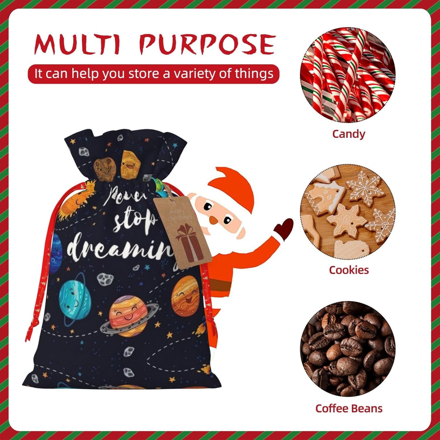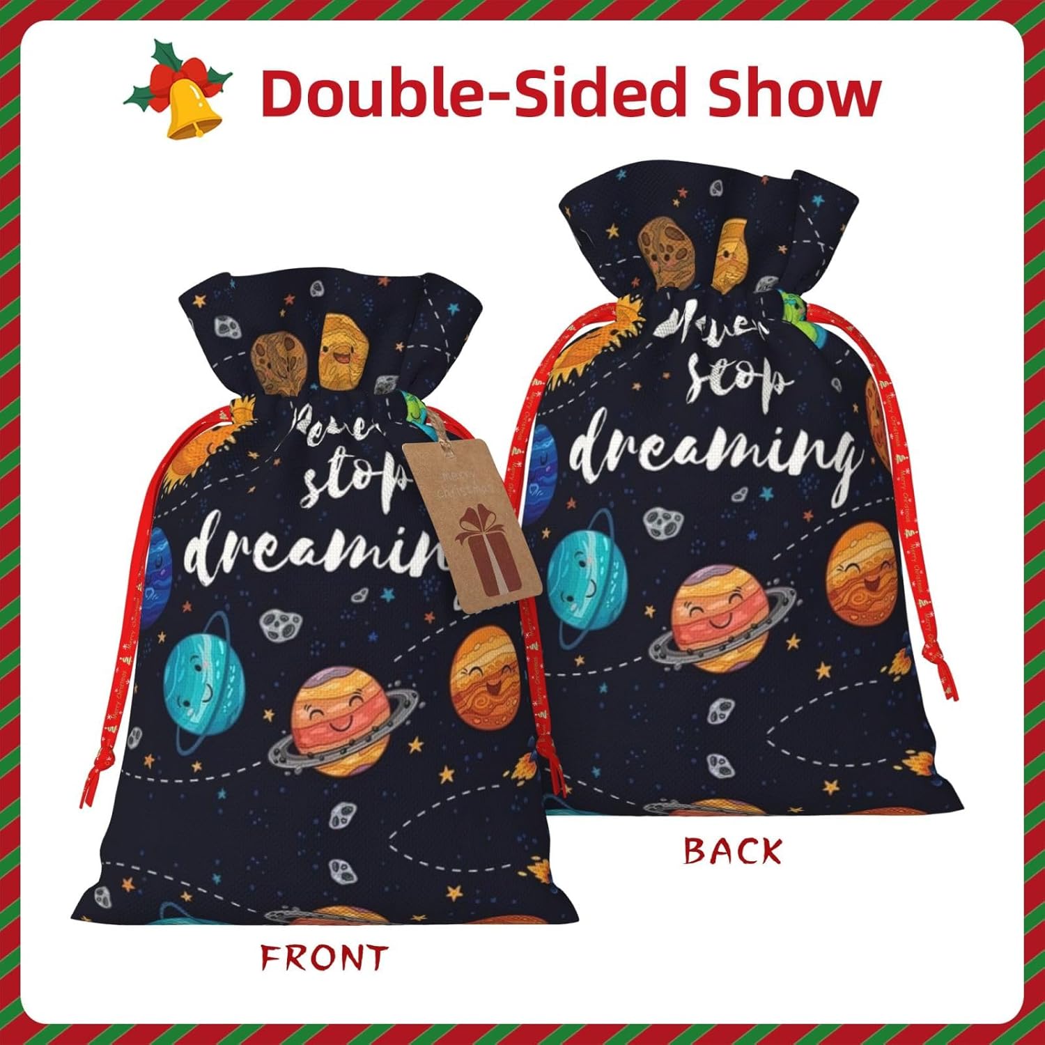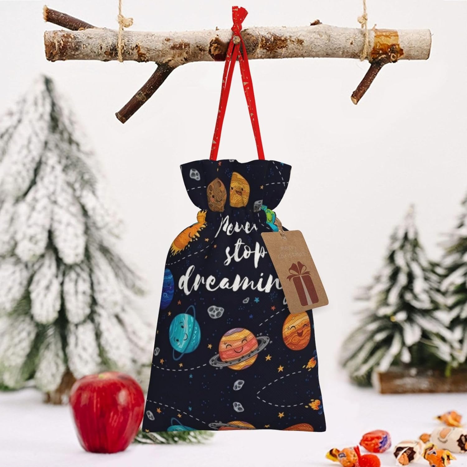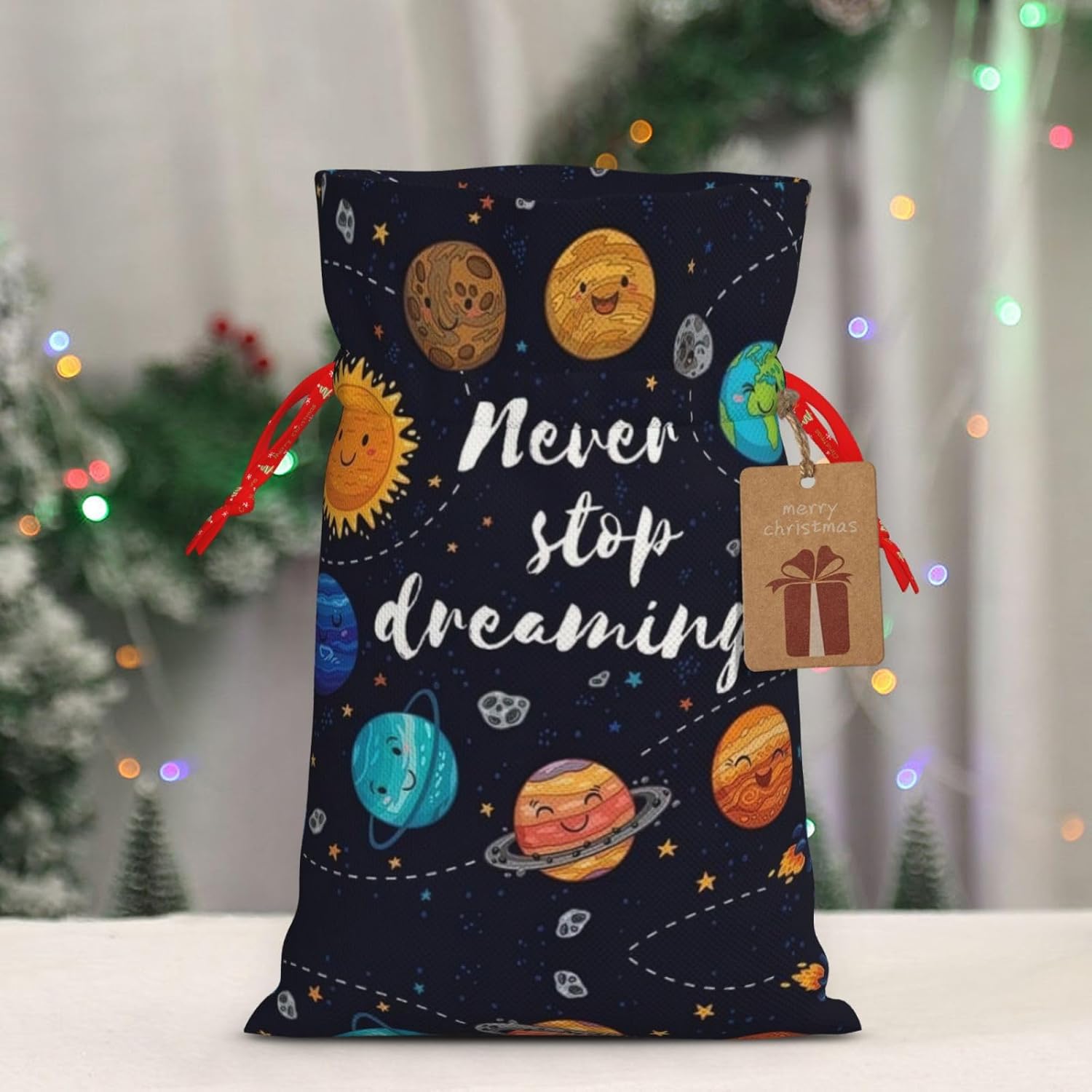BORSE REGALO DI ALTO VALORE: la graziosa borsa Planet è dotata di sacchetti regalo con cordoncini colorati ed etichette. I sacchetti regalo sono aggiornati con un design con chiusura a coulisse, sacchetti regalo realizzati in poliestere, resistenti e riutilizzabili. Non si strappano come la carta, ottimi per incartare i regali. 10 secondi per incartare un regalo: la simpatica borsa planetaria per impacchettare facilmente i regali, è facile da usare, basta inserire il regalo nelle buste, far scorrere l'etichetta regalo attraverso il nastro, tirare il nastro, annodare un fiocco e il gioco è fatto. Puoi evitare il fastidio associato a carta da imballaggio, forbici, nastro adesivo e nastro, risparmiare tempo e molto conveniente. Dimensioni del sacchetto regalo: i sacchetti regalo in 2 dimensioni possono soddisfare le preferenze di diverse persone e sono sufficienti per l'uso quotidiano e la festa di Natale. La S misura 12 x 17,5 cm e la M misura 12 x 30 cm. Sacchetti regalo in formati assortiti sfusi, perfetti per confezionare regali di diverse dimensioni. REGALO NEL REGALO: questi simpatici sacchetti regalo Planet possono essere riutilizzati molte volte. Un set di sacchetti regalo riutilizzabili sarà un'aggiunta meravigliosa a qualsiasi regalo e migliorerà l'esperienza complessiva del regalo. Inoltre, abbiamo rinforzato il fondo per una maggiore stabilità e una struttura robusta con carichi pesanti. Non facile da rompere per un uso durevole e duraturo. Sacchetti regalo multifunzionali: questi graziosi sacchetti regalo natalizi del pianeta possono essere utilizzati per conservare regali di Natale, giocattoli, bambole, cappelli natalizi, caramelle e regali durante una festa di Natale. Conservare i regali in questa borsa darà ai bambini più sorprese perché non sanno cosa c'è dentro.