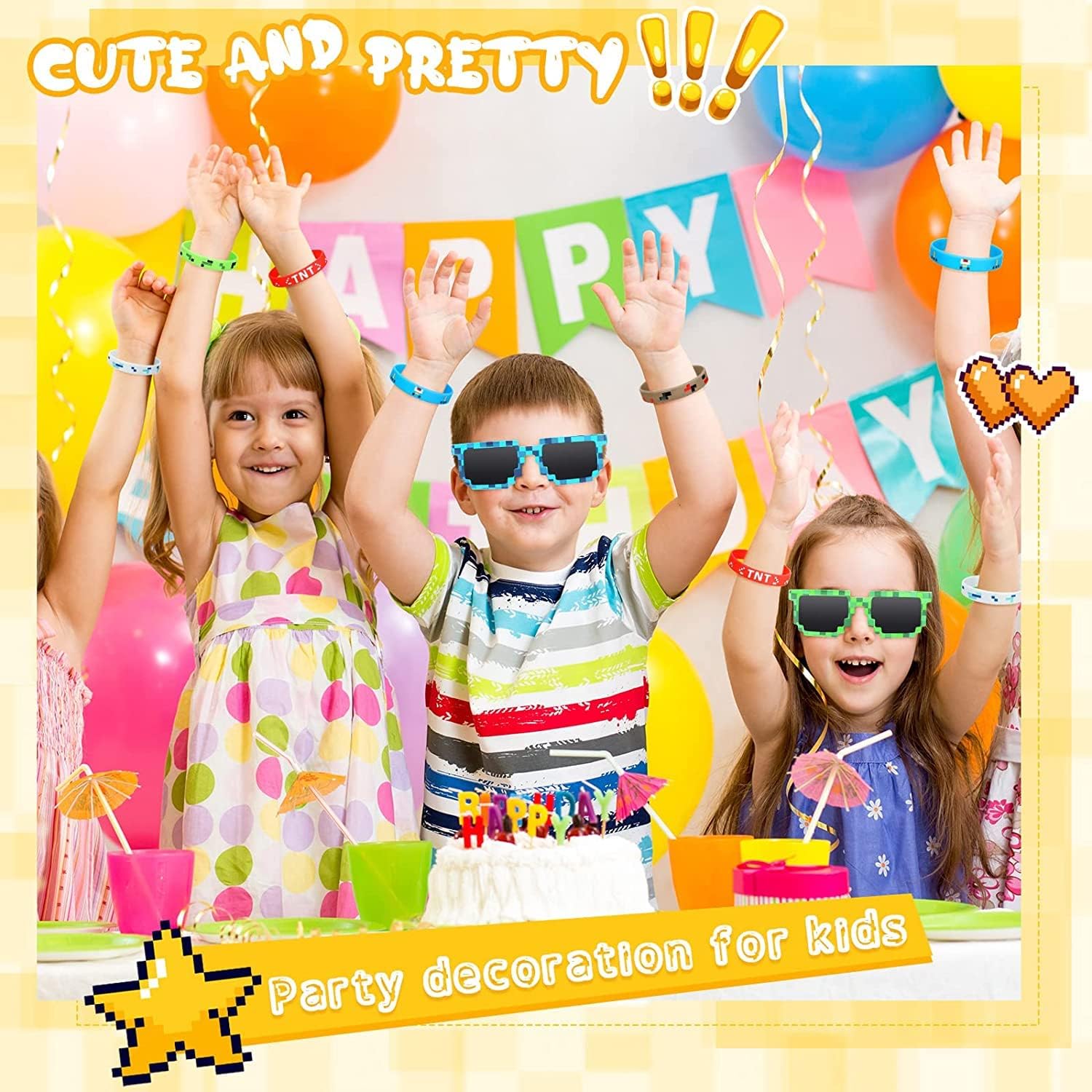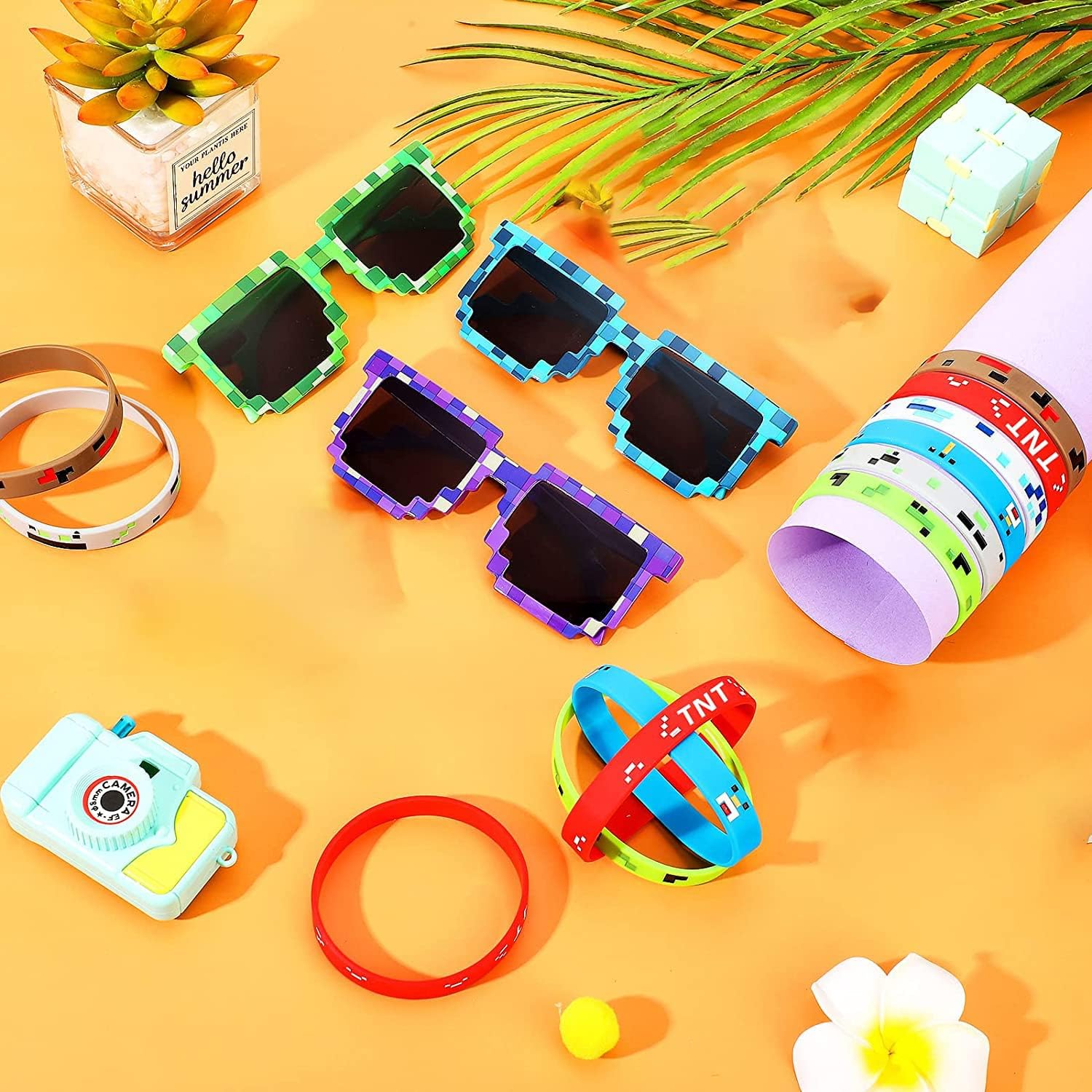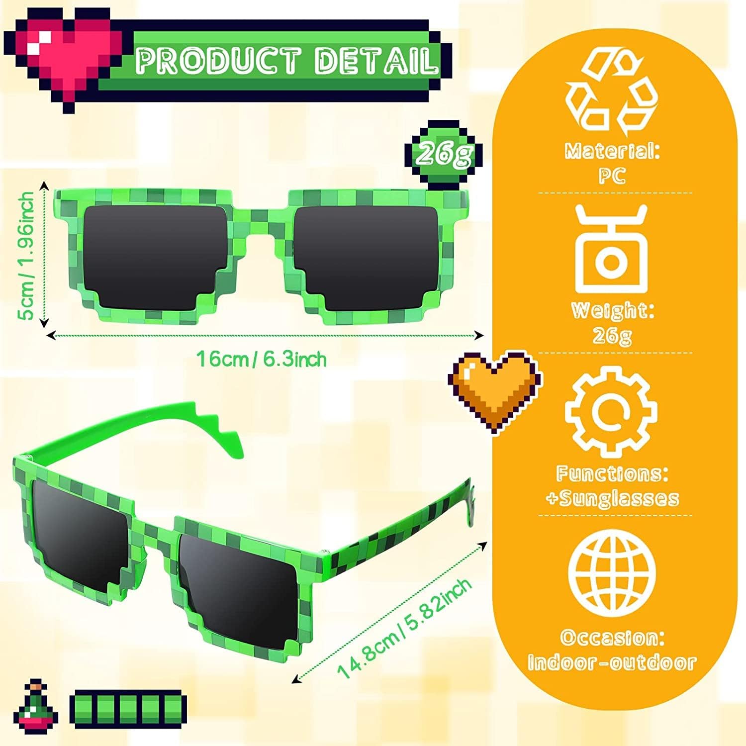 Cosa è incluso: Pixel Party Favours inclusi 12 braccialetti con personaggi in stile minatore pixelati e occhiali da sole pixelati in 6 pezzi, questa è una bella fornitura per feste di videogiochi per i giocatori che hanno una festa di compleanno di minatori in stile pixel Pixelated Miner Design: si tratta di 6 diversi stili di braccialetti a tema pixelati, occhiali da sole per giocatori pixel a 6 colori; Colori vivaci combinati con il design pixelato del minatore, sembrano più creativi e accattivanti Descrizione delle dimensioni: I braccialetti con personaggi in stile pixel sono tutti della stessa dimensione, 2,56 pollici di diametro, 0,5 pollici di larghezza; Gli occhiali da sole Party Pixel sono anche di dimensioni universali per la maggior parte delle persone, ti assicuriamo di acquistare un bel regalo per la festa: questi braccialetti in silicone e occhiali da sole a tema pixelati sono fantastici riempitivi per borse regalo per gli amanti dei videogiochi o premi per feste di carnevale o balli estivi. Kit tutto in uno: il kit per feste minerarie contiene popolari elementi pixelati per una festa indimenticabile, può ravvivare efficacemente la tua festa, quindi è adatto per la maggior parte delle feste a tema minatore, come feste arcade, feste con videogiochi, ecc. applicabili.