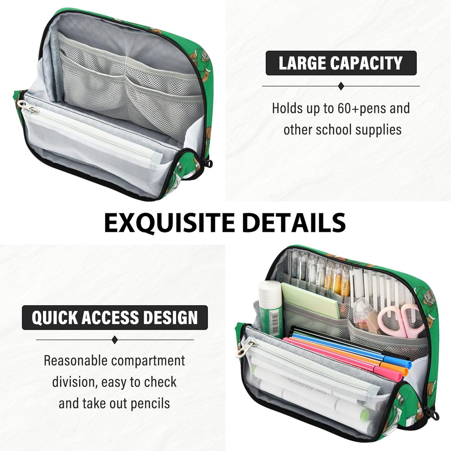 Funzione di supporto convertibile: con un intelligente sistema pieghevole e a scatto, l'astuccio estetico sta in piedi sulla scrivania, consentendo di organizzare e accedere ai tuoi oggetti senza problemi Selezione intelligente del tessuto: i simpatici astucci sono realizzati in nylon robusto che offre flessibilità e protezione, garantendo che gli strumenti quotidiani rimangano al sicuro senza aggiungere ingombro Interni multiscomparti: con una spaziosa tasca principale, una tasca in rete con cerniera e una tasca extra, la custodia con cerniera per il trucco mantiene penne, appunti e strumenti ordinatamente ordinati e a portata di mano Un sacchetto, molti scopi: l'astuccio colorato passa facilmente da un astuccio per la scuola, un astuccio per il trucco o un porta attrezzi da viaggio, ideale per studenti, professionisti e creativi Ideale come regalo: sia per un giovane studente, un artista o un amico in viaggio, l'astuccio può essere personalizzato con testo o immagini per creare un ricordo memorabile