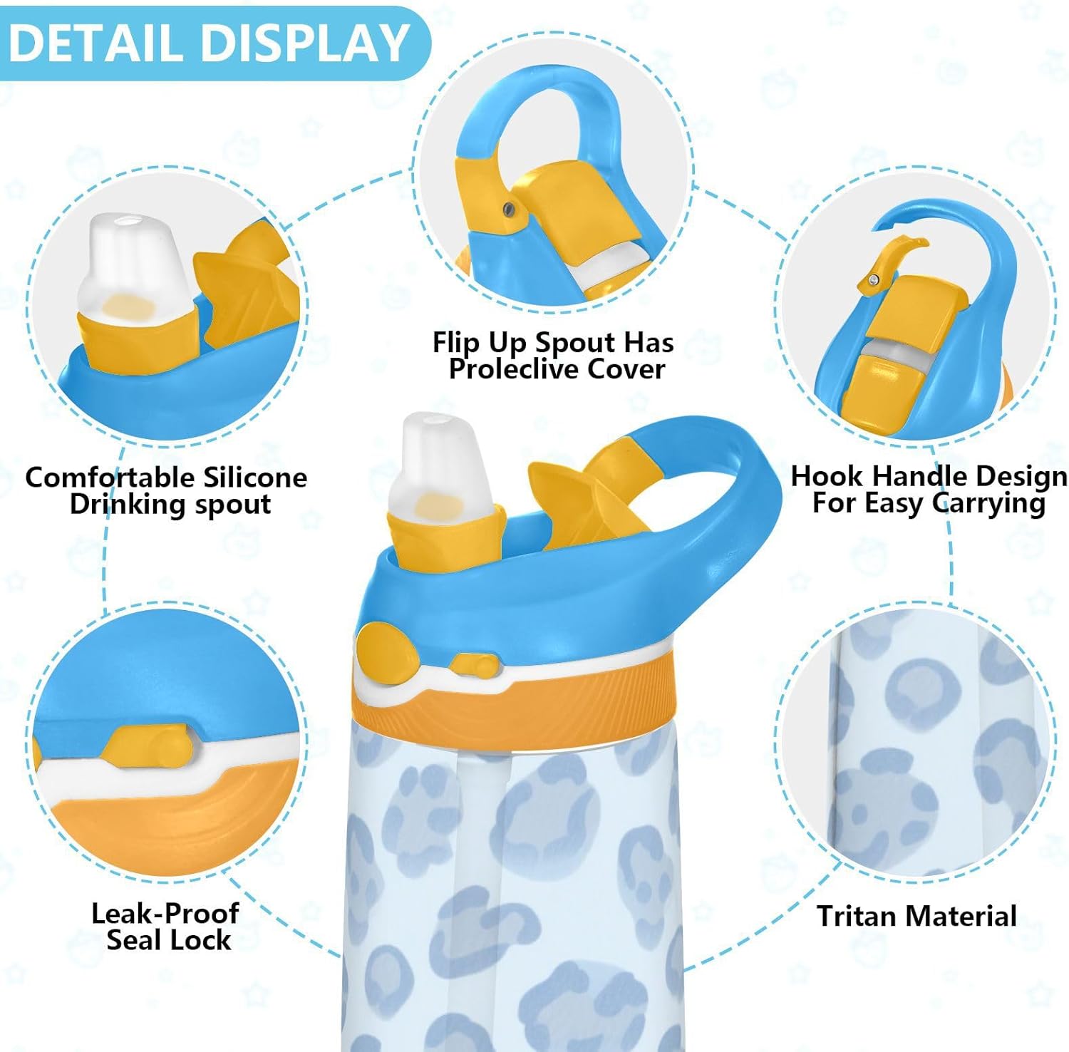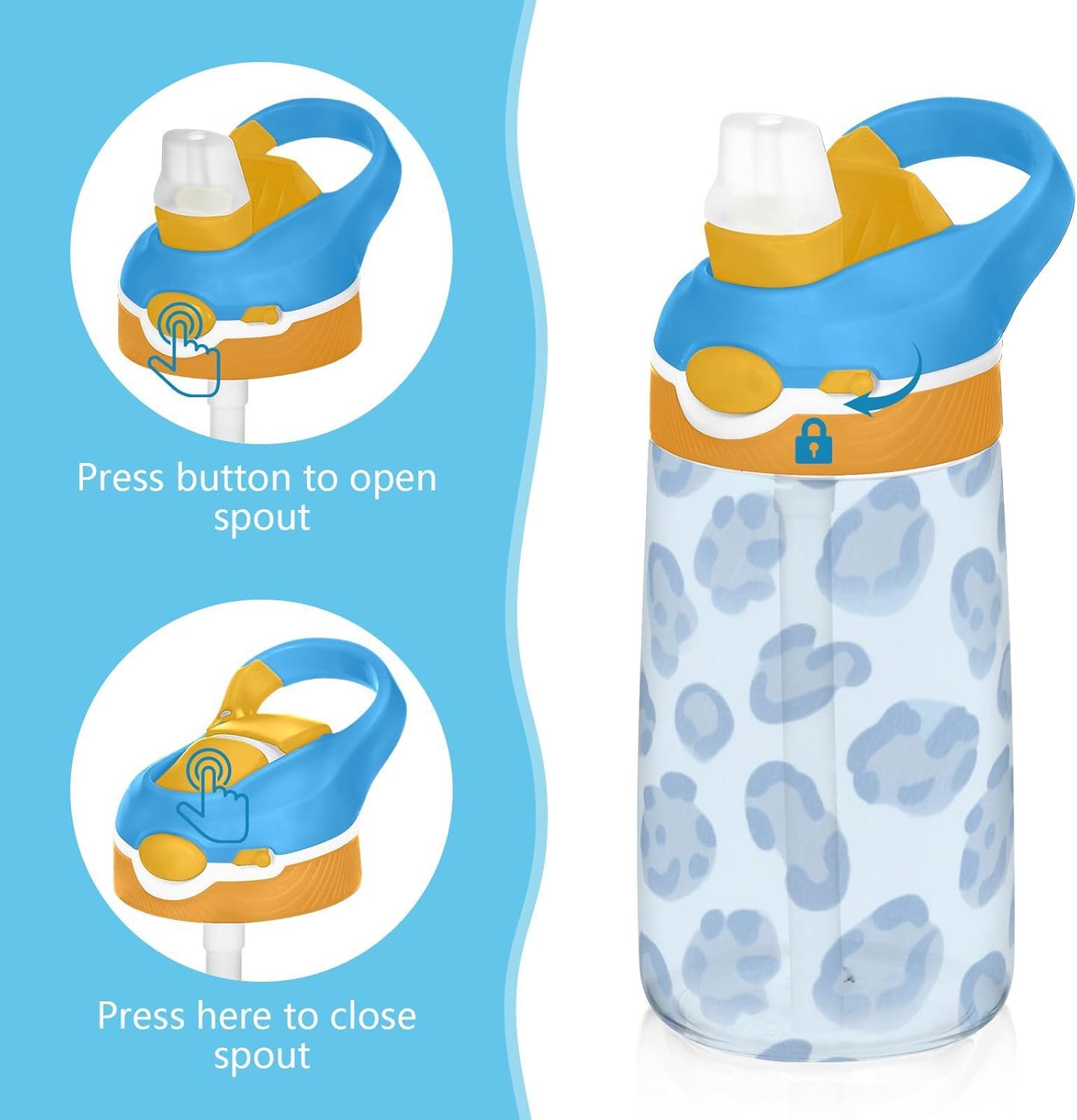 Materiali: questa borraccia per bambini da 480 ml (16 cm di lunghezza, 7,5 cm di larghezza) combina tritan e silicone alimentare. per la pratica sportiva o i giorni scolastici, è sicuro per i bambini da usare tutti i giorni. Non adatto a bambini di età inferiore ai 3 anni! Design portatile: l'ampio manico è facile da impugnare per i bambini e il gancio del coperchio consente di attaccare le bottiglie d'acqua sportive agli zaini. Niente più bottiglie perse durante le gite sul campo o le attività dopo la scuola. Funzionamento con una sola mano: il becco d'anatra si adatta alla bocca dei bambini, con una copertura antipolvere. L'interruttore a pulsante della borraccia per bambini è semplice da usare con una sola mano, in modo che i bambini possano bere mentre tengono una palla o un notebook. Previene le perdite: il blocco a pulsante blocca l'apertura accidentale del becco d'anatra. Mantiene le bevande all'interno, proteggendo zaini e vestiti durante i pendolari o il gioco. Facile pulizia: tutte le parti della borraccia per bambini sono rimovibili per una pulizia accurata senza sporcare. Usa un detergente neutro e acqua calda: semplice per i genitori mantenere la pulizia per l'uso quotidiano.