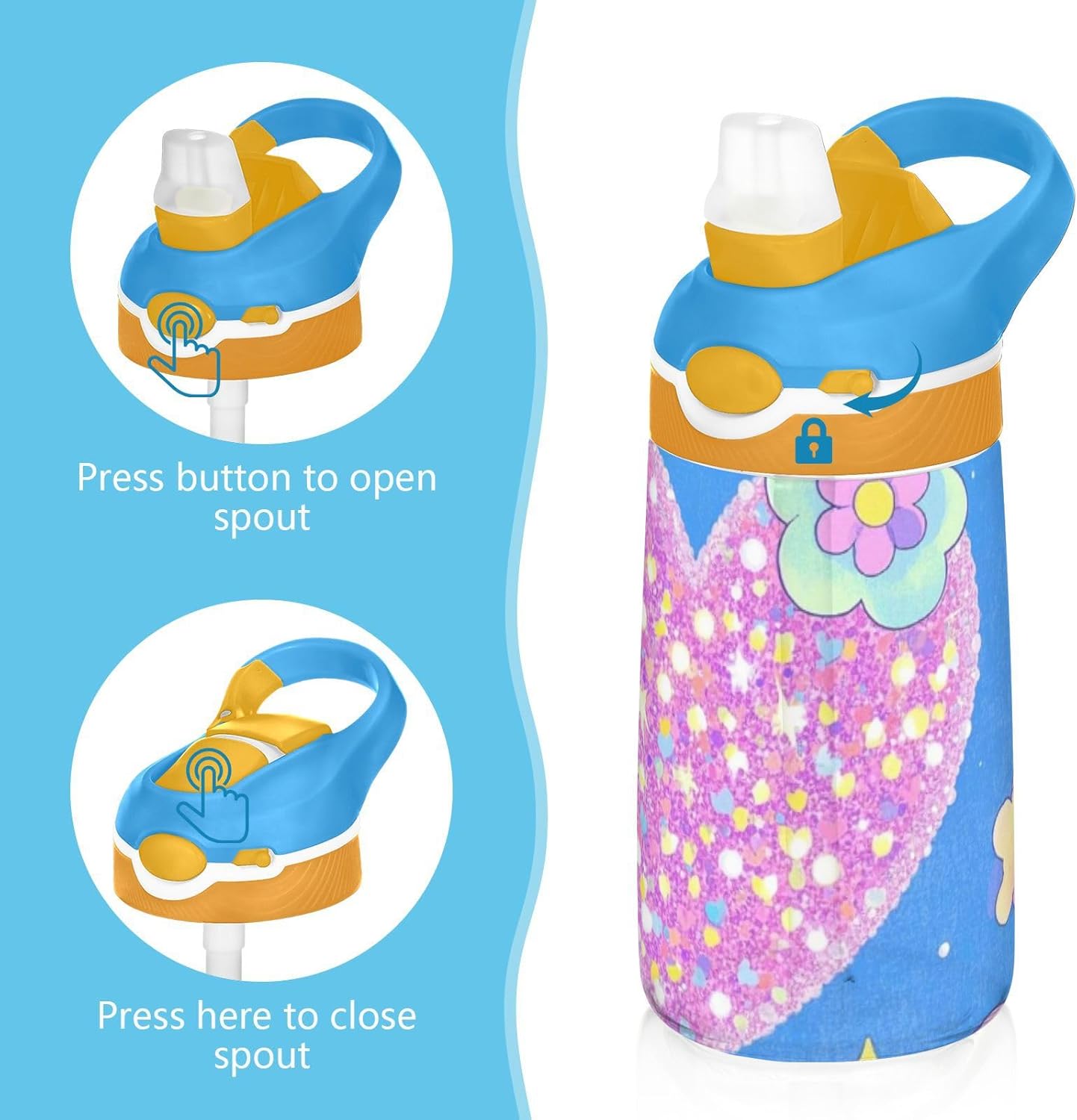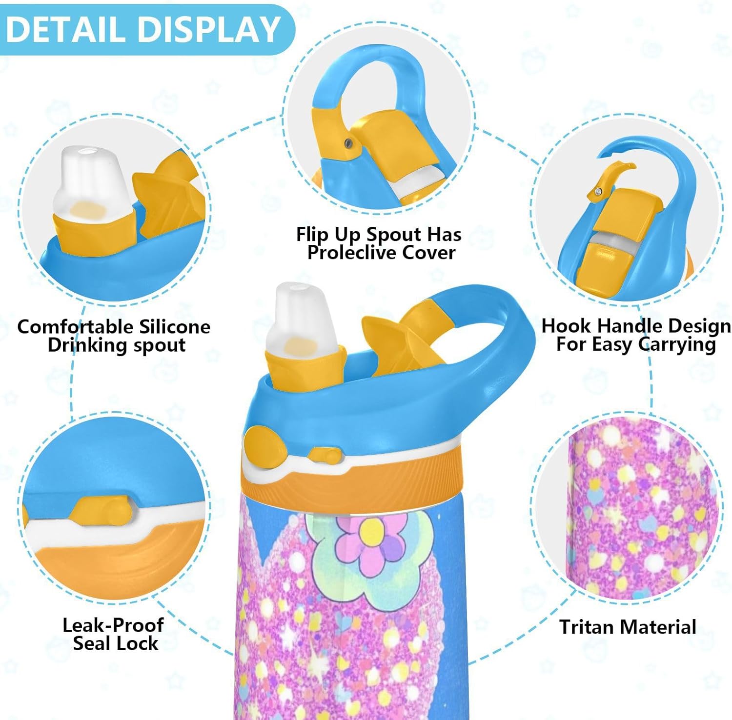 Materiale: questa borraccia da 16 x 7,5 cm con capacità di 480 ml è realizzata in tritan e silicone alimentare. Perfetto per le giornate scolastiche o per lo sport, è privo di elementi nocivi, affrontando le preoccupazioni dei genitori sui materiali non sicuri. Non adatto a bambini di età inferiore ai 3 anni! Comoda da trasportare: con un ampio manico per mani piccole e un gancio sul coperchio, la borraccia può essere appesa agli zaini. I bambini non faranno fatica a trasportarla durante le gite sul campo o le attività dopo la scuola. Uso senza problemi con una sola mano: il design a becco d'anatra si adatta alle bocche dei bambini, con una copertura antipolvere. L'interruttore a pulsante della borraccia per bambini è facile da usare con 1 mano, anche quando giocano o corrono. Previene le perdite: il blocco a pulsante blocca l'apertura accidentale del becco d'anatra. Mantiene le bevande all'interno, proteggendo zaini e vestiti durante i pendolari o il gioco. Pulizia semplice: le parti completamente rimovibili evitano l'accumulo di sporco. Pulire con detergente neutro e acqua calda: facile per i genitori mantenere la borraccia pulita per l'uso quotidiano.