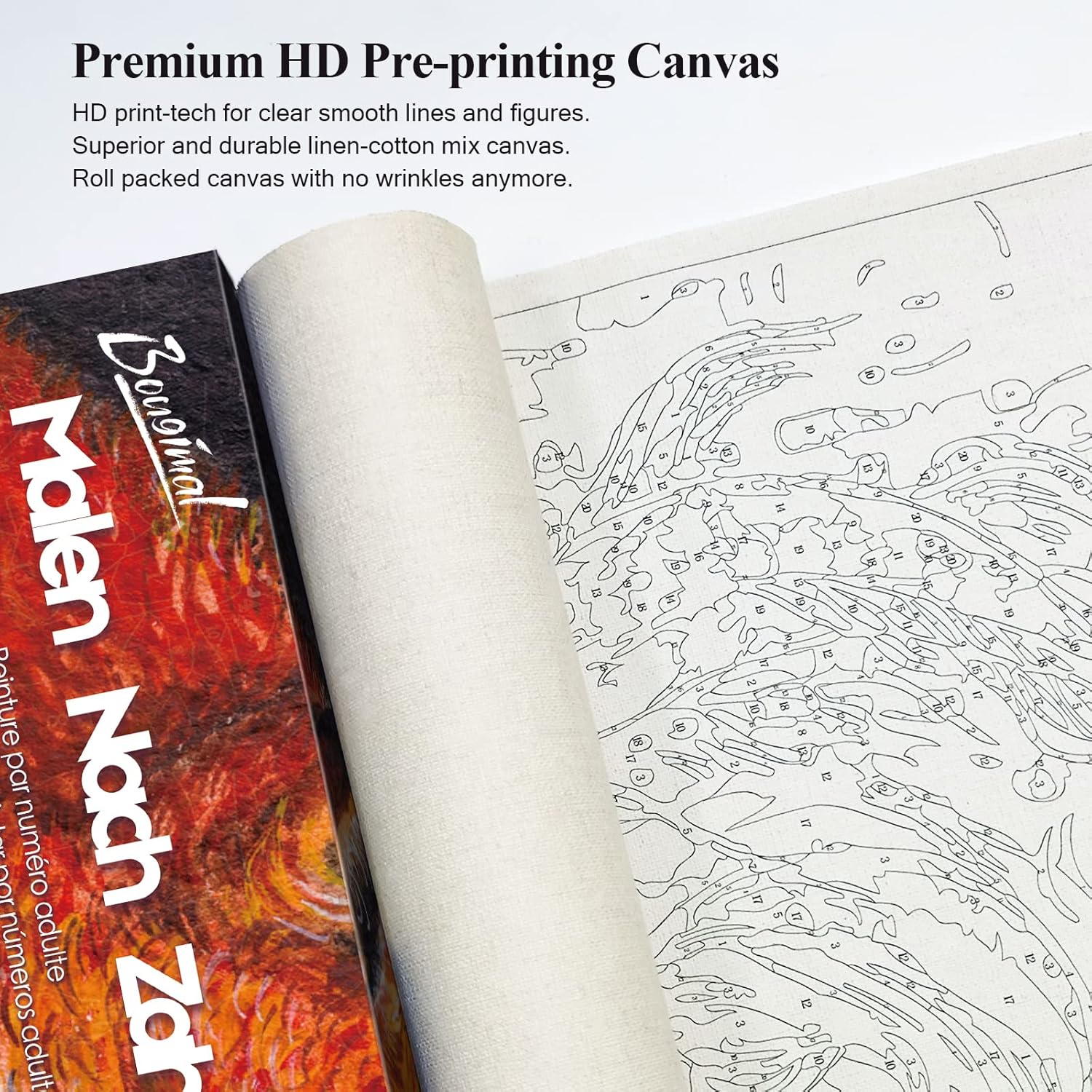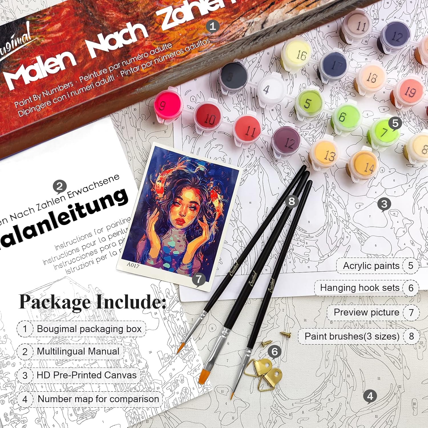 PENNELLI PER ARTISTA IN 3 MISURE: i colori acrilici migliorati del set di pennelli realizzati con setole di nylon di qualità sono più flessibili, non si scheggiano e non perdono. Puoi pulire la vernice dalle setole molto facilmente; I pennelli da pittura Bougimal con manico in legno si adattano comodamente alla mano anche dopo molto tempo. TELA ARROTOLATA: la tela arrotolata non fa pieghe e non necessita di stiratura rispetto alla maggior parte delle tele piegate sul mercato; Il cotone e il lino di qualità sono impermeabili e resistenti alle pieghe, adatti per la conservazione a lungo termine. VERNICI ACRILICHE ECOLOGICHE: le vernici acriliche sicure hanno un'elevata resa cromatica e coprono facilmente numeri e linee. I colori acrilici formano una pellicola protettiva una volta asciutti, rendendoli impermeabili e resistenti alla luce. LINEE E NUMERI CHIARI: ti danno fastidio le linee spesse e i grandi numeri sulle tele che la vernice non riesce a coprire completamente? L'esclusiva tecnologia di stampa di Bougimal rende i numeri e le linee più lisci e puliti, il che può anche coprire meglio il pigmento. MIGLIORE ESPERIENZA DEL CLIENTE: la pittura Bougimal con i numeri viene fornita in una bellissima confezione regalo, è un regalo meraviglioso! Promettiamo di fornire supporto colore gratuito per 60 giorni e guida alla verniciatura a vita