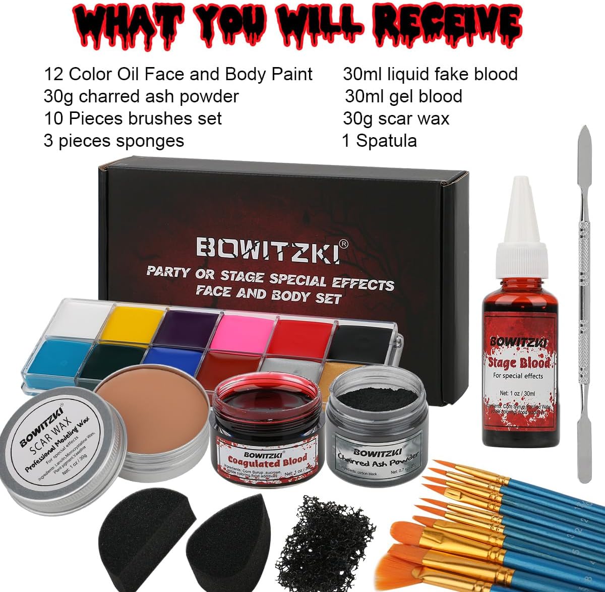 Il kit Bowitzki Halloween include: tubo da 30 ml di sangue finto + tubo da 30 ml di lattice liquido + tubo da 30 ml di vernice Red Age + vernice Black Age da 30 ml + 2 spugne per pittura per il corpo + 2 pennelli di dimensioni. Questo set è realizzato con ingredienti sicuri al 100%, non tossici, ipoallergenici ed ecologici, che lo rendono ideale per le pelli sensibili. Tutto in questo set può aiutarti a realizzare un trucco meraviglioso per Halloween o qualsiasi altra festa personalizzata. Lattice liquido: si asciuga trasparente, quindi puoi utilizzare qualsiasi modello con esso, come pelle di zombie o ferita, mostro, ecc. Sangue finto: aggiungi un po' di sangue liquido finto per rendere la tua personalizzazione più spaventosa, sii al centro dell'attenzione nella notte di Halloween e in tutte le feste. Personalizzato: siamo fiduciosi nella qualità delle nostre vernici per il viso Bowitzki, ne offriamo uno o uno se non sei soddisfatto al 100%.