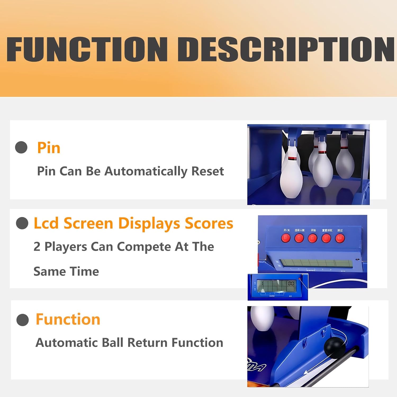 ➤【Materiali resistenti e sicuri per i bambini】Realizzato in plastica atossica di alta qualità e componenti elettronici robusti, questo set da bowling è sicuro per bambini dai 6 anni in su. Il colore blu brillante e il design sportivo lo rendono un regalo divertente ed entusiasmante per compleanni, Natale o feste. ➤【Divertimento interattivo per tutta la famiglia】Goditi il momento di legame genitore-figlio con questo gioco di bowling elettronico interattivo. Supporta sia la modalità 1 giocatore che 2 giocatori: basta premere un pulsante per iniziare! Perfetto per giocare al chiuso e rafforzare i legami familiari attraverso una competizione amichevole. ➤【Punteggio elettronico e reset automatico dei birilli】Il tabellone segnapunti a LED integrato tiene traccia automaticamente del punteggio dopo ogni lancio. I birilli si resettano con un suono realistico per un'esperienza più coinvolgente. Consiglio: evitare di lanciare la palla quando la luce di reset è accesa per garantirne il corretto funzionamento. ➤【Feedback realistico del colpo】Simula il peso e il movimento reali delle palle da bowling con prestazioni di rotolamento fluide. Goditi un feedback realistico dello strike ogni volta che colpisci i birilli. La corsia di ritorno curva assicura che la palla scivoli indietro senza sforzo. Si piega e si ripone facilmente quando non in uso. ➤【Set completo da bowling per interni】Include 1 pista da bowling elettronica, 6 birilli, 2 palle e un manuale in inglese. Alimentato da 4 batterie D da 1.5 V (non incluse). Disponibile nelle lunghezze 2 m e 3.5 m: ideale per casa, sale giochi o serate di gioco in famiglia!
