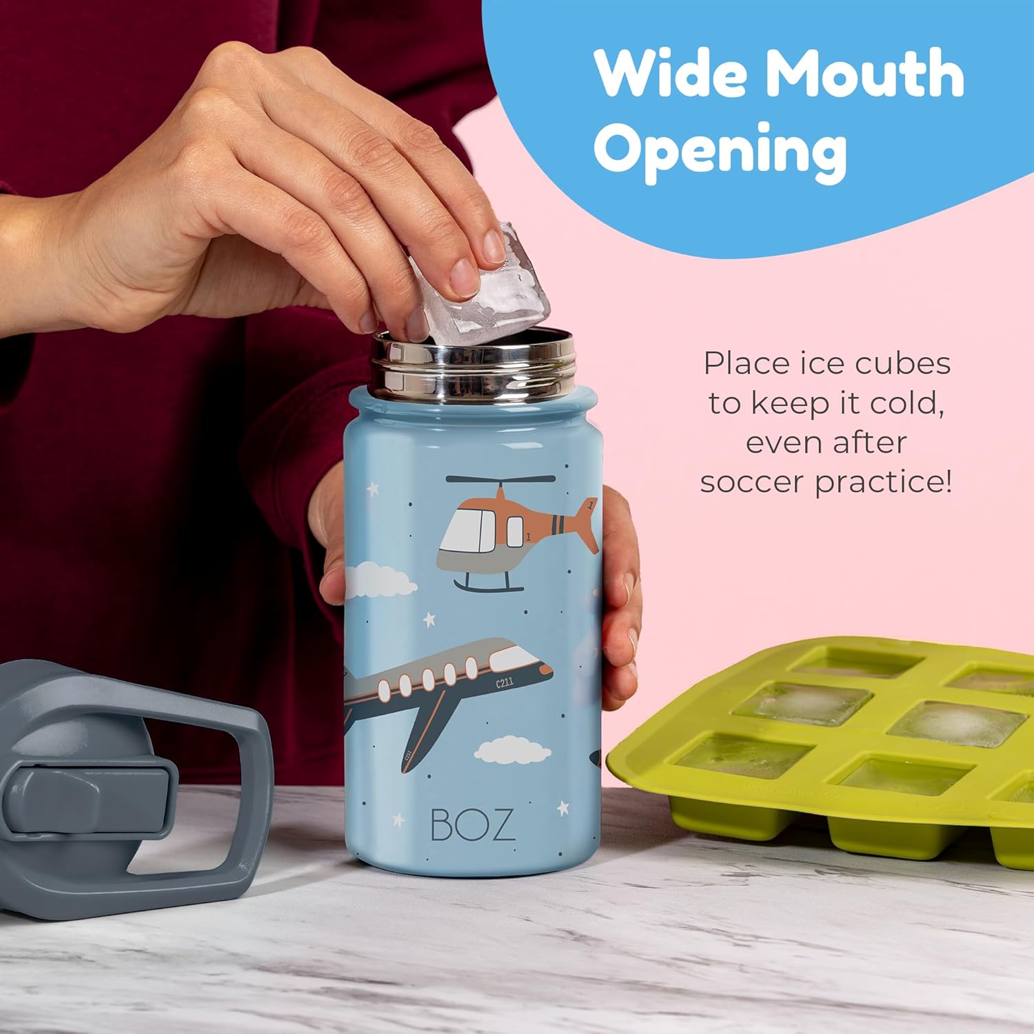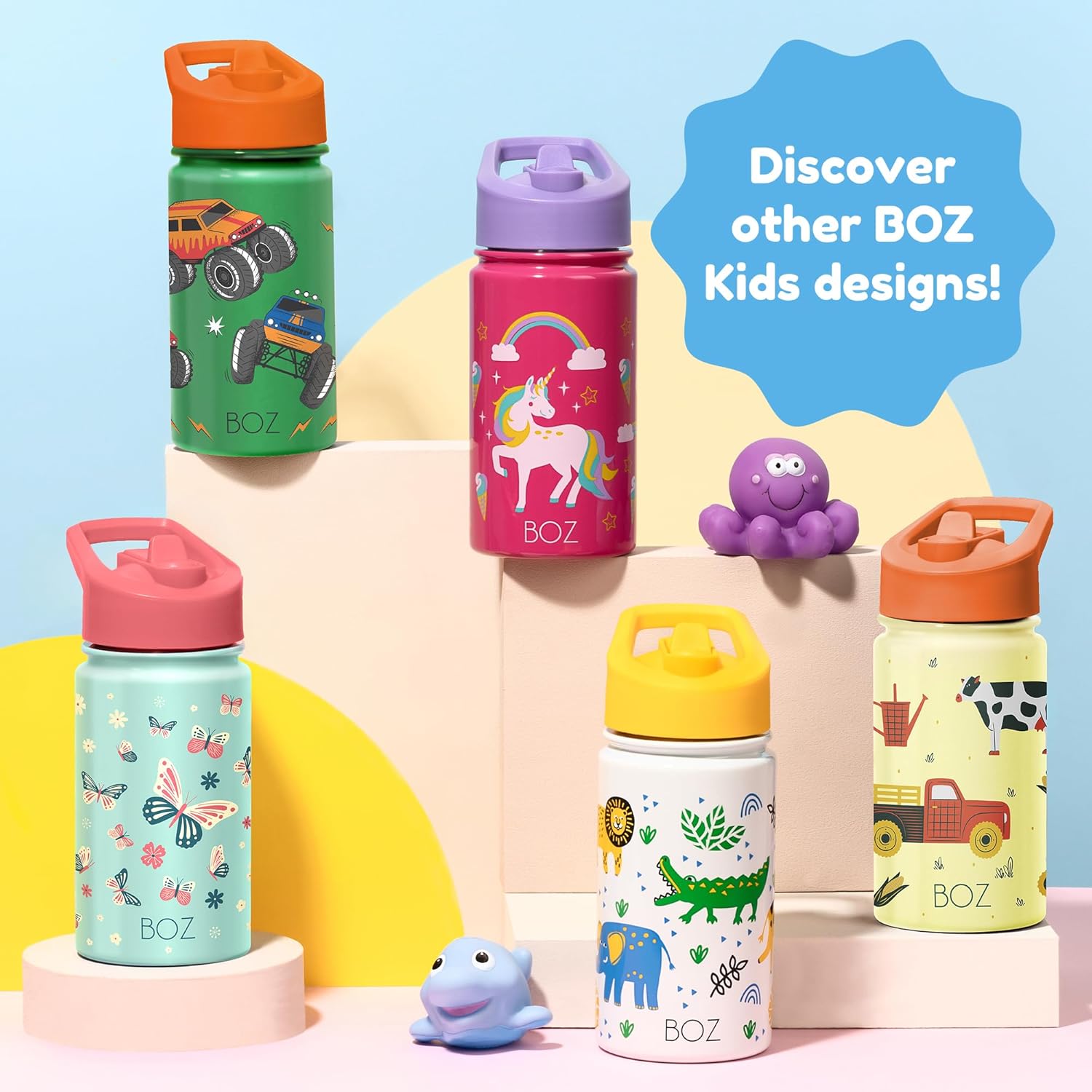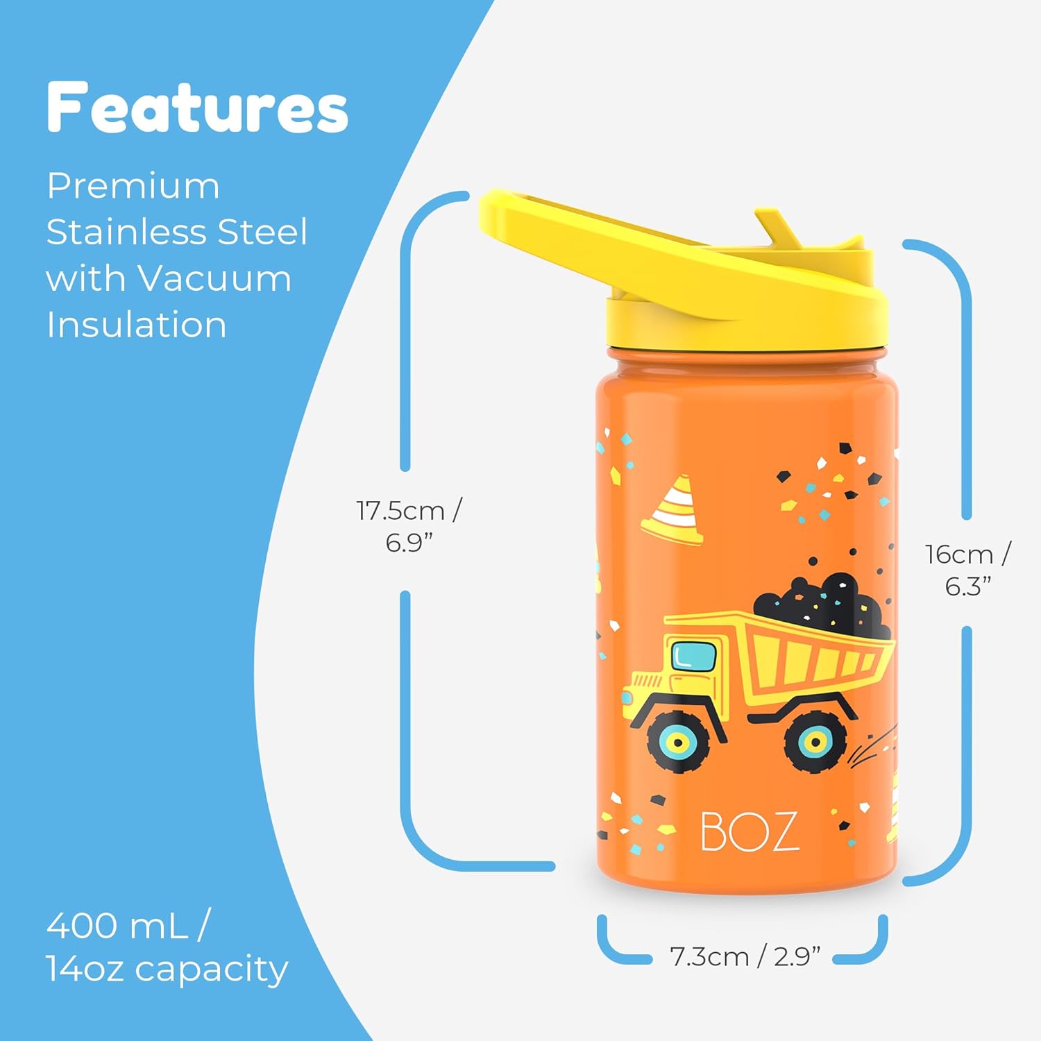 ✅ BOTTIGLIA PER BAMBINI A PROVA DI PERDITE - La borraccia per bambini BOZ è disponibile in 5 design a misura di bambino, è realizzata in acciaio inossidabile, isolata grazie a una doppia parete, rimane ermetica grazie a una guarnizione in silicone di alta qualità ed è il compagno perfetto per la scuola, lo sport e altre attività ricreative. ✅ BOTTIGLIA TERMICA PER BAMBINI - La borraccia per bambini a doppia parete è realizzata in acciaio inossidabile per alimenti e mantiene le bevande dei tuoi bambini fredde fino a 24 ore e calde fino a 12 ore. La borraccia per bambini in acciaio inossidabile è robusta e durevole e il tuo bambino beve in modo sano e sicuro perché tutte le parti della borraccia sono prive di BPA e plastificanti. ✅ LAVABILE IN LAVASTOVIGLIE - La borraccia per bambini in acciaio inossidabile è lavabile in lavastoviglie. La superficie liscia all'interno e all'esterno facilita la pulizia. Ciò consente di risparmiare tempo e nervi, soprattutto in una giornata stressante. ✅ BOTTIGLIA PER BAMBINI - La borraccia per bambini con una capacità di 400 ml ha un design compatto in modo che possa essere facilmente tenuta e trasportata dalle mani dei bambini. ✅ ADATTO ALL'ACIDO CARBONICO - La guarnizione in silicone di alta qualità ti mantiene al sicuro anche quando nella bottiglia d'acqua per bambini sono presenti bevande gassate. ✅ GARANZIA DI SODDISFAZIONE - La tua soddisfazione è la nostra massima priorità. Se non sei soddisfatto della borraccia per bambini BOZ, ti rimborseremo l'intero prezzo di acquisto.