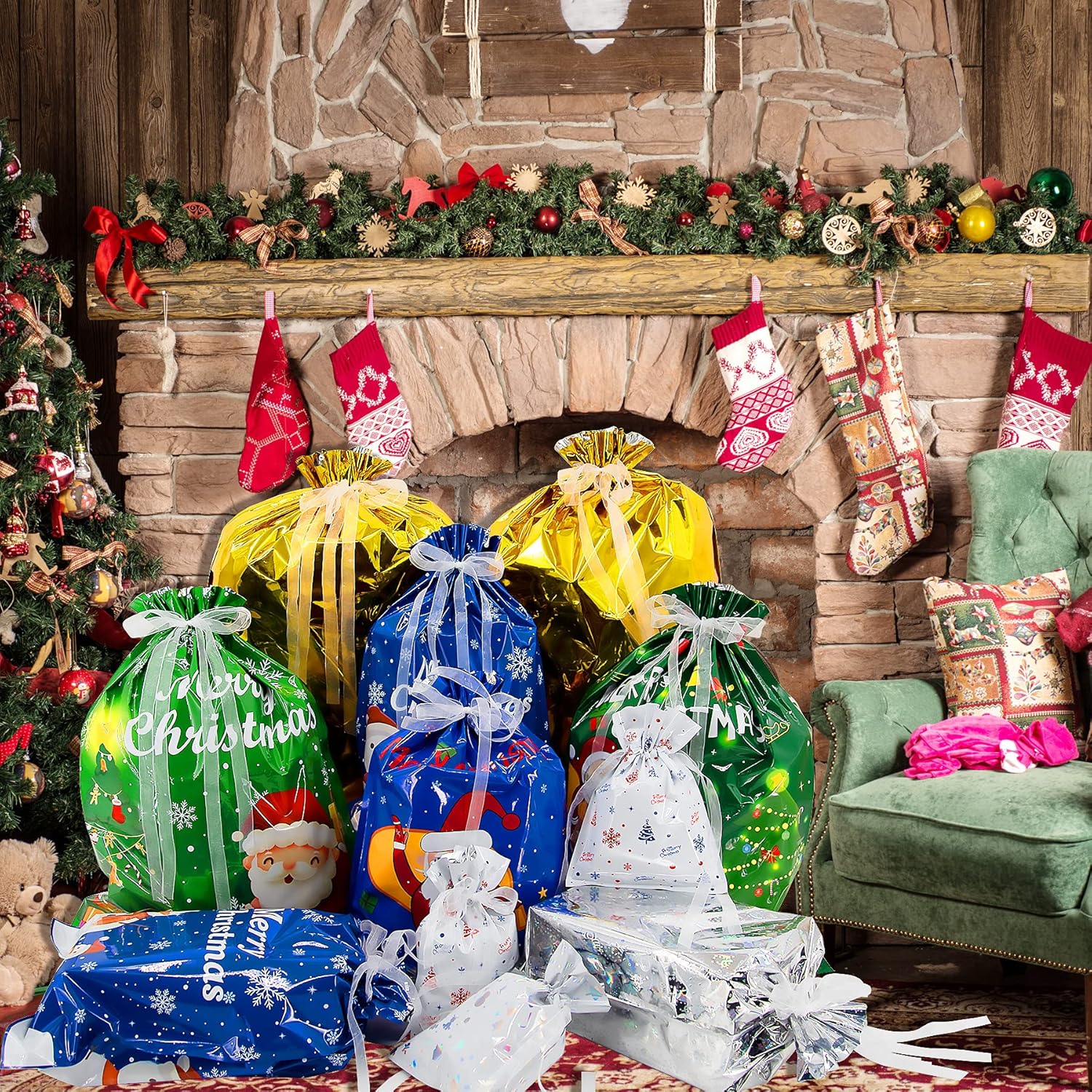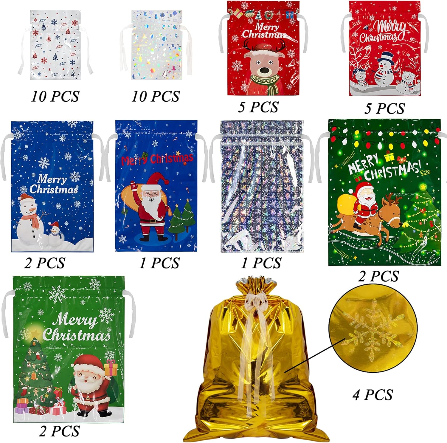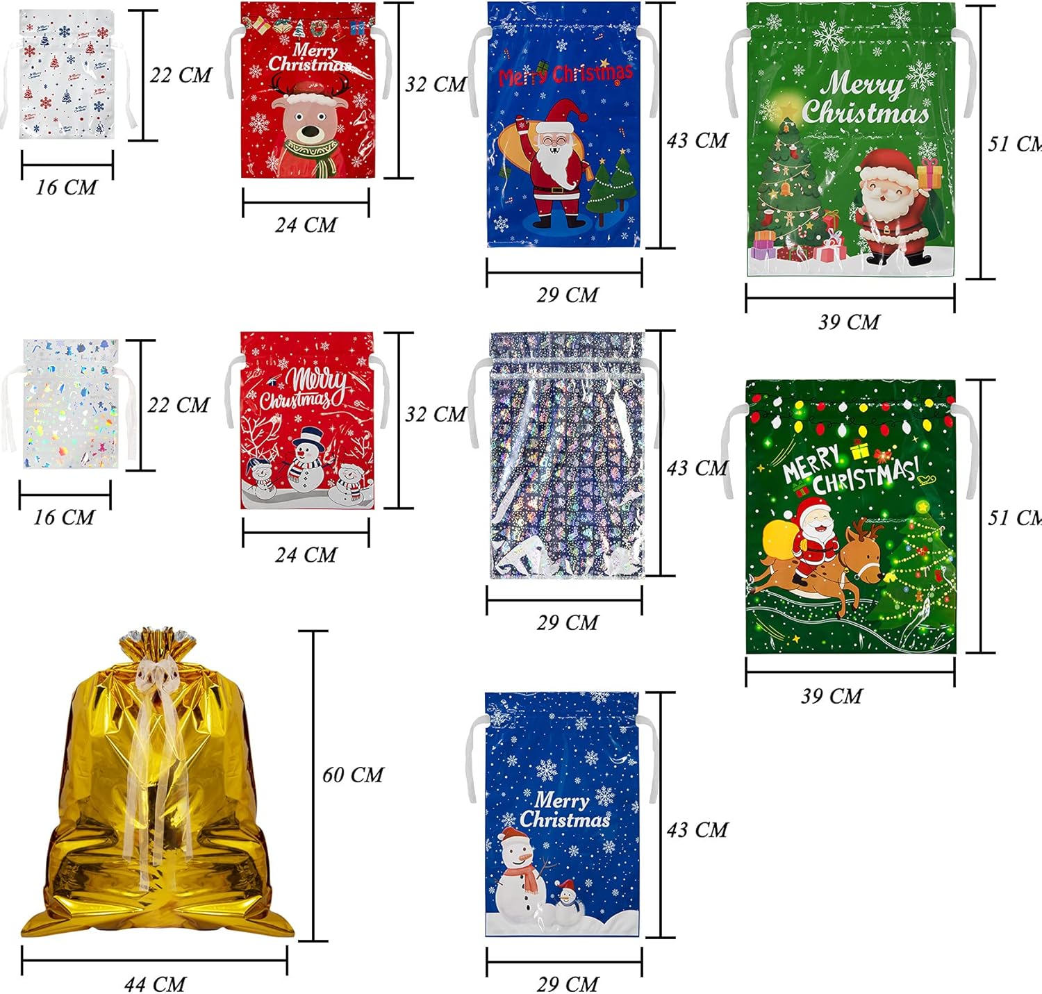 Sacchetti regalo natalizi con coulisse: la confezione contiene 42 sacchetti regalo natalizi in 10 modelli diversi. Si prega di vedere l'immagine per le dimensioni dettagliate. Design: questi sacchetti regalo sono stampati con diversi motivi natalizi e i sacchetti con coulisse sono facili da usare e perfetti per confezionare regali, risparmiando tempo e comodità. Caratteristiche vantaggiose: sui sacchetti regalo di Natale sono presenti due interruttori a strappo che consentono di aprire il sacchetto con coulisse in modo rapido e comodo. La borsa natalizia BQTQ è antiruggine, resistente alla corrosione, antiossidante, resistente all'umidità e facile da pulire. E devi solo lavare la borsa prima dell'uso e asciugarla se i sacchetti regalo di Natale sono sporchi. Materiale premium: sacchetti regalo natalizi con coulisse BQTQ realizzati in polietilene, foglio di alluminio e pellicola di poliestere, costituiti da tre strati di materiale, durevoli, non tossici, inodori e resistenti agli strappi. Ampia applicazione: la borsa regalo natalizia con coulisse è perfetta per imballare e conservare le feste di Natale a casa, a scuola e in ufficio. Puoi mettere il sacchetto di imballaggio su caminetti, letti e molti regali di Natale, cartoline di Natale, caramelle di Natale, scatole regalo di Natale, ecc.