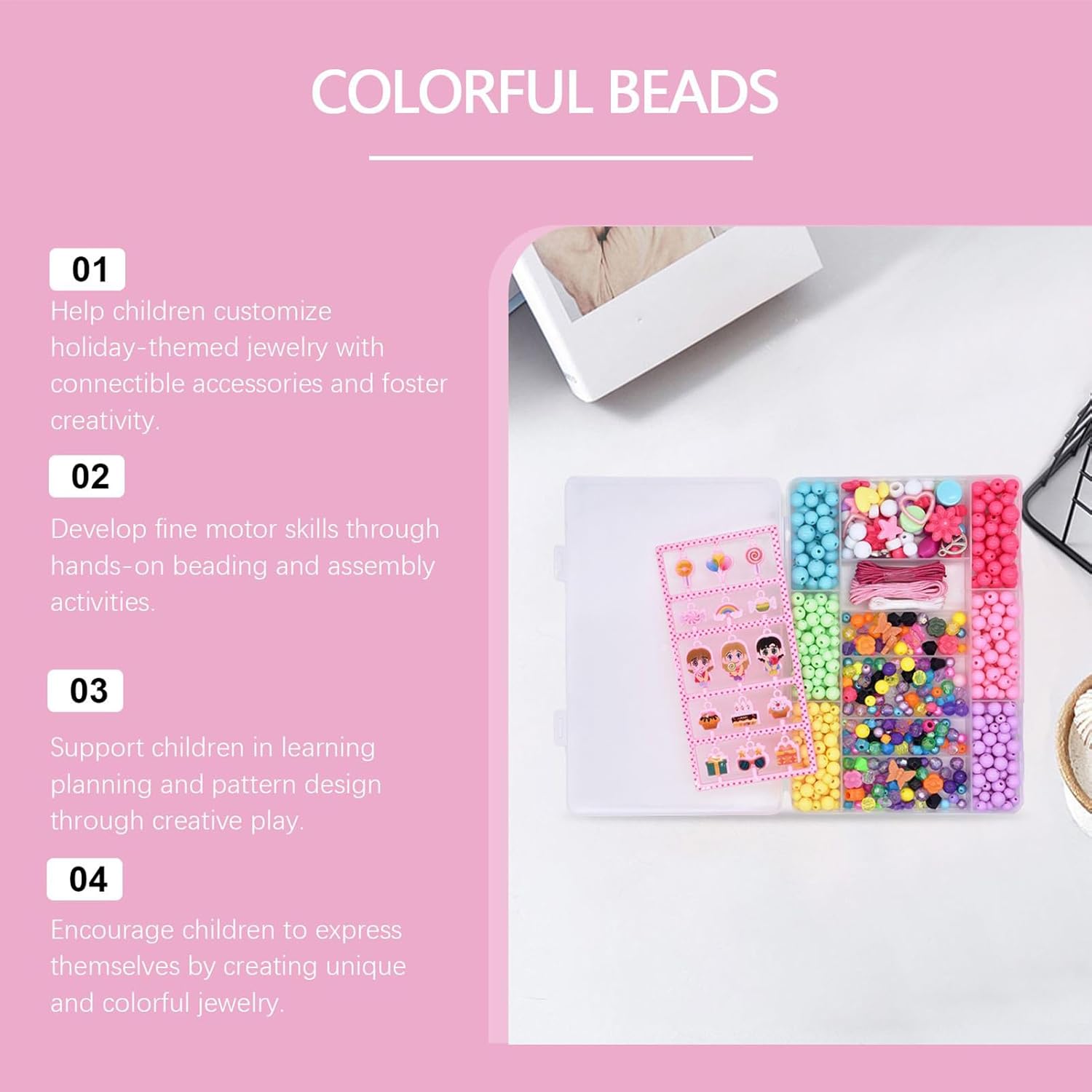 Grande varietà di perle: include oltre 1200 perle colorate in più forme, dimensioni e finiture dando ai bambini possibilità di creare braccialetti, collane e che scatenano l'immaginazione mentre sviluppano sottili abilità motorie Kit completo di creazione di gioielli: viene fornito con cavi di corda, fermagli e custodia che forniscono tutto il necessario per e mestieri in modo che i bambini possano iniziare immediatamente a progettare le proprie creazioni indossabili senza aver bisogno di forniture o strumenti extra Attività creativa divertente: incoraggia il gioco pratico che stimola la creatività, la pazienza e la concentrazione mentre dà ai bambini l'opportunità di creare gioielli che possono indossare, condividere con gli amici o presentare come regali fatti a mano ponderati Forniture di artigianato educativo: supporta l'apprendimento migliorando il riconoscimento del colore, la coordinazione per gli occhi della mano e le capacità di risoluzione dei problemi offrendo una piacevole attività interna che combina il di gioco con la costruzione di abilità in modo coinvolgente Custodia di archiviazione portatile: organizzato in una robusta scatola trasparente con compartimenti che mantengono le perle ordinate e facili da accedere a renderle perfette per viaggi, date di gioco o scuole riducendo al contempo il disordine e semplificando la pulizia