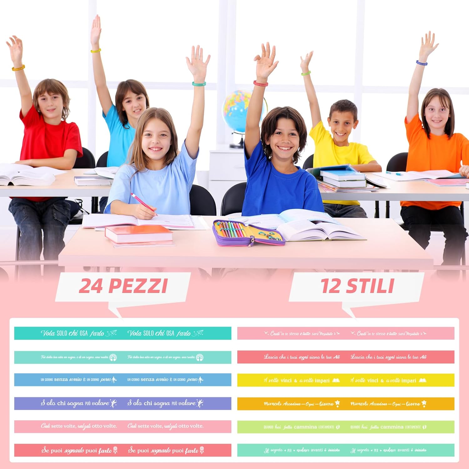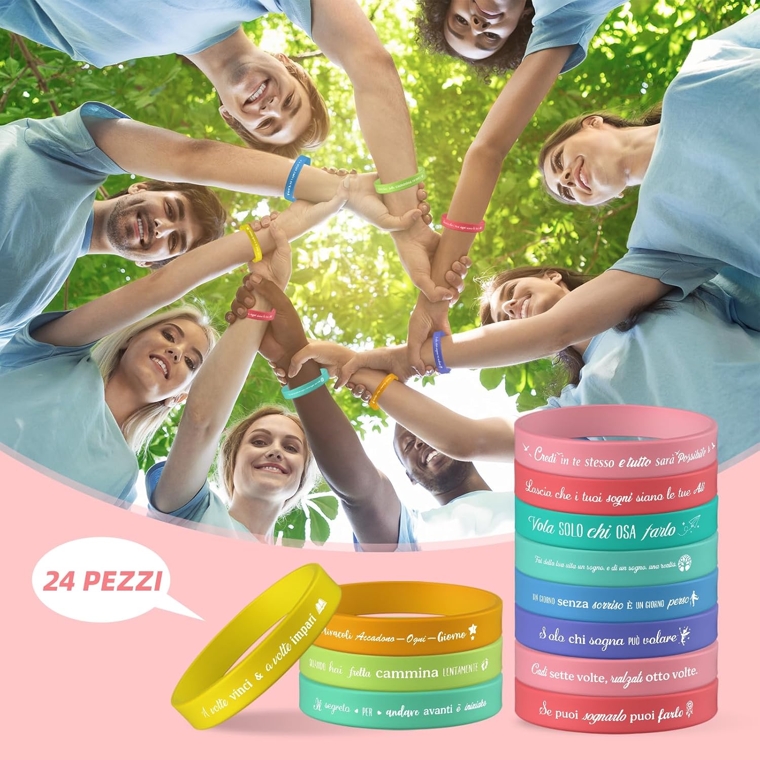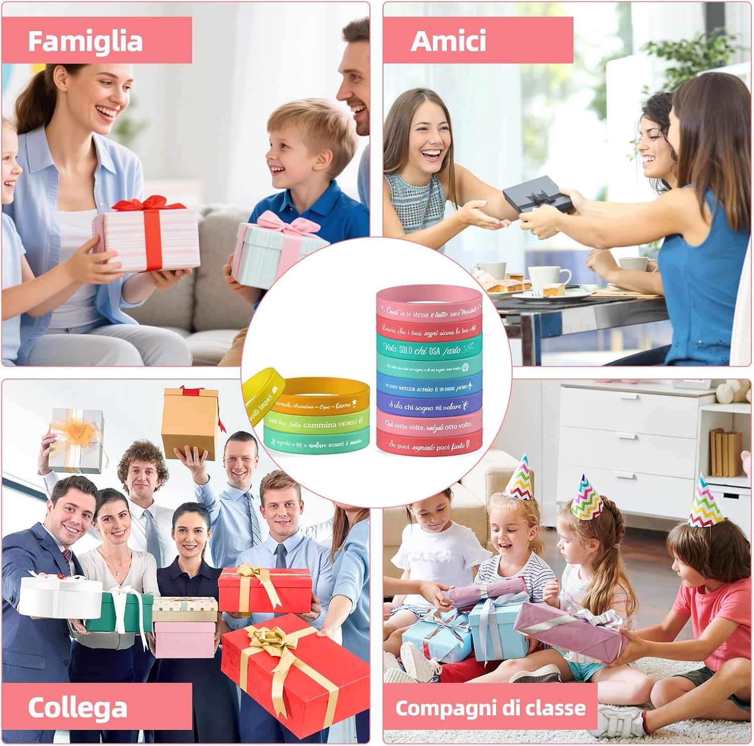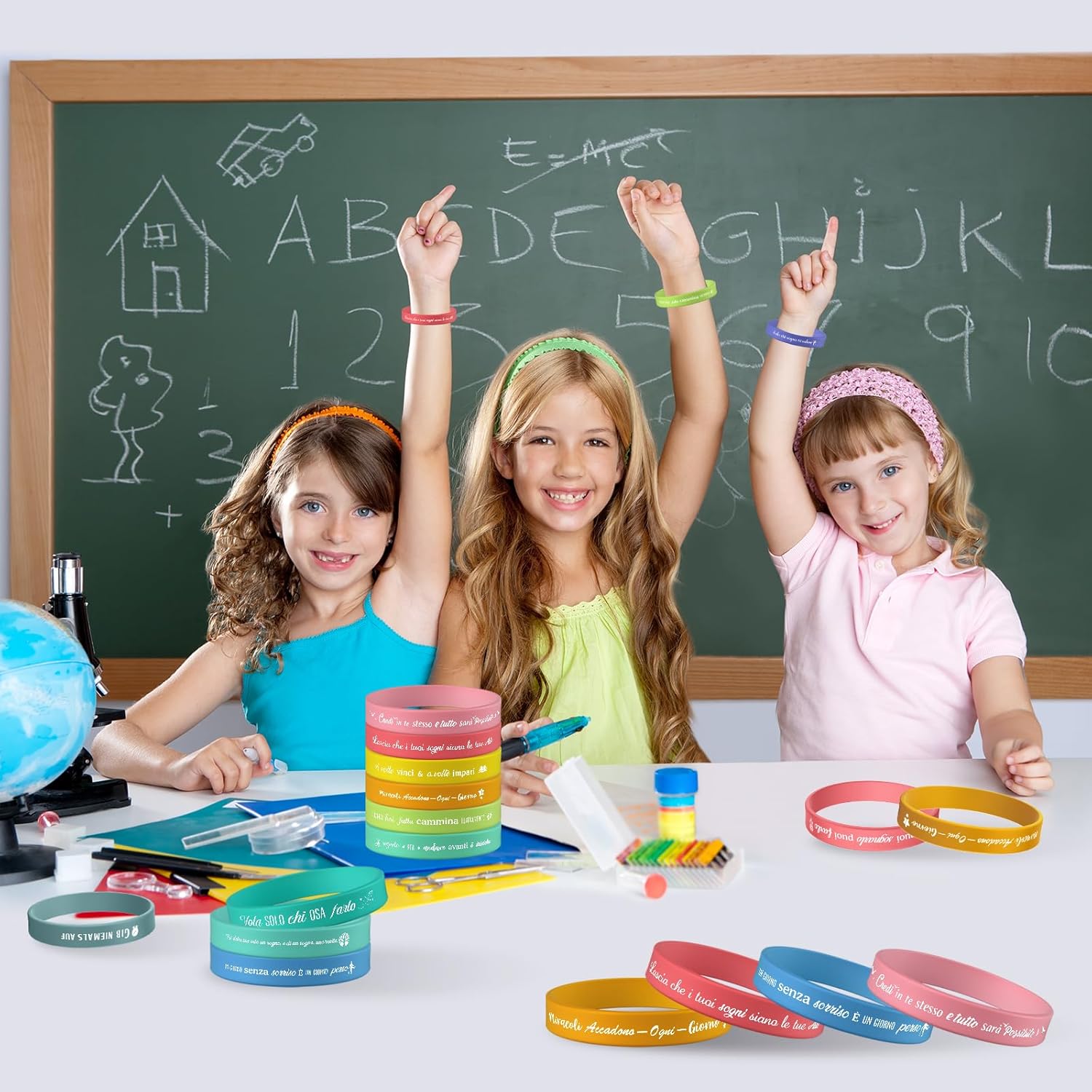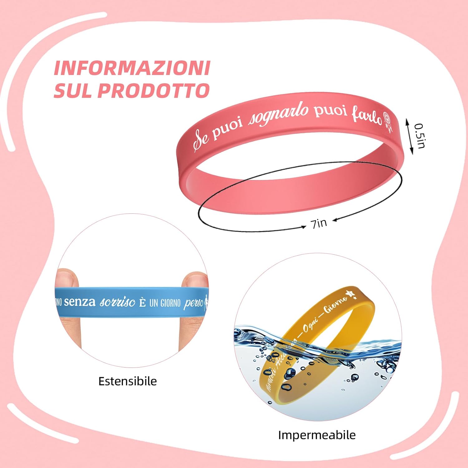 Alta qualità: i nostri braccialetti motivazionali in silicone sono realizzati con materiali di alta qualità, inodori, morbidi e riutilizzabili. Comodi da indossare, con una circonferenza di 21 cm, adatti alla maggior parte delle circonferenze del polso Design con testo motivazionale: ogni braccialetto elastico è stampato con citazioni motivazionali in italiano. Questo braccialetto non è solo un accessorio pratico, ma anche una forza spirituale che può motivare te stesso, ispirare gli altri e trasmettere un atteggiamento positivo e sano verso la vita Quantità sufficiente: il set contiene 36 braccialetti motivazionali, 12 diversi stili di testo, 3 per ogni stile. Può essere indossato da solo o abbinato ad altri stili per mostrare il tuo stile personale Adatto a varie occasioni: i nostri braccialetti motivazionali non sono adatti solo per uso personale, ma anche per eventi sportivi, feste a tema, attività di squadra, cerimonie di laurea, ecc. Sono compagni di vita positivi e stimolanti Regalo ideale: i nostri braccialetti in silicone sono il regalo di incoraggiamento perfetto per studenti, colleghi, appassionati di sport o membri di una squadra, un regalo unico e significativo