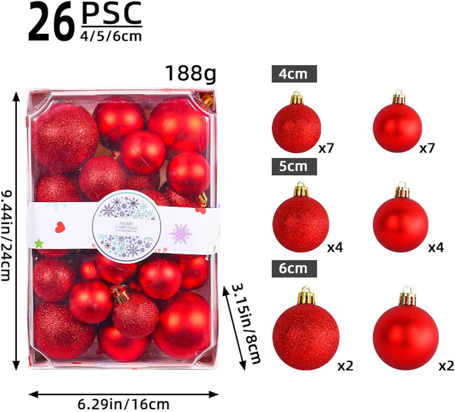 Mix e creatività: con diverse dimensioni e colori, è possibile mescolare e creare e accattivanti display, permettendo alla tua creatività di brillare durante le festività natalizie. Arcobaleno di feste: svela un mondo di splendore natalizio con questi set rettangolari contenenti un assortimento di palline di Natale colorate da 4 cm, 5 cm e 6 cm. Questi ornamenti versatili sia per spazi commerciali che per ambienti domestici. Opzioni di decorazione: sia per vestire il tuo albero di Natale, aggiungere al tuo negozio o migliorare l'atmosfera festiva della tua casa, questo set di Natale offre molteplici possibilità di decorazione. Confezione pronta per il regalo: confezionato in un elegante rettangolare, questo set non è perfetto per l'auto-decorazione, ma è anche un delizioso regalo per amici e familiari per le loro case. Versatile finezza festiva: il tuo Natale con questo assortimento di palline colorate. Dalle esposizioni scintillanti negli spazi commerciali agli ornamenti per alberi a casa, questi ornamenti offrono una finitura versatile e festosa.