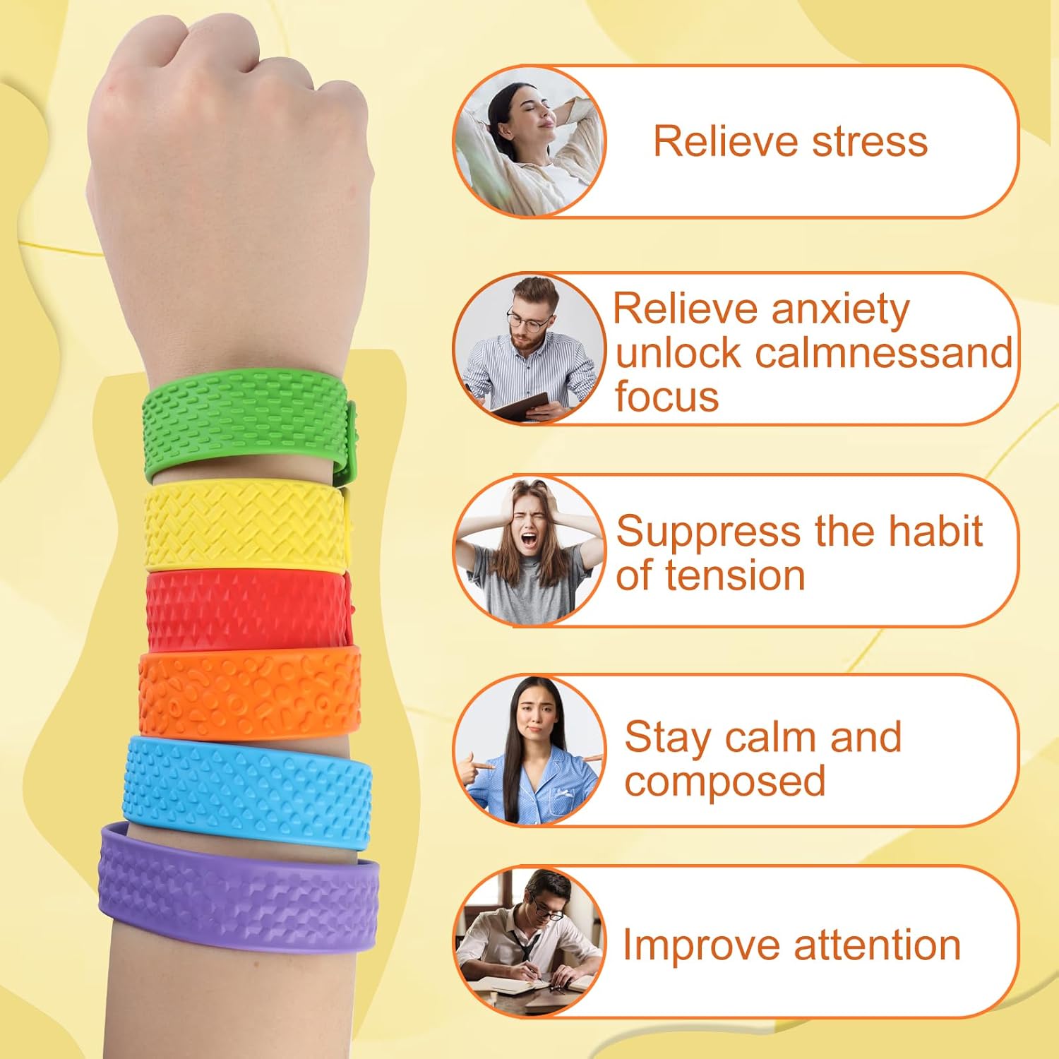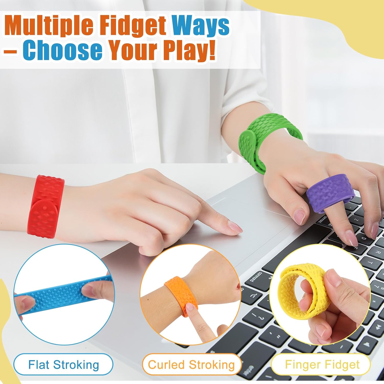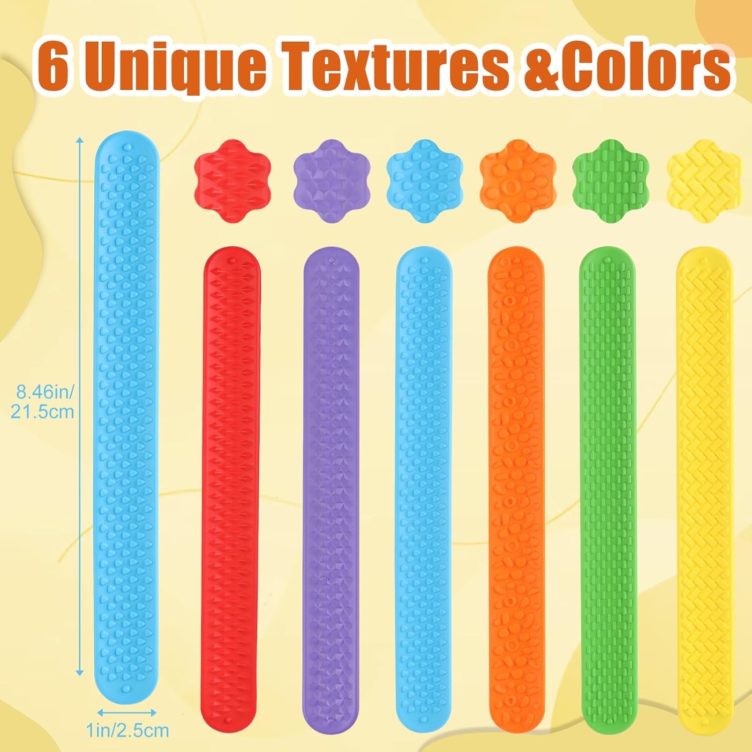 Giocattolo sensoriale tattile multi-texture: il braccialetto è disponibile in sei colori. Caratterizzato da diverse texture concave e convesse, offre diversi feedback tattili, tra cui impastamento, pressione e carezza, aiutando bambini e adulti ad alleviare l'irrequietezza e a concentrarsi. È uno strumento ideale per il sollievo dell'umore per persone con autismo, ADHD e sensibilità sensoriali. Materiale in silicone, sicuro e durevole: realizzato in morbido silicone senza sbavature, è delicato sulla pelle dei bambini. Le piastre in acciaio elastico integrate resistono a cadute e pieghe e i bordi cuciti eliminano il metallo esposto. Dura a lungo senza sbiadire o deformarsi, garantendone la durata. Altamente flessibile, atossico e inodore, è comodo e sicuro da indossare. Facile da pulire. Taglia unica per tutte le età: basta "batterlo" per adattarlo al polso e il braccialetto formerà un cerchio perfetto. Si adatta in modo flessibile ai polsi sottili dei bambini e ai polsi spessi degli adulti. È solido e affidabile, non cade facilmente e non c'è bisogno di preoccuparsi delle dimensioni. È adatto ad adulti e bambini e puoi iniziare a usare la "decompressione indossabile" sempre e ovunque. Ampiamente applicabile: non richiede custodia! Indossalo e portalo con te. Strofinare la texture in rilievo allevia le distrazioni e lo stress in classe o al lavoro, oppure giocarci in movimento per alleviare l'ansia e passare il tempo, aiutandoti a calmarti in silenzio. Questo braccialetto decompressivo in silicone non solo farà divertire i tuoi bambini, ma ti riporterà anche alla mente i ricordi d'infanzia! Un accessorio elegante, il regalo ideale: il design del braccialetto dai colori vivaci attira l'attenzione, rendendolo sia un giocattolo antistress che un accessorio da polso alla moda, perfetto per abbinamenti creativi. Perfetto come premio in classe, regalo di compleanno, bomboniere per bambini, regali per le feste, scambio di regali di Natale e tavoli da lavoro alle feste, è uno dei preferiti sia dagli adulti che dai bambini.