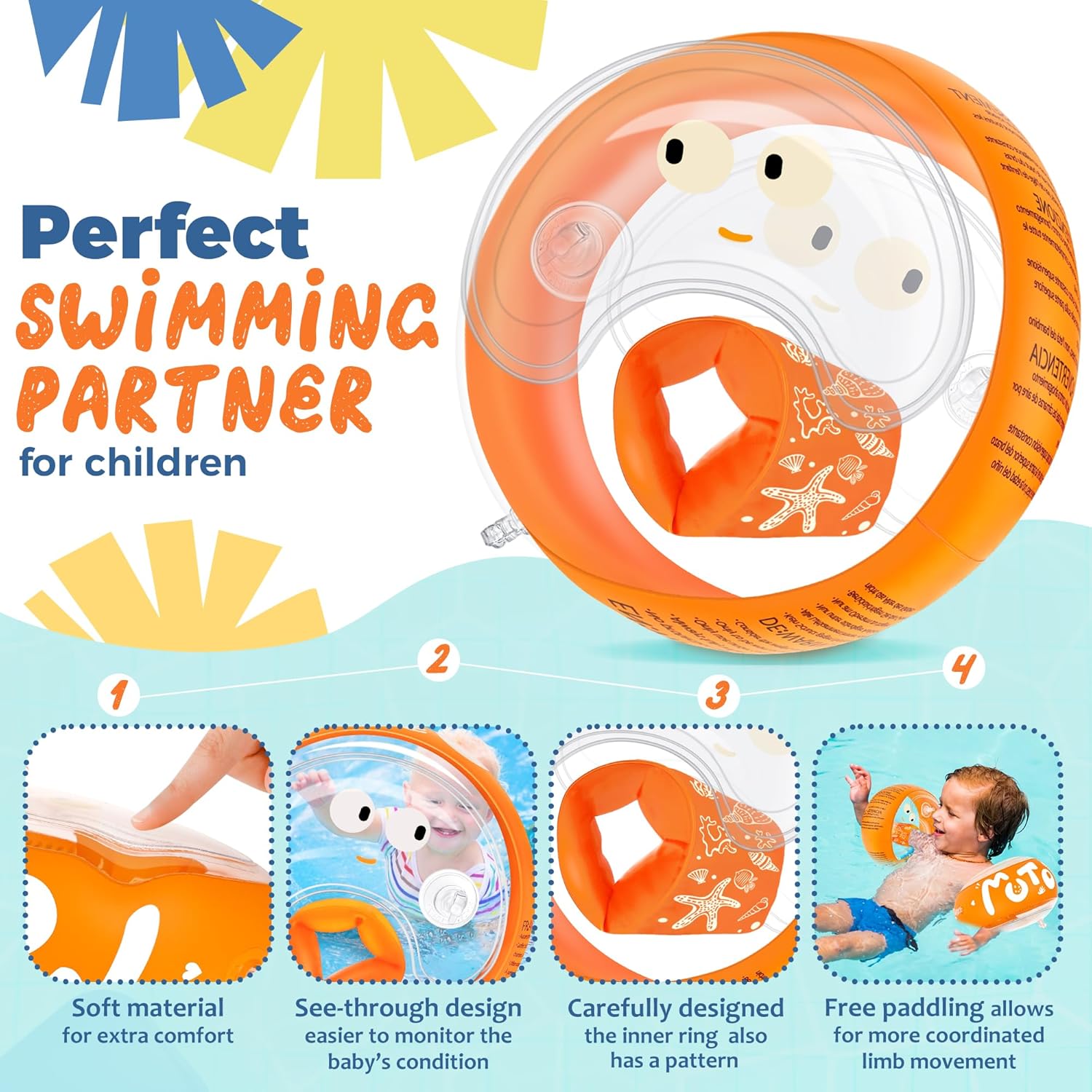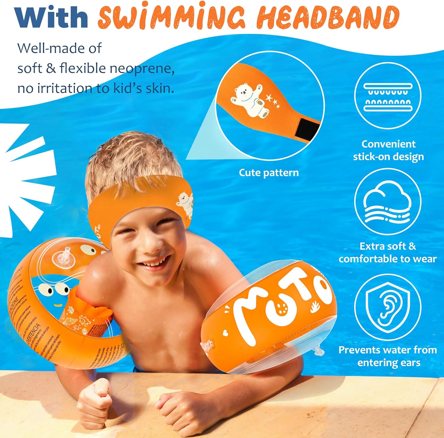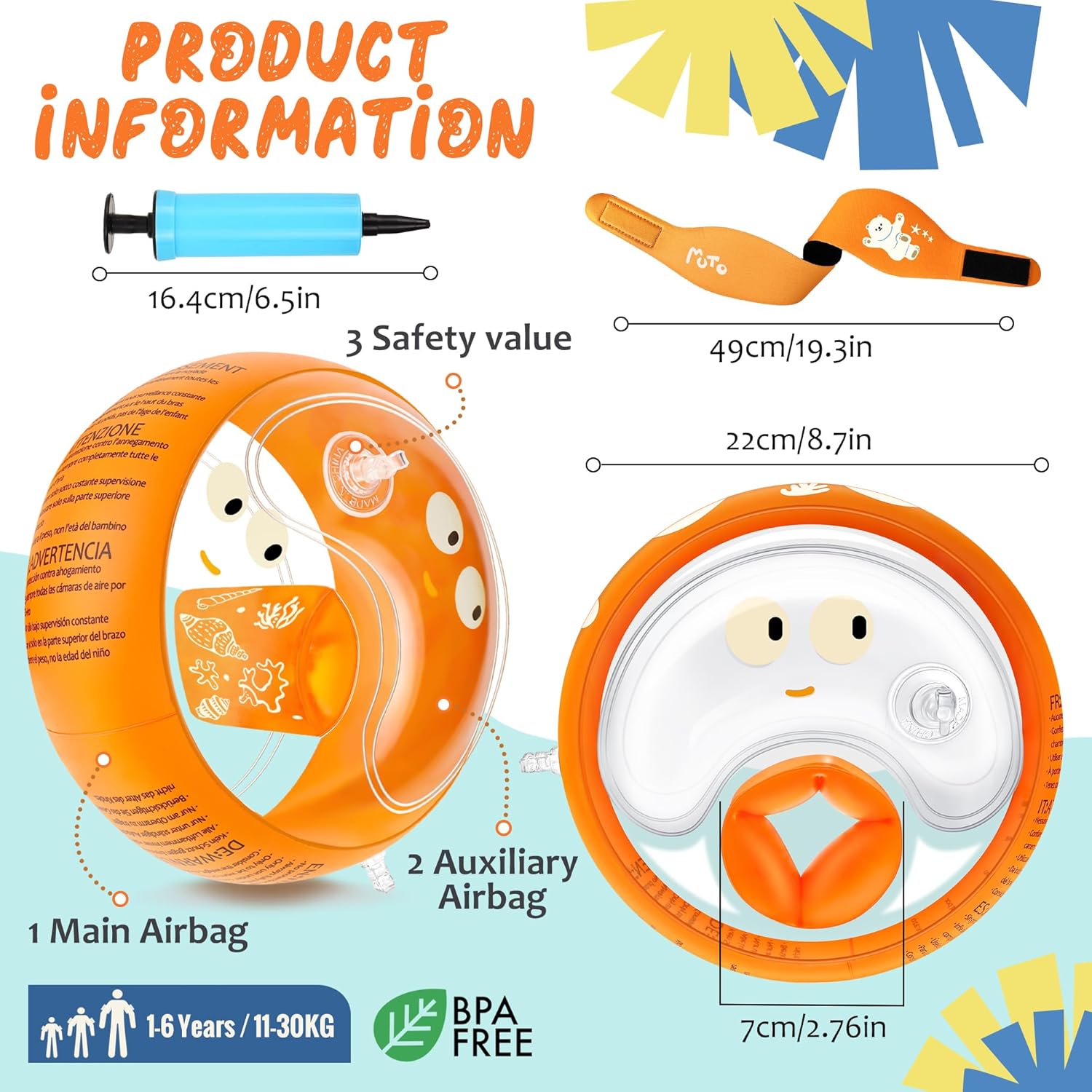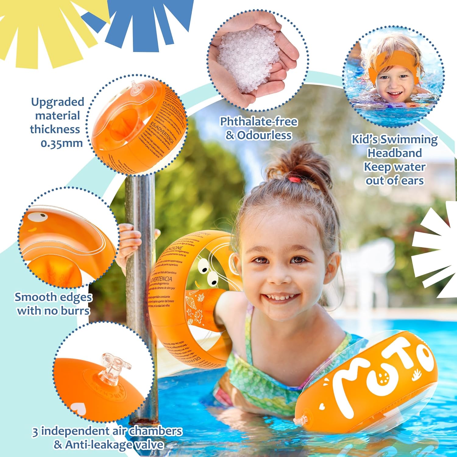 【Spessore del Materiale Potenziato】Rispetto ai braccioli bambini convenzionali, i nostri braccioli un materiale in PVC rinforzato da 0,35 mm, che migliora la resistenza alle perforazioni. Questo braccioli bambini 2 anni è dotato di 3 camere d’aria indipendenti e 3 valvole di sicurezza anti-perdita, garantiscono una tenuta ottimale nel tempo, proteggendo i bambini durante il gioco acquatico con massima affidabilità. 【Fascia Protettiva per Orecchie】I nostri braccioli bambini 1 anno includono nella confezione, la fascia in neoprene offre comfort e leggerezza. Morbida ed elastica, previene efficacemente l’ingresso d’acqua nelle orecchie, riducendo il rischio di infezioni. Il rivestimento antiscivolo e il sistema regolabile con velcro assicurano una vestibilità perfetta e personalizzabile. 【Design Accattivante e Funzionale】Le vivaci colorazioni aumentano la visibilità in acqua, mentre la trasparenza del materiale permette di monitorare i bambini con facilità. I simpatici disegni interni stimolano il buonumore durante il nuoto. Completi di pompetta manuale per un gonfiaggio rapido, i braccioli bambini 3 anni sono ultraleggeri e si ripiegano facilmente dopo l’uso, ideali per il trasporto. 【Qualità Premium e Sicurezza】I nostri braccioli bambini 5 anni, privi di ftalati e inodori, hanno bordi lisci e privi di bave e il materiale ultraresistente consente agli braccioli gonfiabile per bambini di resistere a un esercizio fisico intenso, mantenendo al contempo massimo comfort e una presa salda che previene qualsiasi rischio di scivolamento. La forma ergonomica offre maggiore spazio sotto le braccia, per una libertà di movimento totale. 【Il Compagno Ideale per l’Acqua】Dalla piscina di casa ai parchi acquatici, dalle spiagge ai corsi di nuoto, questi braccioli di sicurezza per bambini sono i partner perfetti per bambini da 1 a 6 anni (11-30 kg). Trasforma ogni estate in un’avventura sicura e indimenticabile con un prodotto che unisce tecnologia, divertimento e protezione superiore!