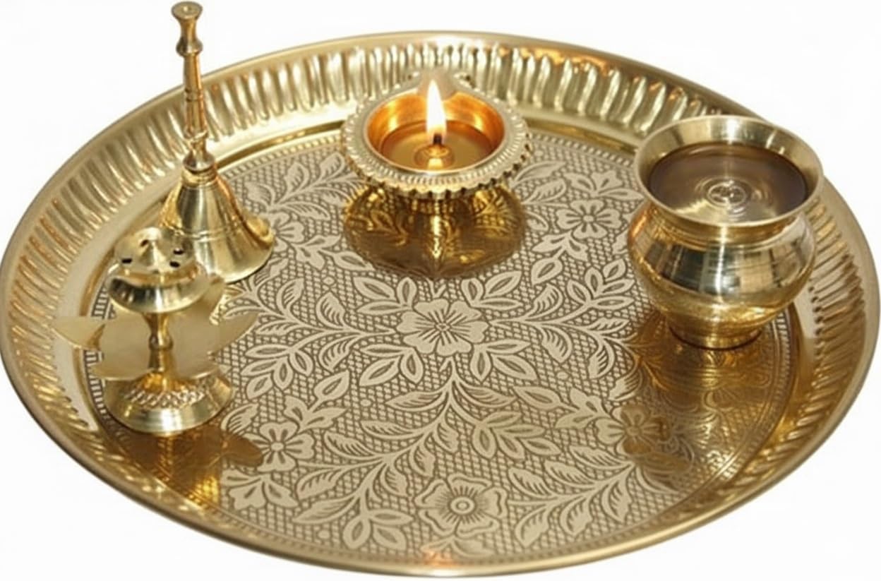 🌸 Contenuto della confezione: set Purnima Puja Thali (1 piatto, 1 campana, 1 pentola, 1 supporto Agarbatti, 1 Diya, 1 Kalawa, 1 poster Vishnu laxmi, 1 panno di velluto rosso, stoppini Ghee, 1 libro Puranmasi Katha, 1 bottiglia Ganga Jal, Aagarbati, Roli, 1 polvere Chandan, 5 polvere Haldi, 5 g di Laung, 5 g Riso, 5 g di grano, 5 g di Elaichi, 50 g di Havan Samagri, 2 sterco di mucca, Jaenu, 15 g di miele, 1 Etra, 1 miele); Materiale: ottone; Colore: dorato 🌸 Dimensioni approssimative - Piatto - Diametro: 20,8 cm (8,2 pollici); Diya - Altezza: 1,7 cm (0,7 pollici); Larghezza: 5 cm; Lunghezza: 5,8 cm; Vaso - Altezza: 4 cm; Larghezza: 4,5 cm; Porta Agarbatti - Altezza: 4,3 cm; Larghezza: 4,5 cm; Campana - Altezza: 7,1 cm; Diametro: 3,3 cm; Peso: 250 g 🌸 P.S.: il colore del prodotto potrebbe variare leggermente a seconda della fotocamera e delle impostazioni del monitor. 🌸 Perfetto per eseguire rituali durante il Griha Pravesh (inaugurazione della casa), matrimoni, nuovi inizi di attività o il Purnima puja mensile. 🌸 Se vuoi vedere altri bellissimi articoli come questo, clicca su "BRACOP" sopra il titolo