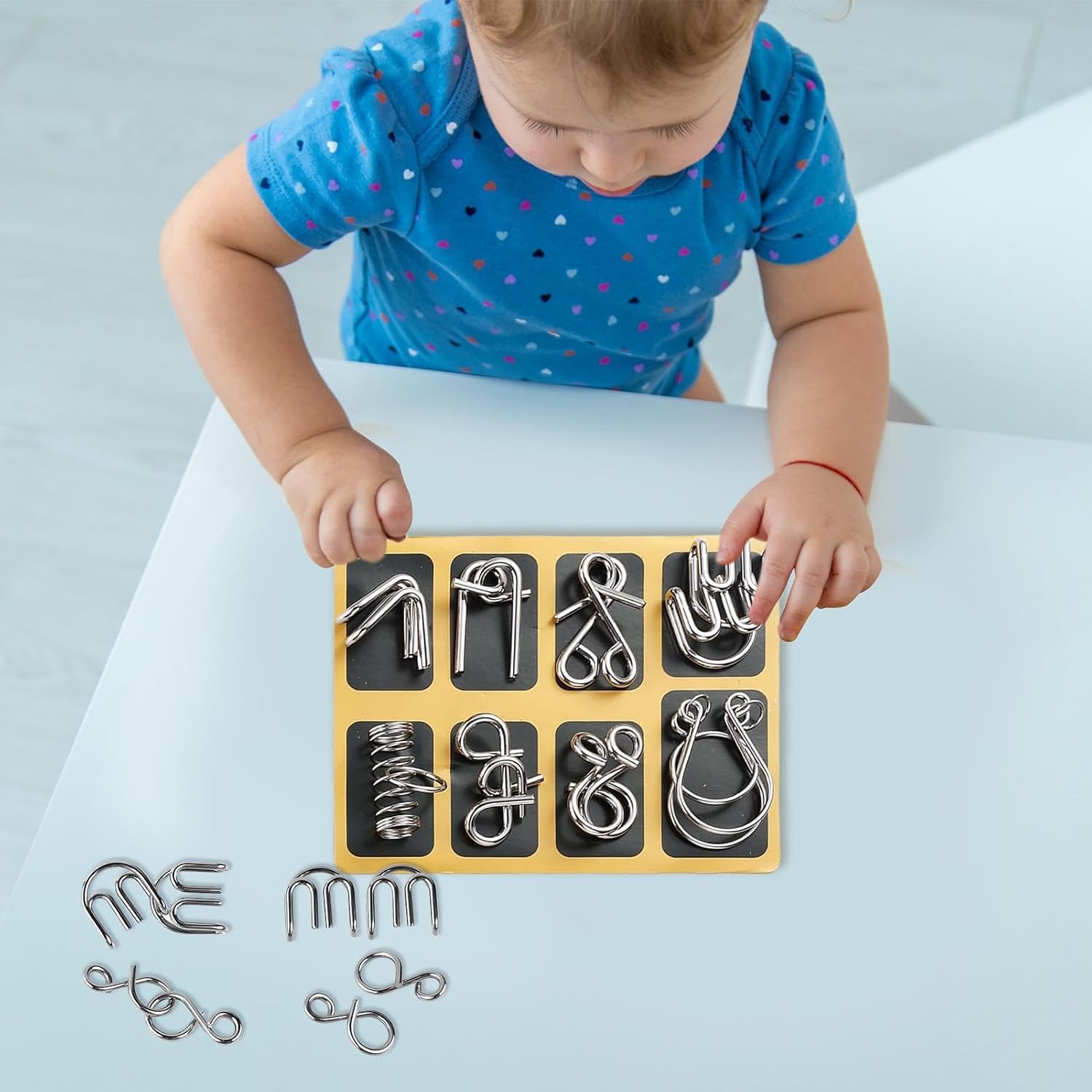 Progressive Puzzle Complexity: The 24-design metal wire puzzle set inspires a desire for e xploration as users tackle increasingly intricate challenges, creating opportunities for shared moments of triumph during family activities or personal downtime All-Age Friendly Puzzle: Featuring polished smooth and burr-free edges, the metal wire p uzzle provides a safe user experience for all ages, constructed from high-density high-carbon steel to ensure strength and resistant to wear, enhancing relaxation during travel or quiet evenings at home Intellectual Growth Catalyst: Metal brain teasers encourage the exploration of complex ctures, aiding in the enhancement of spatial imagination and logical reasoning abilities, making them suitable for both personal growth and interactive group activities Interactive Learning Fun: Metal puzzles for kids come with clear instruction cards that low er the learning curve, enabling smooth interaction between parents and children while fostering problem-solving skills during family playtime or quiet indoor activities Holiday Present: Metal brain teaser puzzles provide an excellent means to show your affec tion by presenting them to boys, girls, or children during events such as birthdays, Christmas, or Year, promoting logical thinking with enjoyable challenges