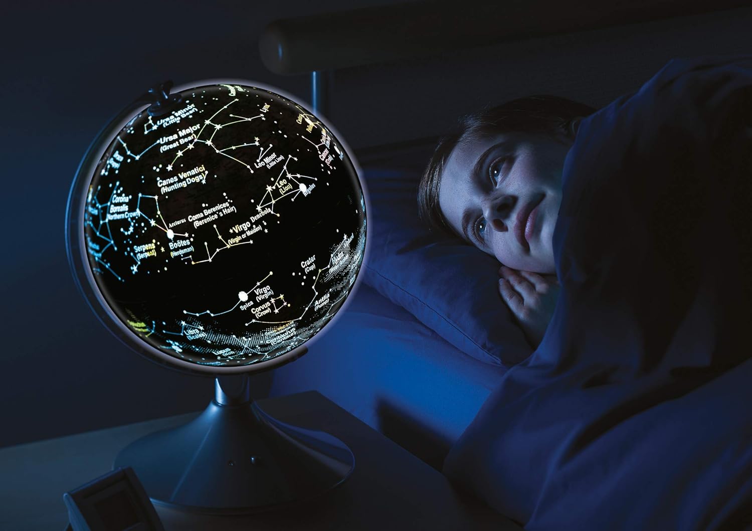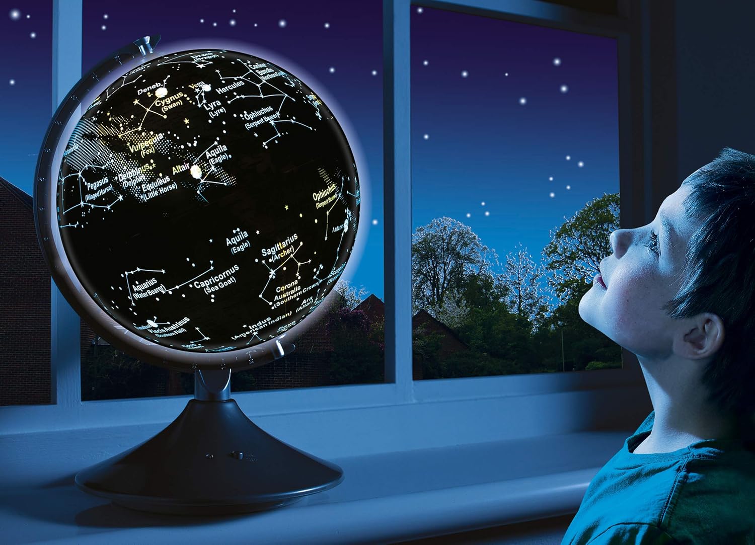 Unique globe shows planet Earth by day and transforms into a constellation globe at night 22.8cm world map showing geographic features by day By night, in a dark room, the illuminated star map shows constellations Light sensor automatically turns globe to night feature when dark Requires 4 x C batteries (not included)