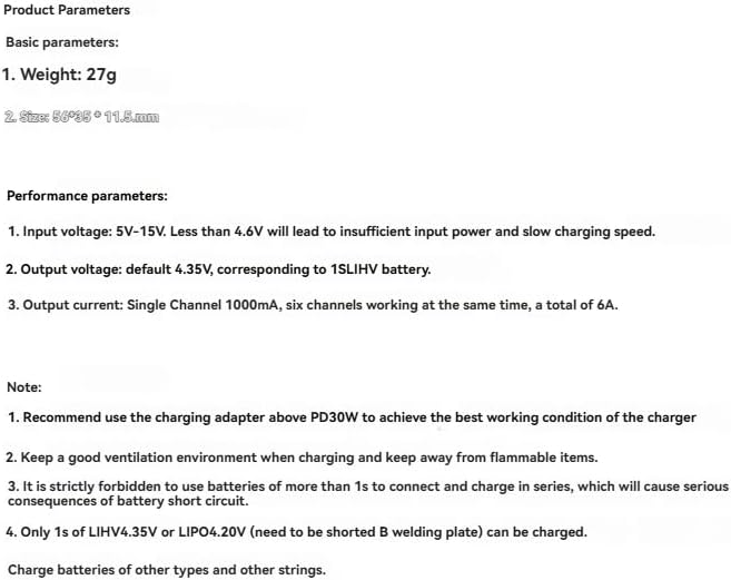 È severamente vietato utilizzare batterie con una durata superiore a 1 secondo in serie per la ricarica, poiché ciò provocherebbe gravi conseguenze di cortocircuito della batteria. Si consiglia di utilizzare un adattatore di ricarica PD 30W o superiore per ottenere le migliori condizioni di funzionamento del caricabatterie Durante la ricarica, è necessario mantenere un ben ventilato e lontani materiali infiammabili. Caricare solo batterie LIHV 4,35 V o LIPO 4,20 V da 1 secondo (che richiedono il cortocircuito del pad B) e non caricare altri tipi o serie di batterie.