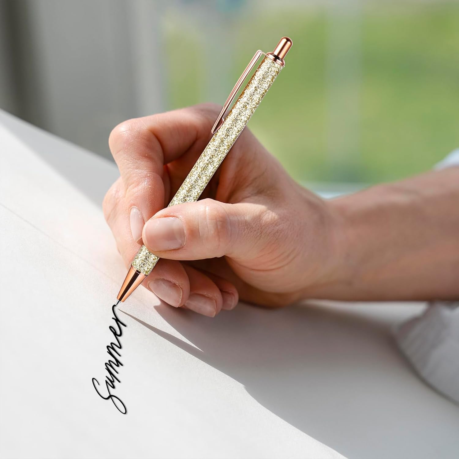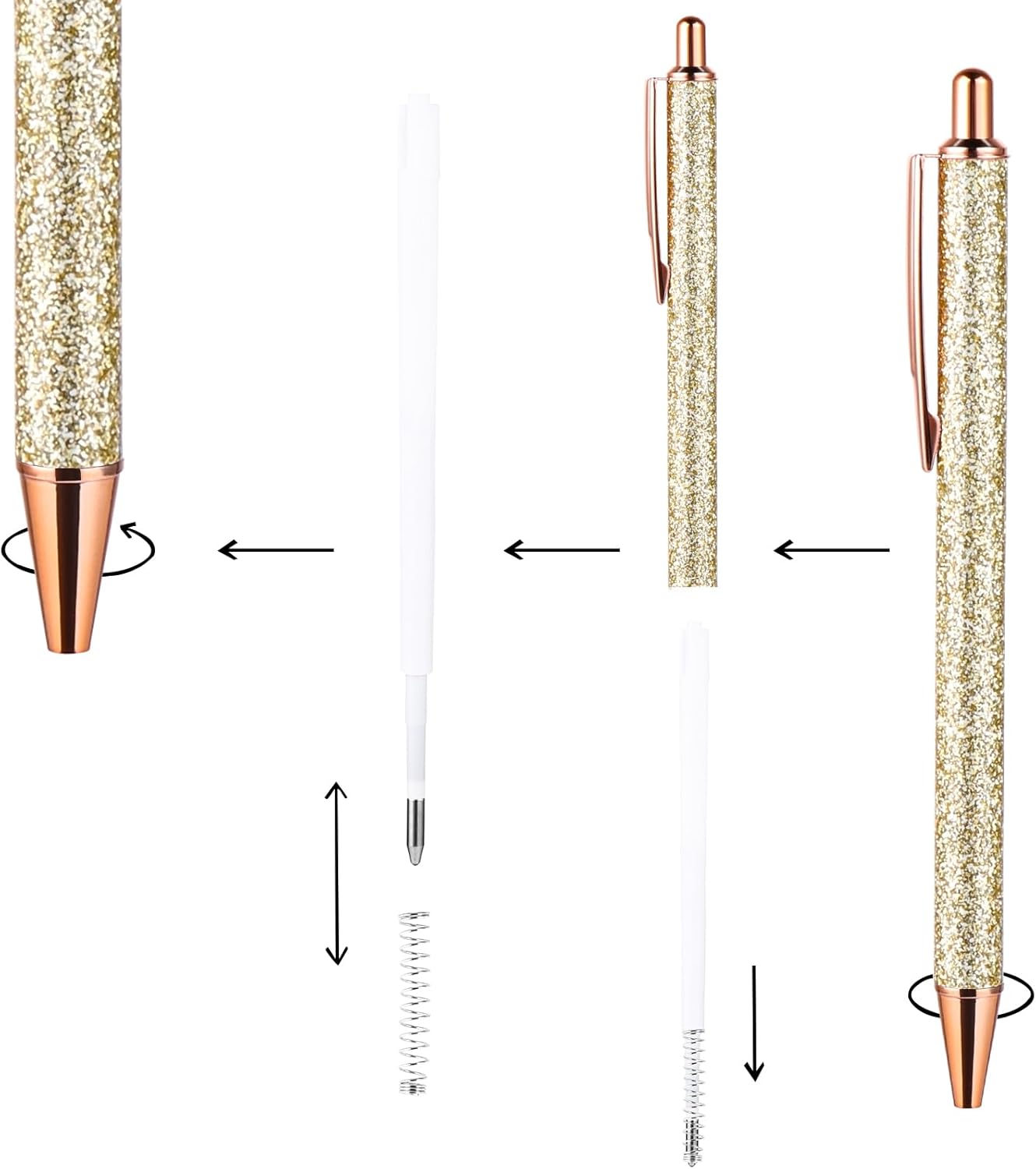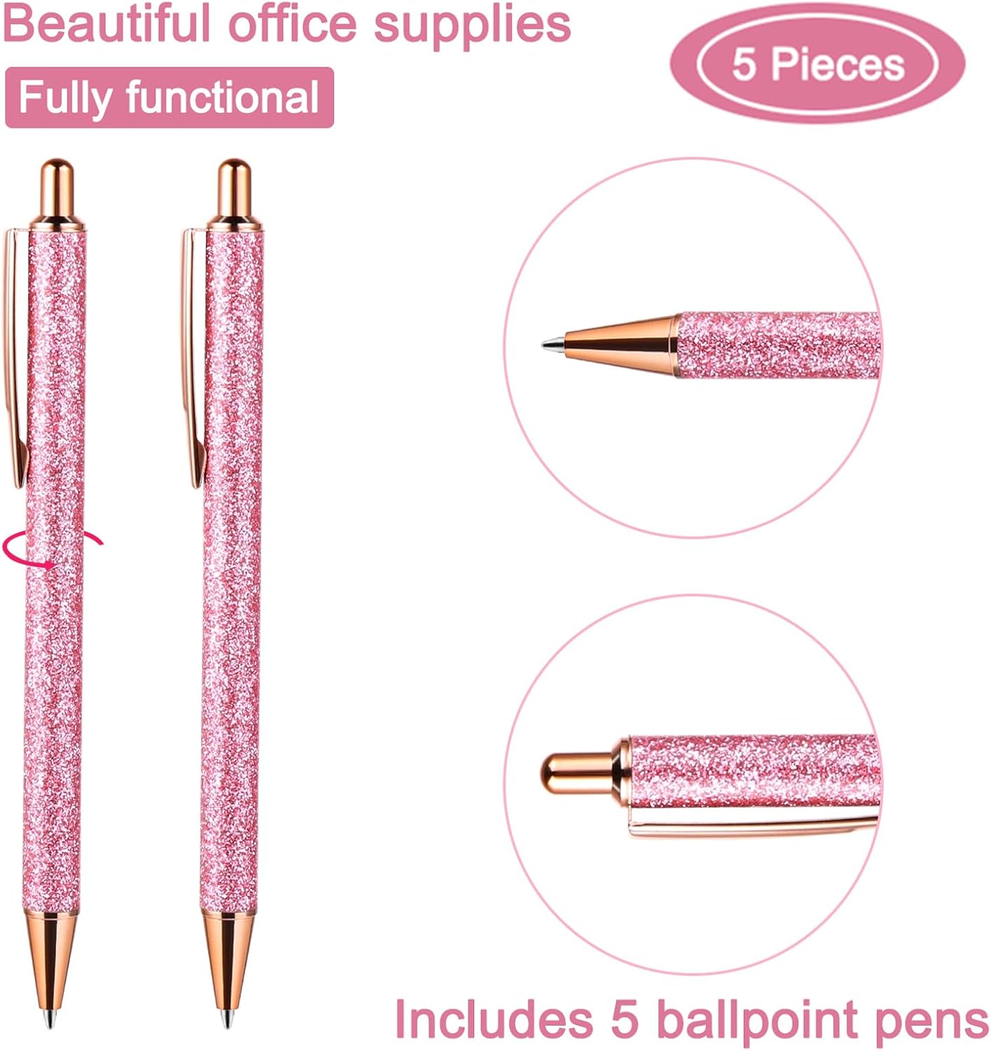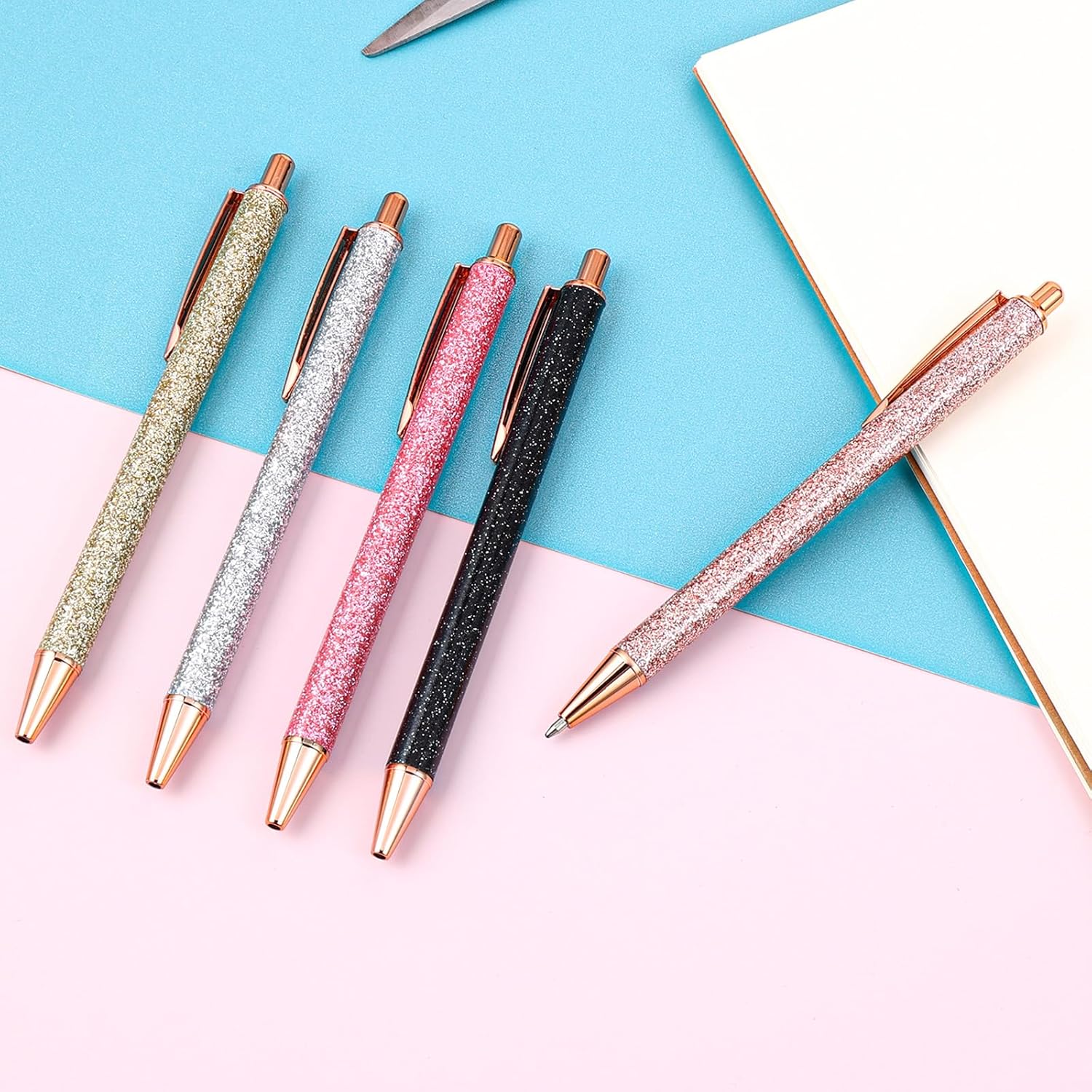 Set di penne a sfera glitterate: questo set contiene 5 penne a sfera glitterate in 5 diversi colori. Penna a sfera glitterata per diversi quaderni per ragazze. La ricca quantità e il design elegante possono soddisfare diverse esigenze di utilizzo e sostituzione nella vostra vita quotidiana e ti fanno sentire più felice durante la scrittura. Materiale di alta qualità: la bella punta a sfera è realizzata in materiale metallico di alta qualità, robusto e affidabile, non ha odore e non facile da rompere e deformare. Le belle matite sono lucidate, hanno una superficie liscia, colori vivaci e non sbiadiscono facilmente. La semplice immagine garantisce un piacere visivo. Un bellissimo accessorio da ufficio di cui puoi fidarti a lungo. Comoda sensazione di scrittura: la penna a sfera in metallo glitterato è piena e pulita, senza deformazioni o macchie. Basta premere sulla parte superiore della penna a sfera retrattile per utilizzarla. In questo modo si scrive senza intoppi e l'inchiostro non penetra facilmente nella carta. Il cappuccio della penna a sfera con glitter si blocca in modo sicuro quando è chiuso, evitando così sbavature e sbavature. Ampia applicazione: che si tratti di scrivere diari, creare budget, prendere appunti, firmare riunioni o eseguire molte altre attività come matrimoni, ricevimenti di nozze, varie feste o ricordi quotidiani e pianificazioni, queste penne a sfera possono rivelarsi utili. Splendida penna squisita. Può essere utilizzato anche come decorazione per la vostra stanza o per i vostri vestiti, adatto per la scuola, l'ufficio e la casa. Regalo perfetto: Click retractable ballpoint pens, perfetto per amici d'ufficio, matrimoni, addii al celibato, feste di compleanno o qualsiasi pubblico di moda. Questa bella penna a sfera può essere regalata come regalo di compleanno, regalo di Natale o regalo per adulti ai vostri compagni di classe, colleghi, insegnanti, amici e familiari.